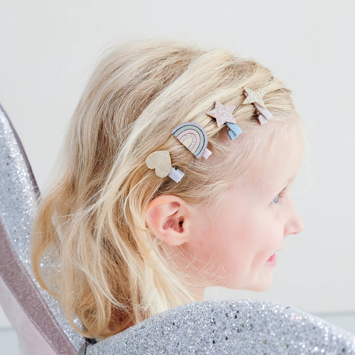 Dreamer Over The Rainbow Hair Clip Set by Mimi & Lula. We adore this cheerful little pack of clips! Two super sweet and sparkly rainbows in the dreamiest colour palette plus two shooting stars with a rainbow trail of grosgrain ribbon!