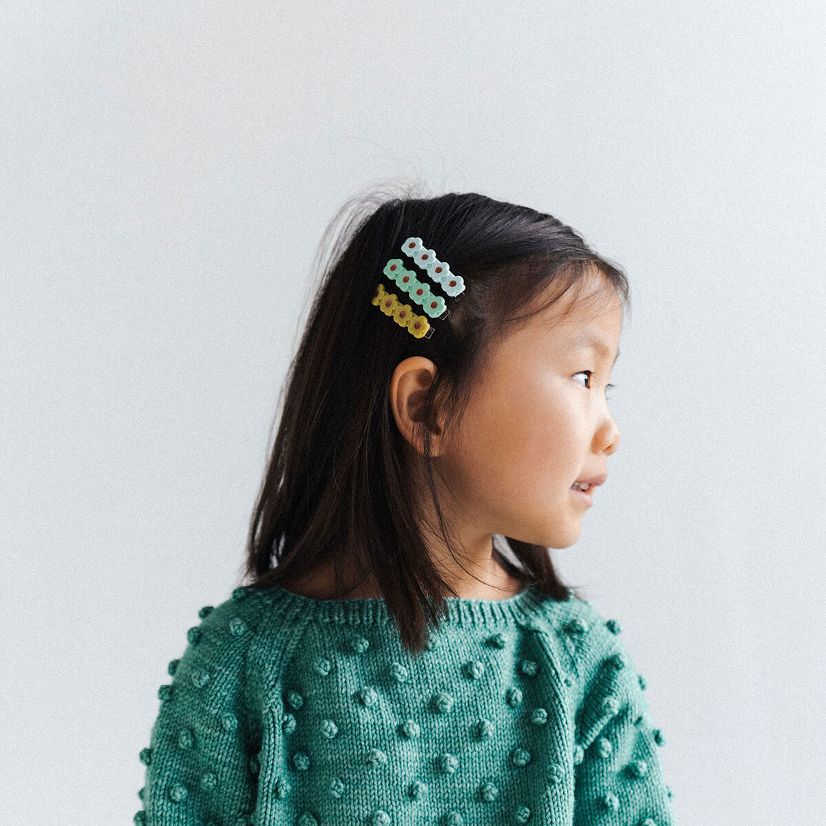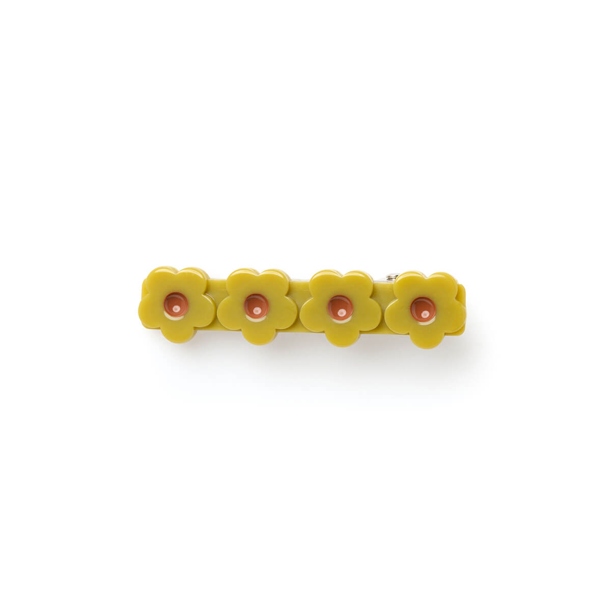 Flower Hair Clip by Wunderkin Co. Four flower bar hair clip. Handmade in France, this flower clip is made from plant-based eco-friendly cellulose acetate set onto a silver tone crocodile clip. Perfect for holding back stray hairs and fringes. Wear individually or combine two or three clips at the same time.