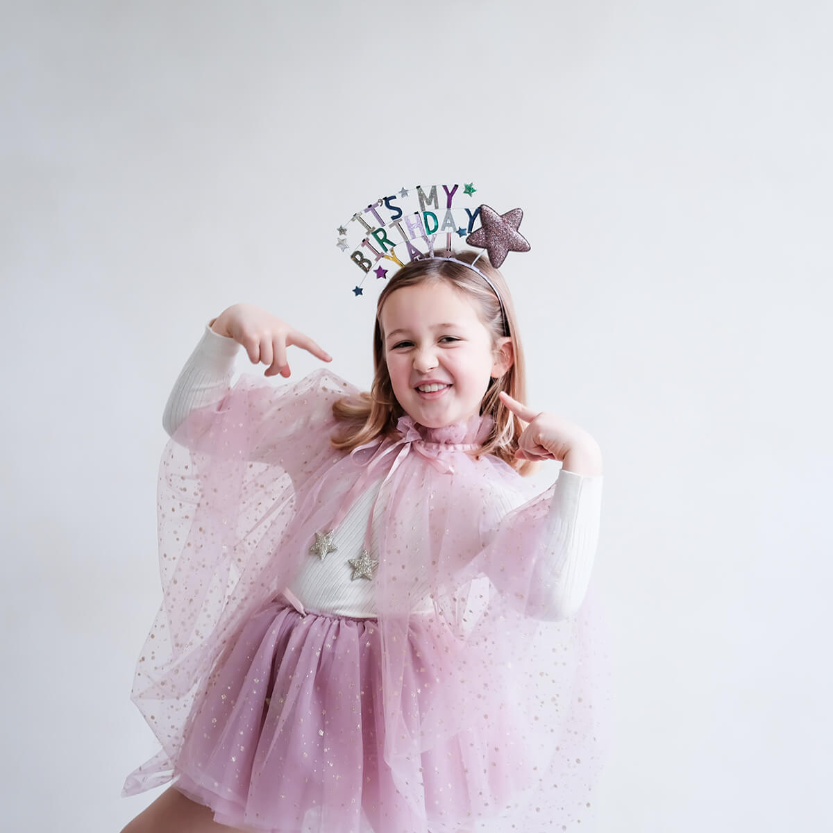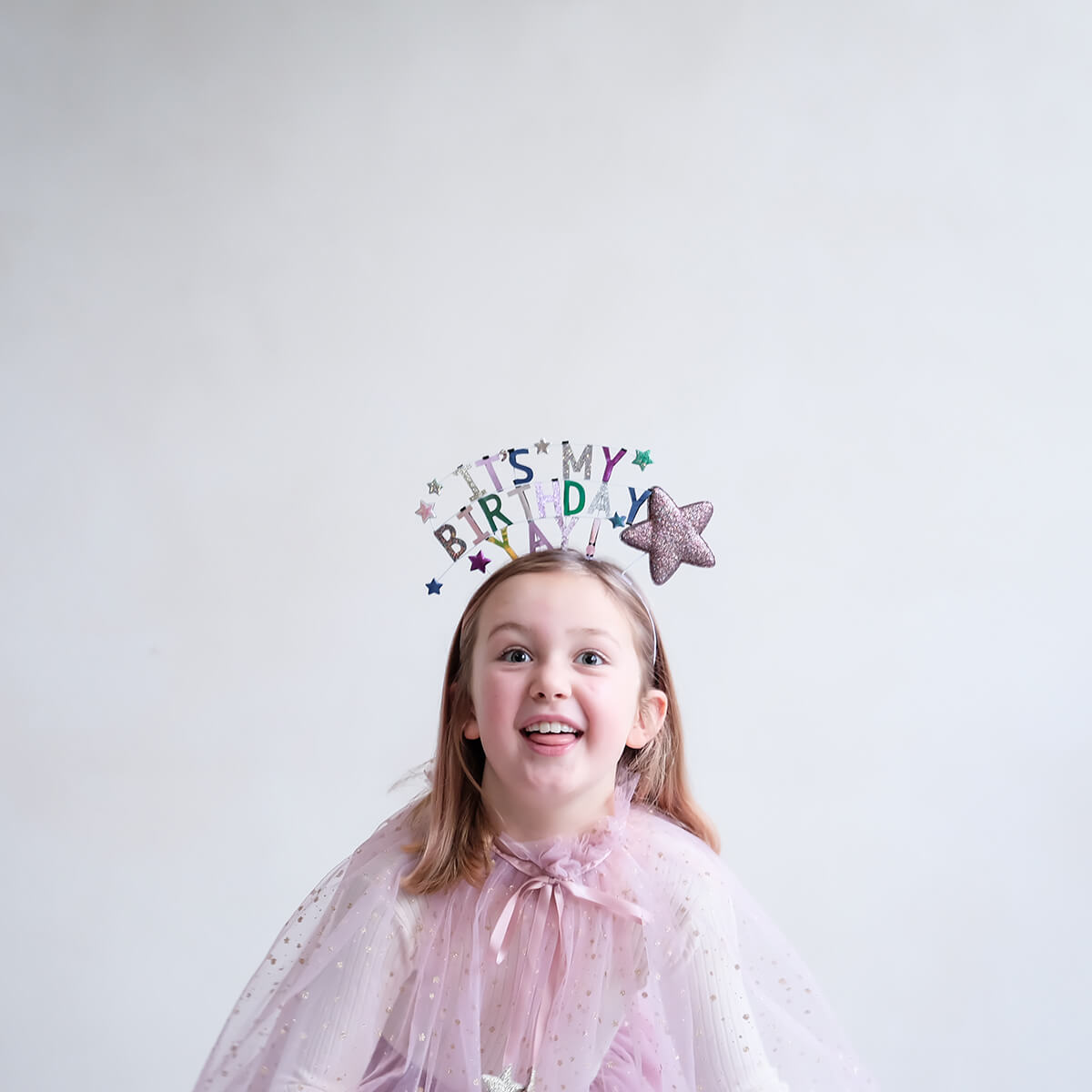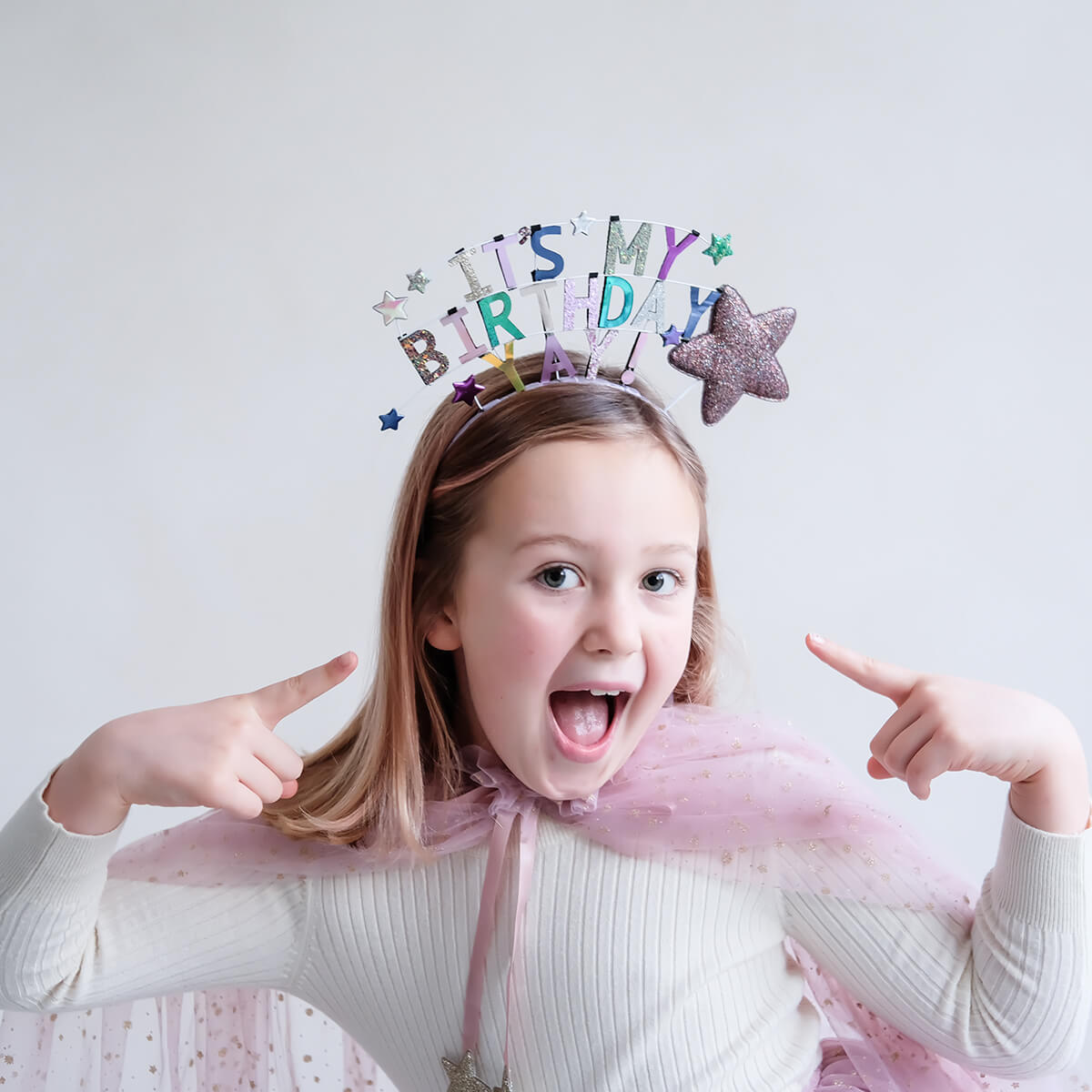 It's My Birthday headdress by Mimi & Lula. This fabulous Birthday headdress is bound to make them feel ultra special and sparkly on their big day. The decoration height measures approximately 10cm and features a combination of shimmering metallic and glitter fabrics on a ribbon wrapped alice band.