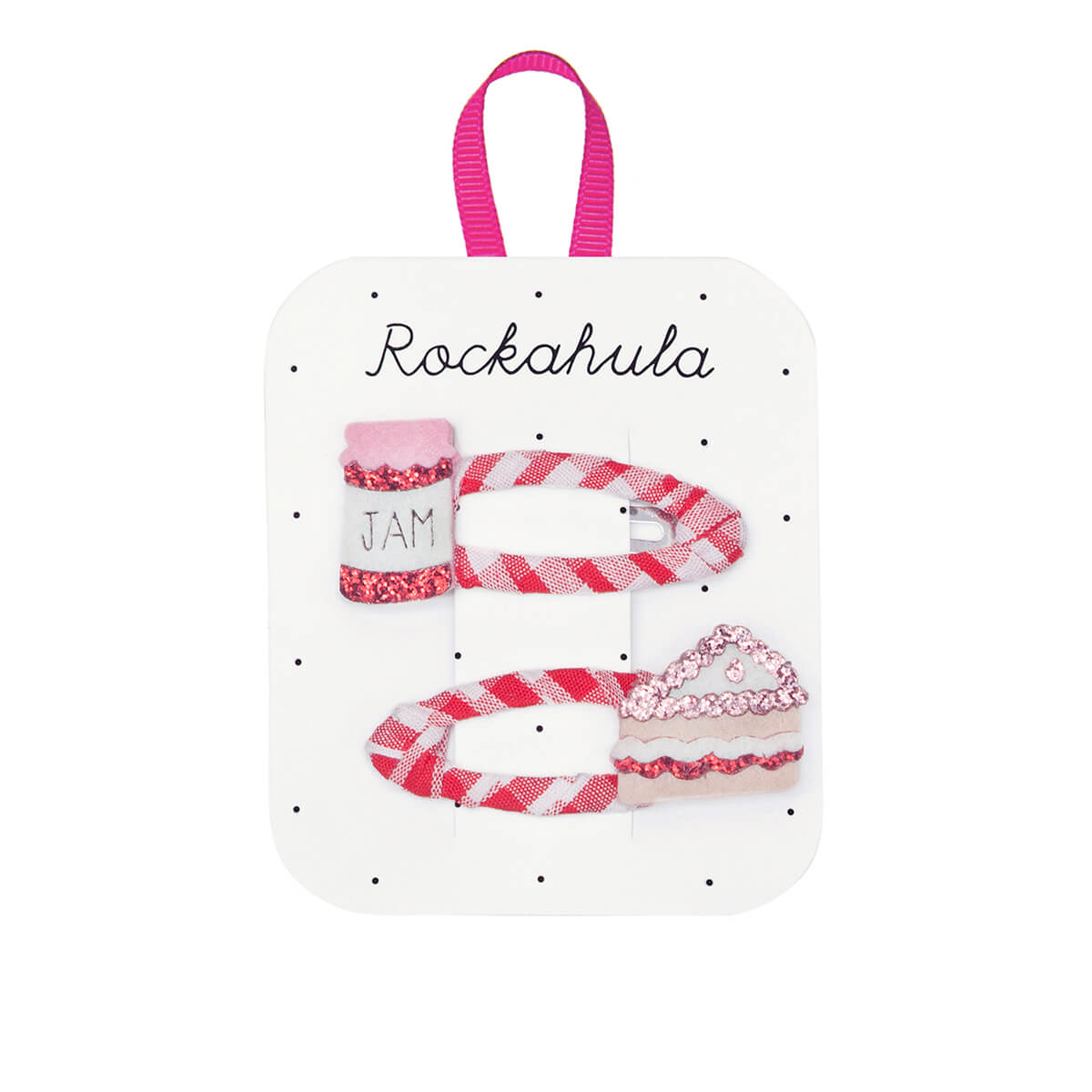 Jam And Cake Gingham hair clips by Rockahula Kids. Cake is the answer, no matter the question! This pack of two sweet clips feature a jar of glittery jam and a slice of delicious cake. Each secured to a spotty grosgrain ribbon wrapped snap clip, these are the perfect clips for an afternoon picnic in the sun.