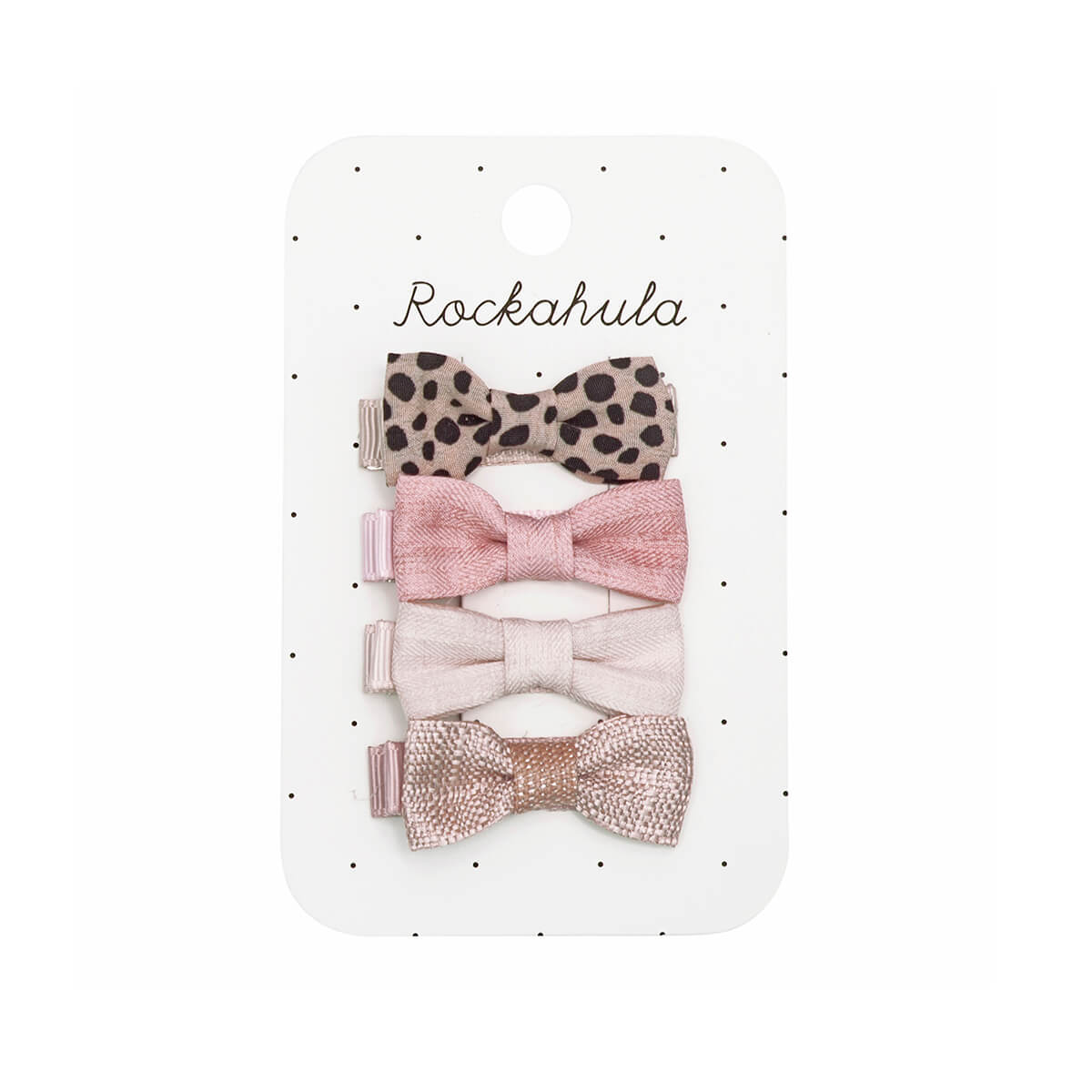 Leopard mini bow hair clips by Rockahula Kids. This set of mini bow clips is made from a palette of gorgeous dusky colours, including print, soft pink satin, glittery gold and soft pink linen. Each base clip is covered in soft grosgrain ribbon.