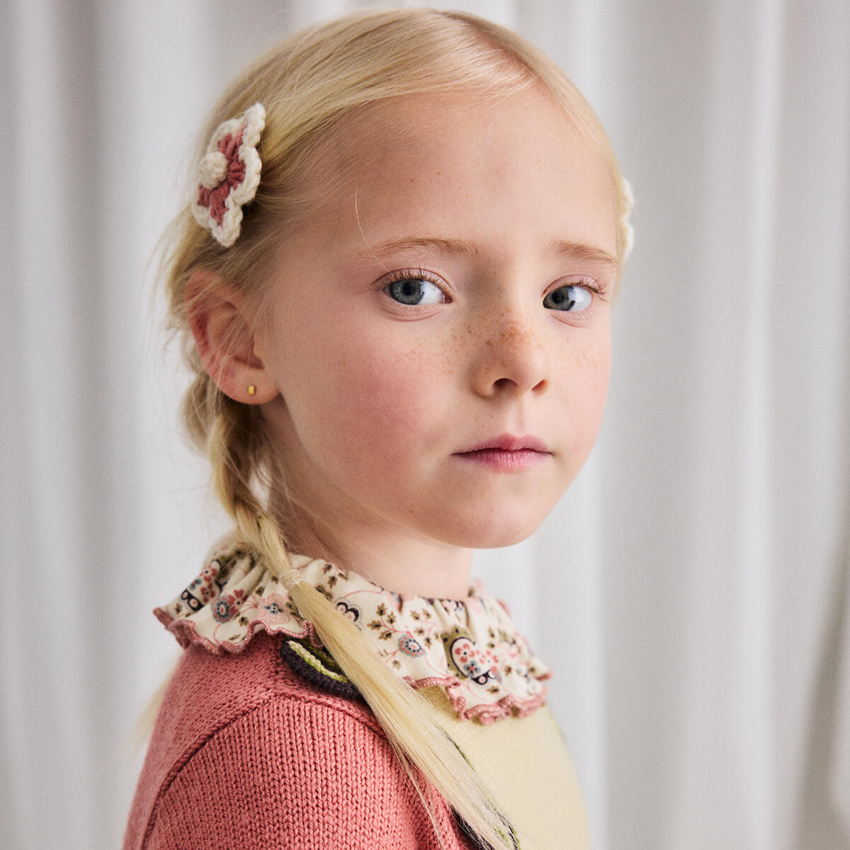 Medium Flower Clip Set by Misha & Puff. A hand-crocheted flower clip set in Merino wool, mounted on alligator clips. A little pop of embellishment for any look.