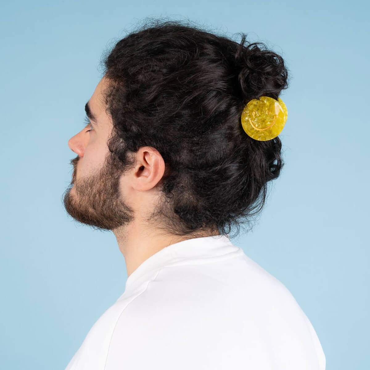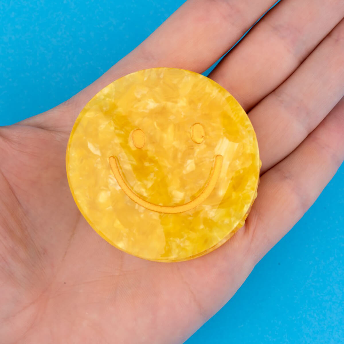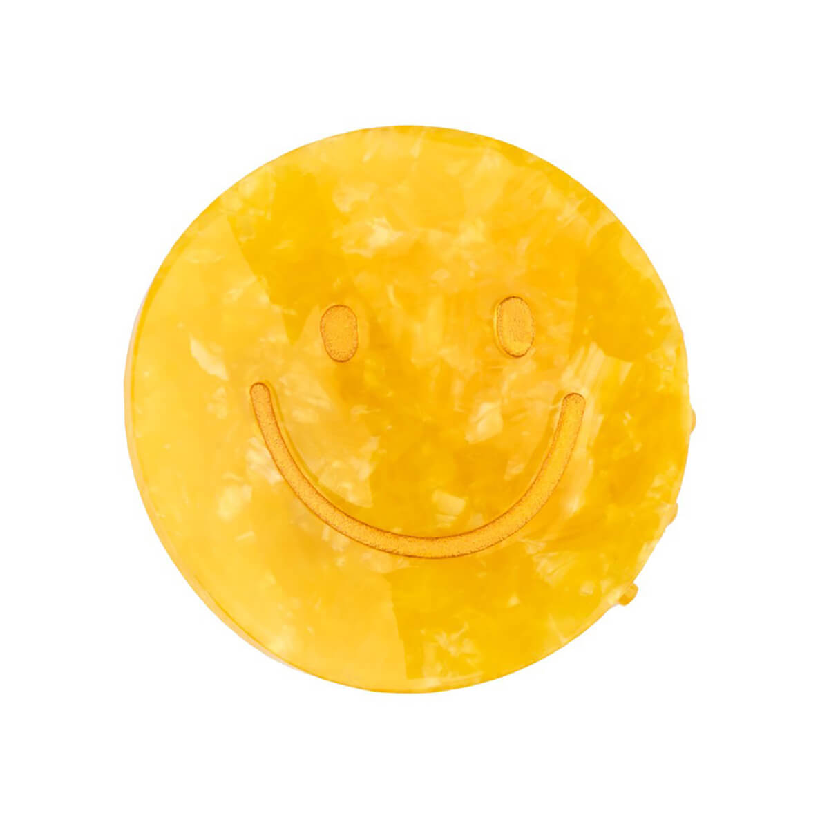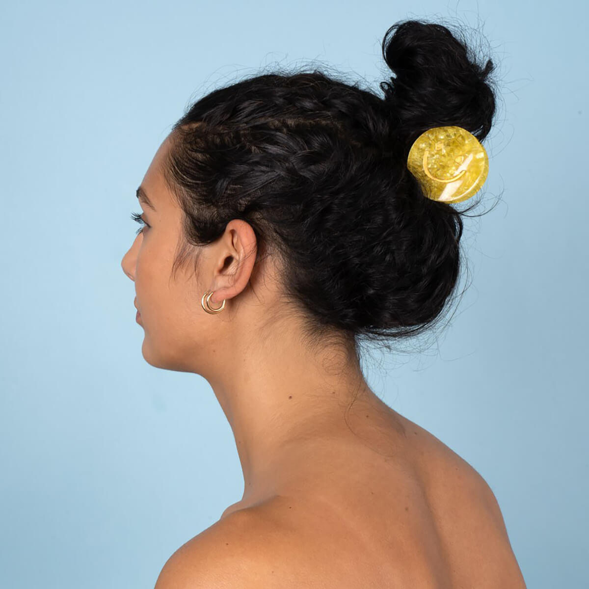 Yellow smiley hair claw by Coucou Suzette. A tribute to the good old smiley face, the official 90s good mood symbol. This is a lovely full acetate hair claw in pearly yellow with gold details. Made from plant-based eco-friendly cellulose acetate.