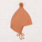 Pointy Peak Hat by Misha & Puff. A hand-knit hat in Merino wool, with ear flaps, a stand-up pointy pom-pom top, and popcorn tie closure for a secure fit.