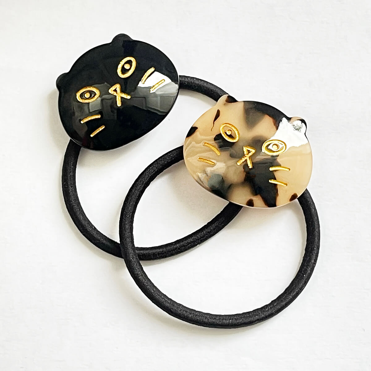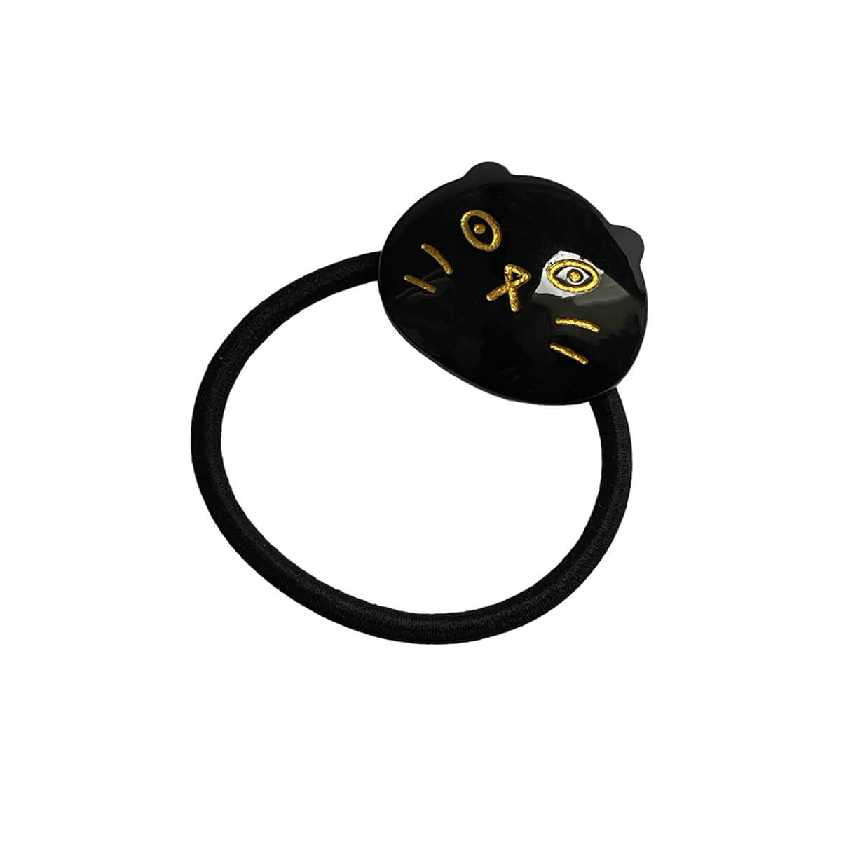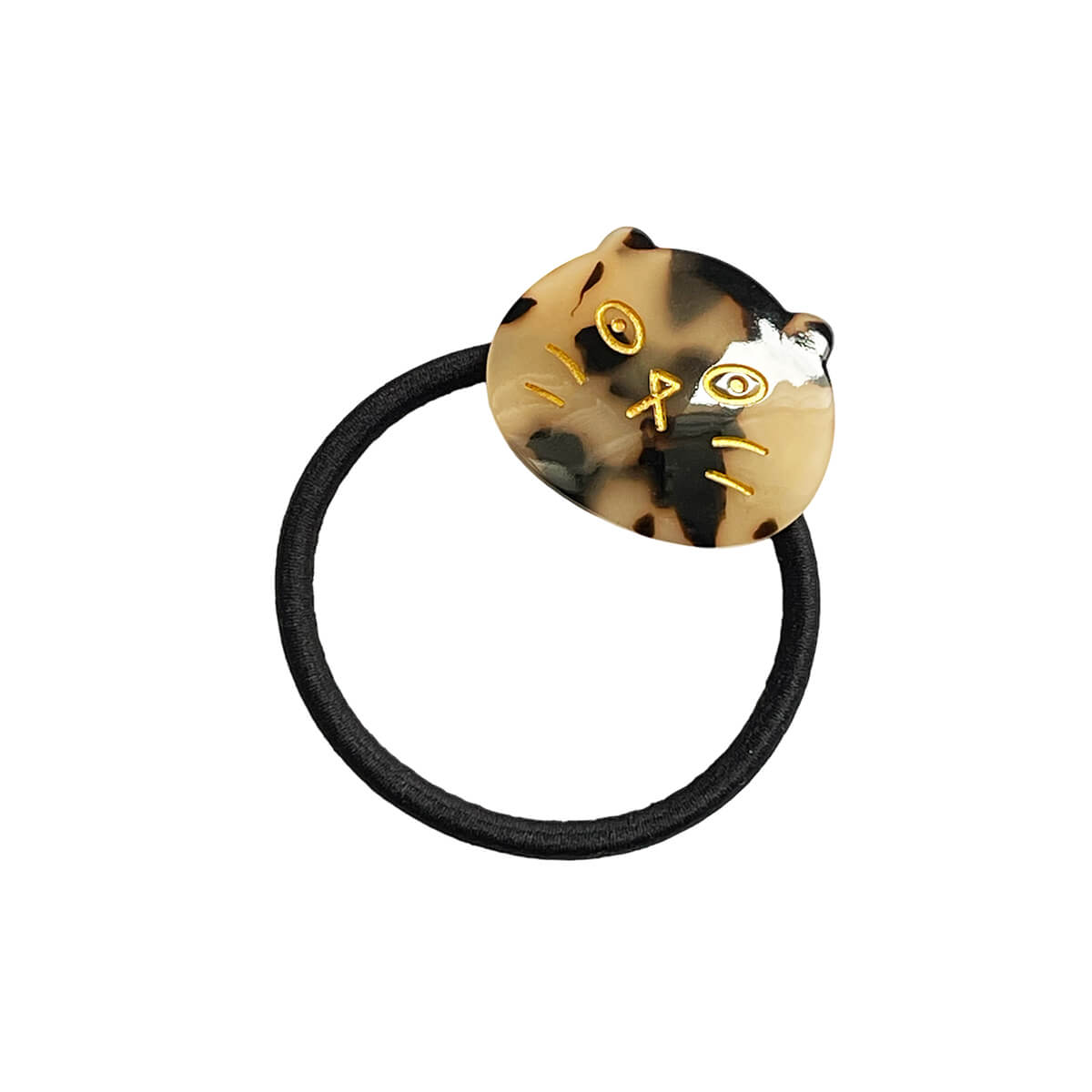 Kitty hair band by Hello Sakura. Full acetate pretty little cat hair bobble with gold details on a black satin covered hair elastic. Made from plant-based eco-friendly cellulose acetate.