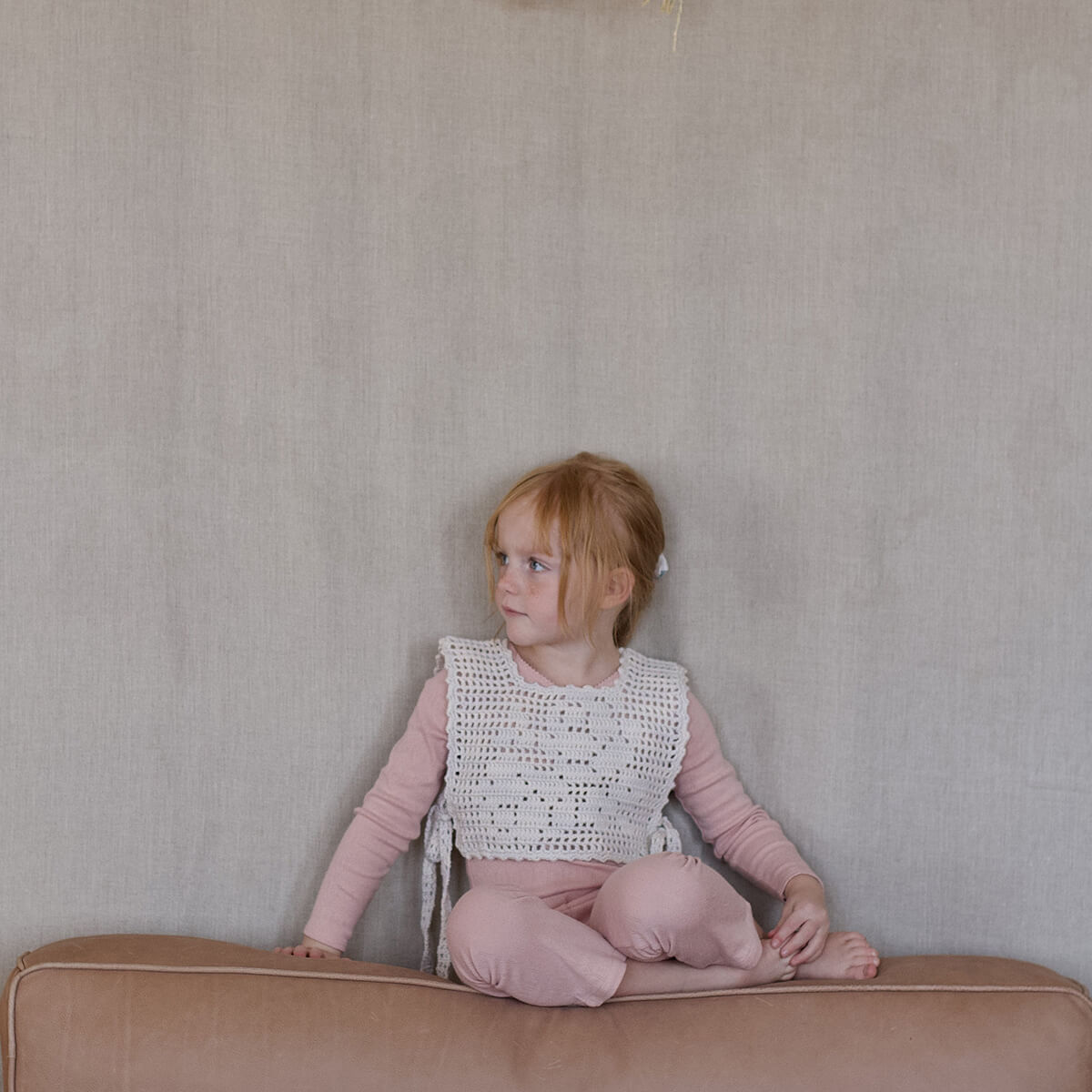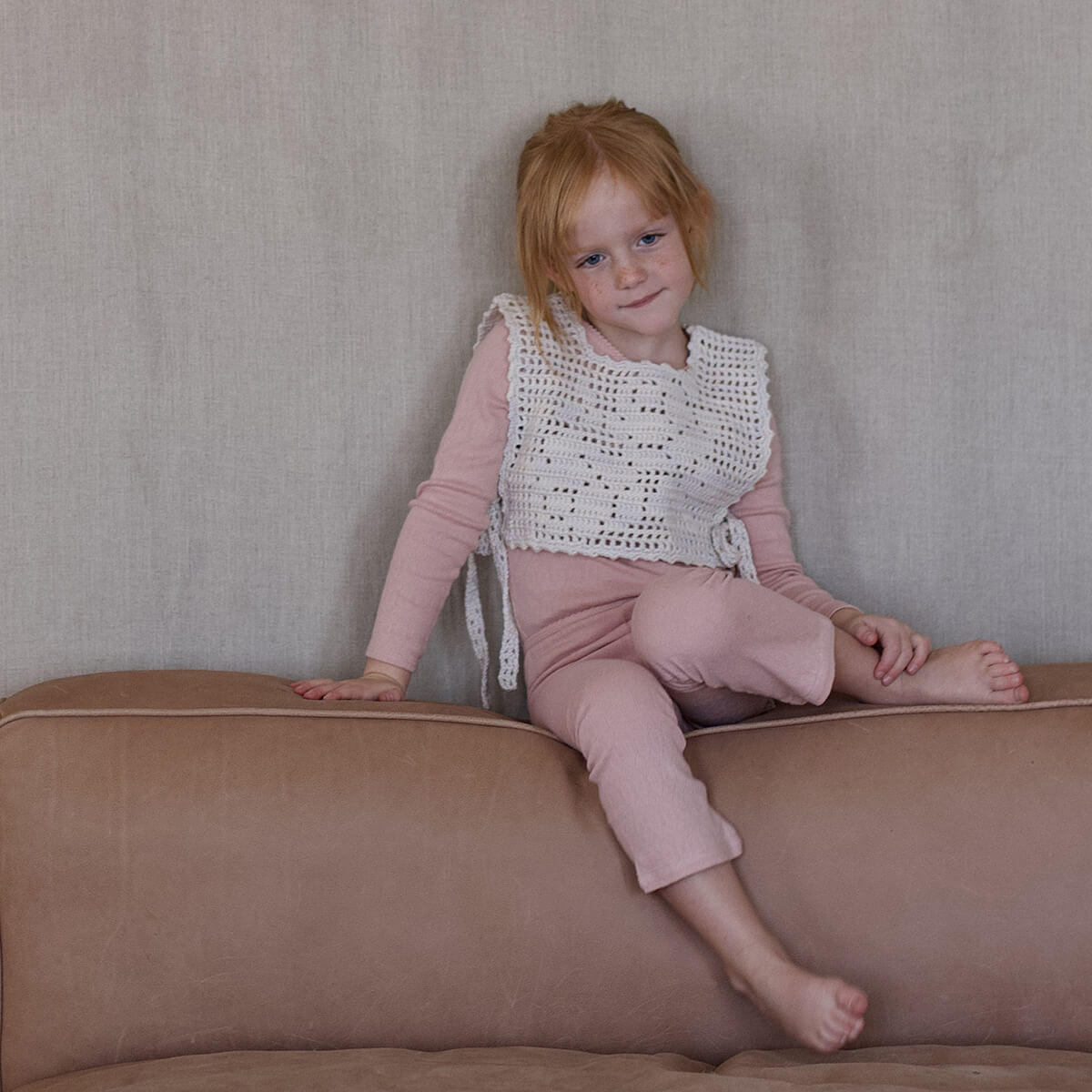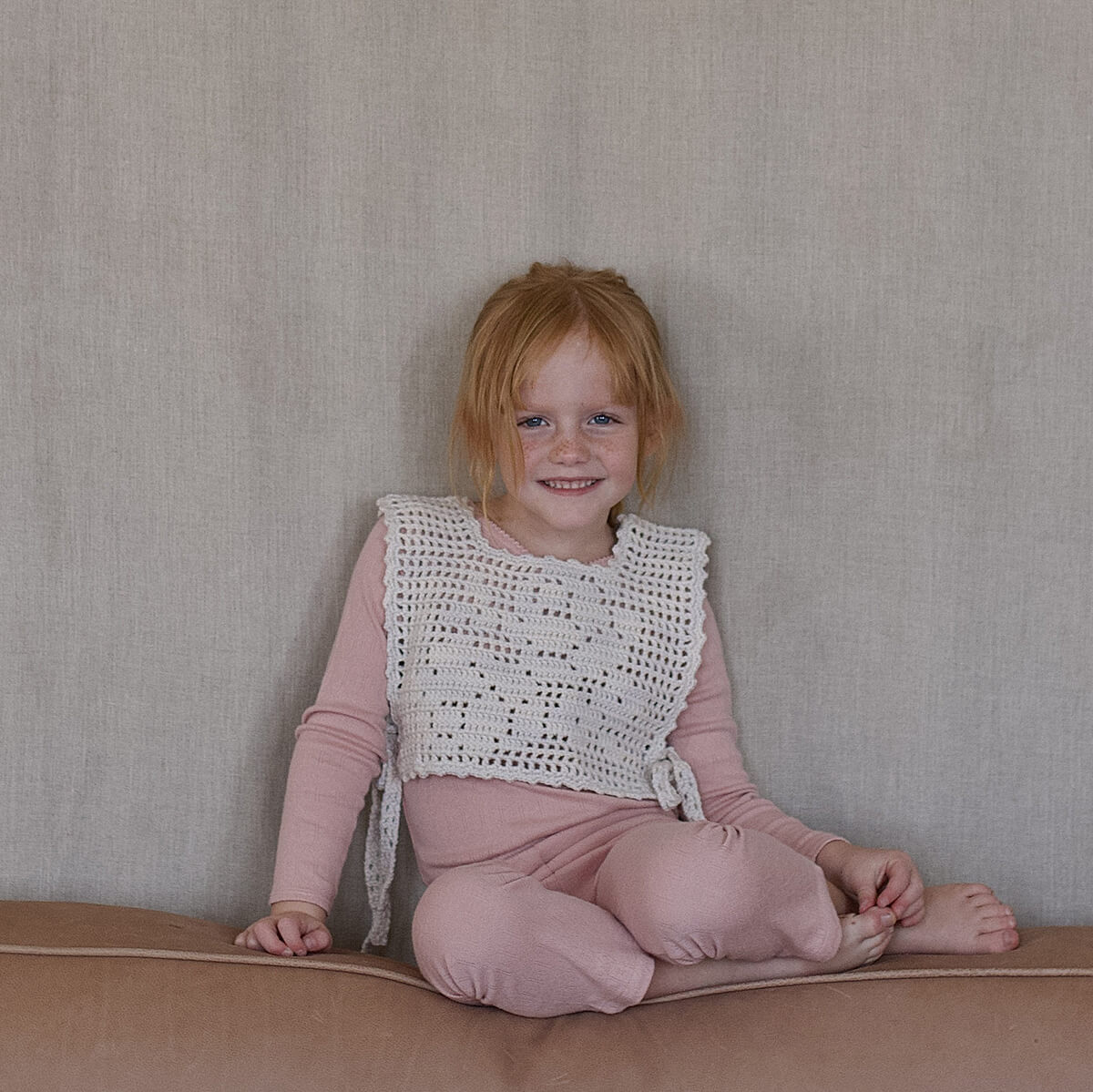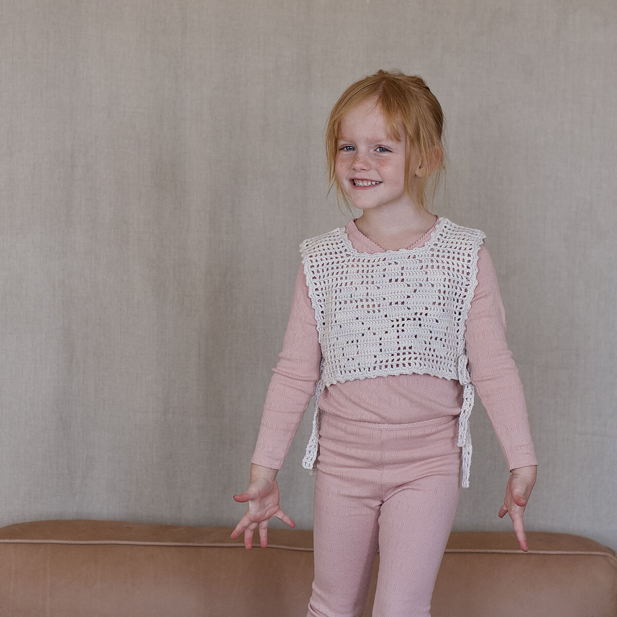Rose crochet pinny vest by Iver & Isla. A sweet crochet vest with ties at the side.