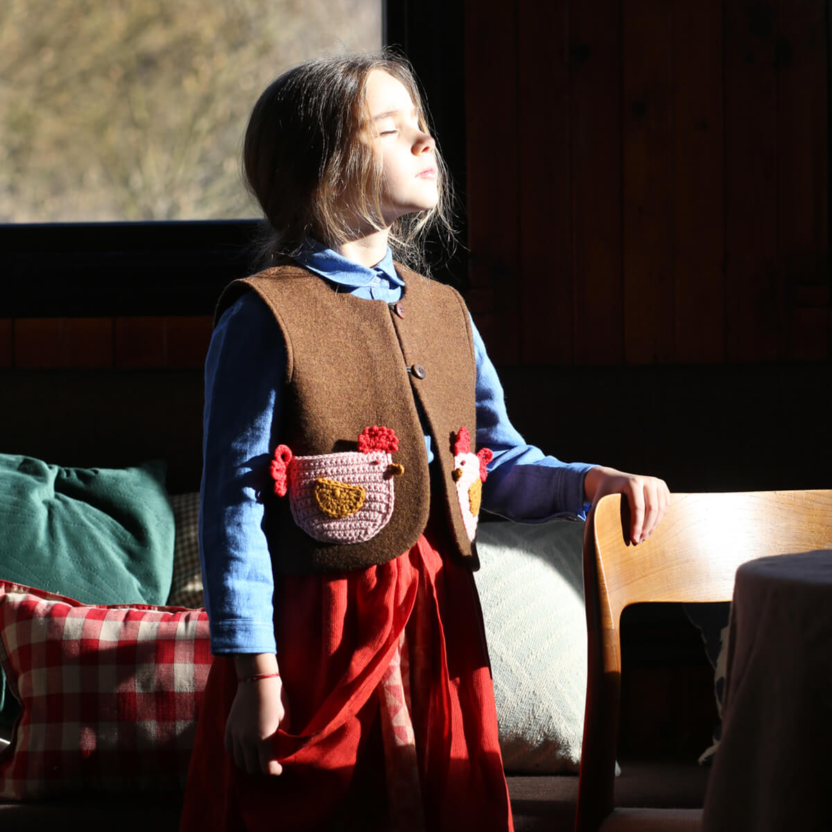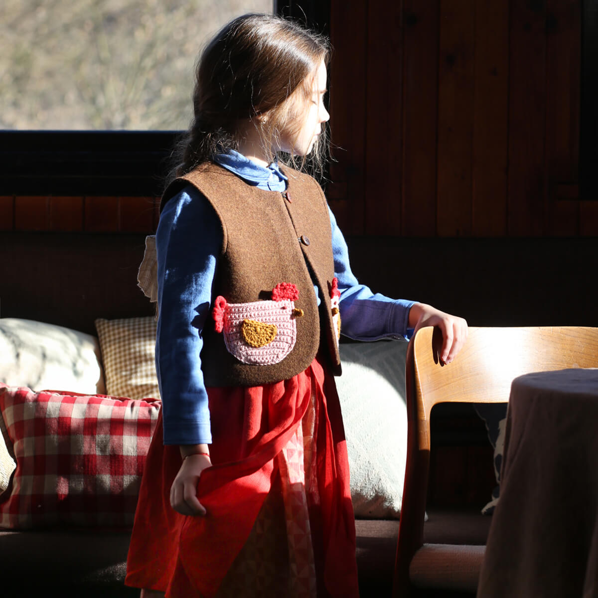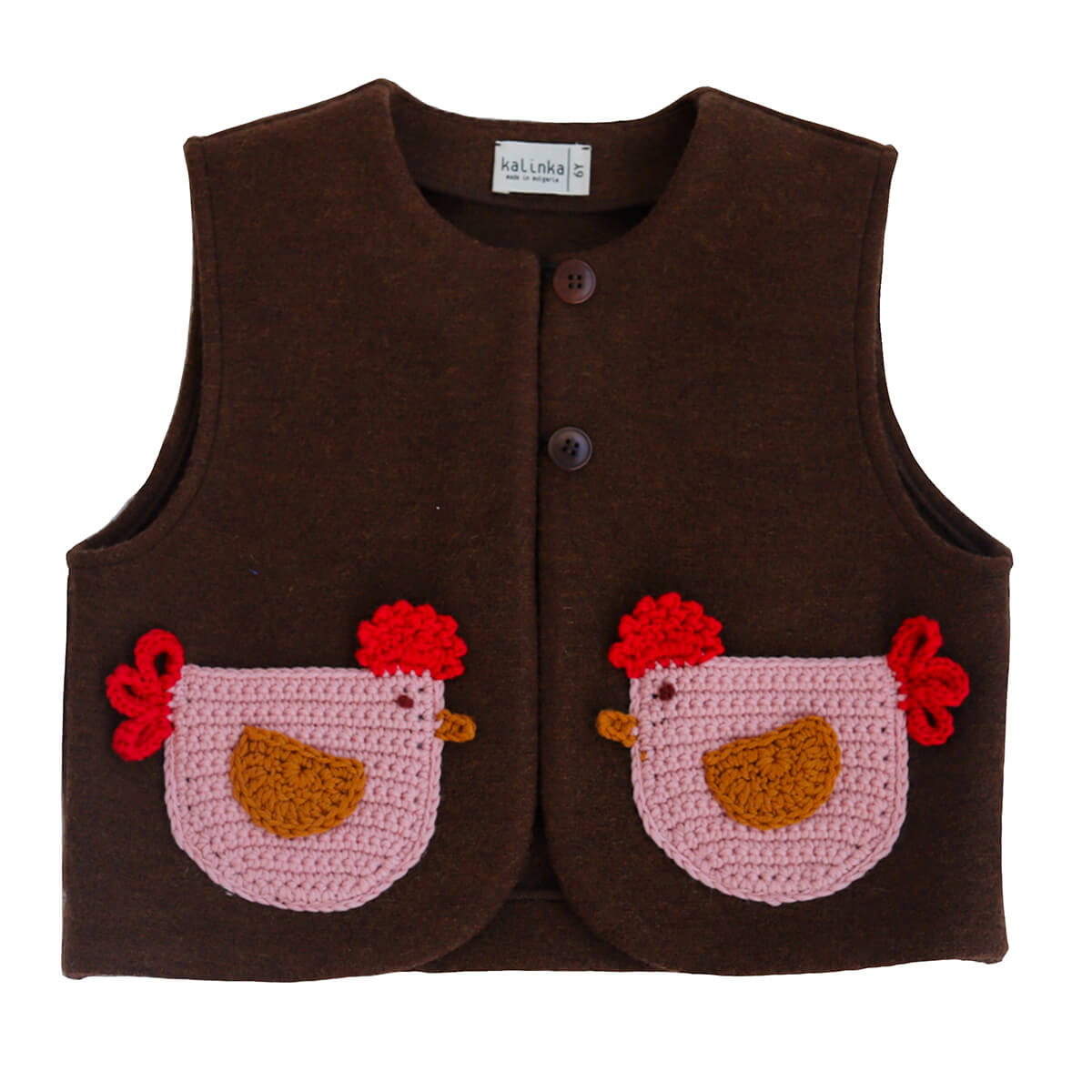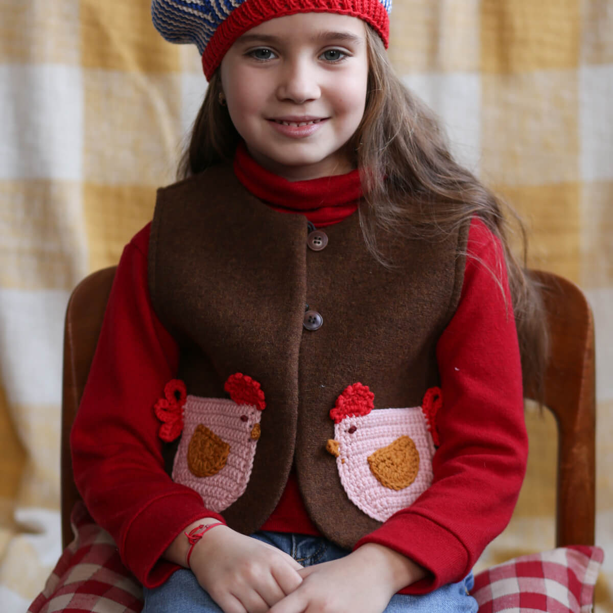 Caspian Chicken Vest by Kalinka. A felted wool sleevless cardigan with adorable chicken pockets.
