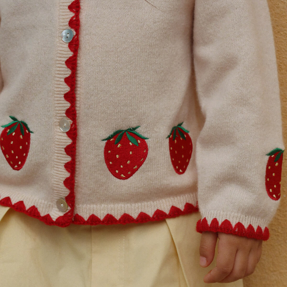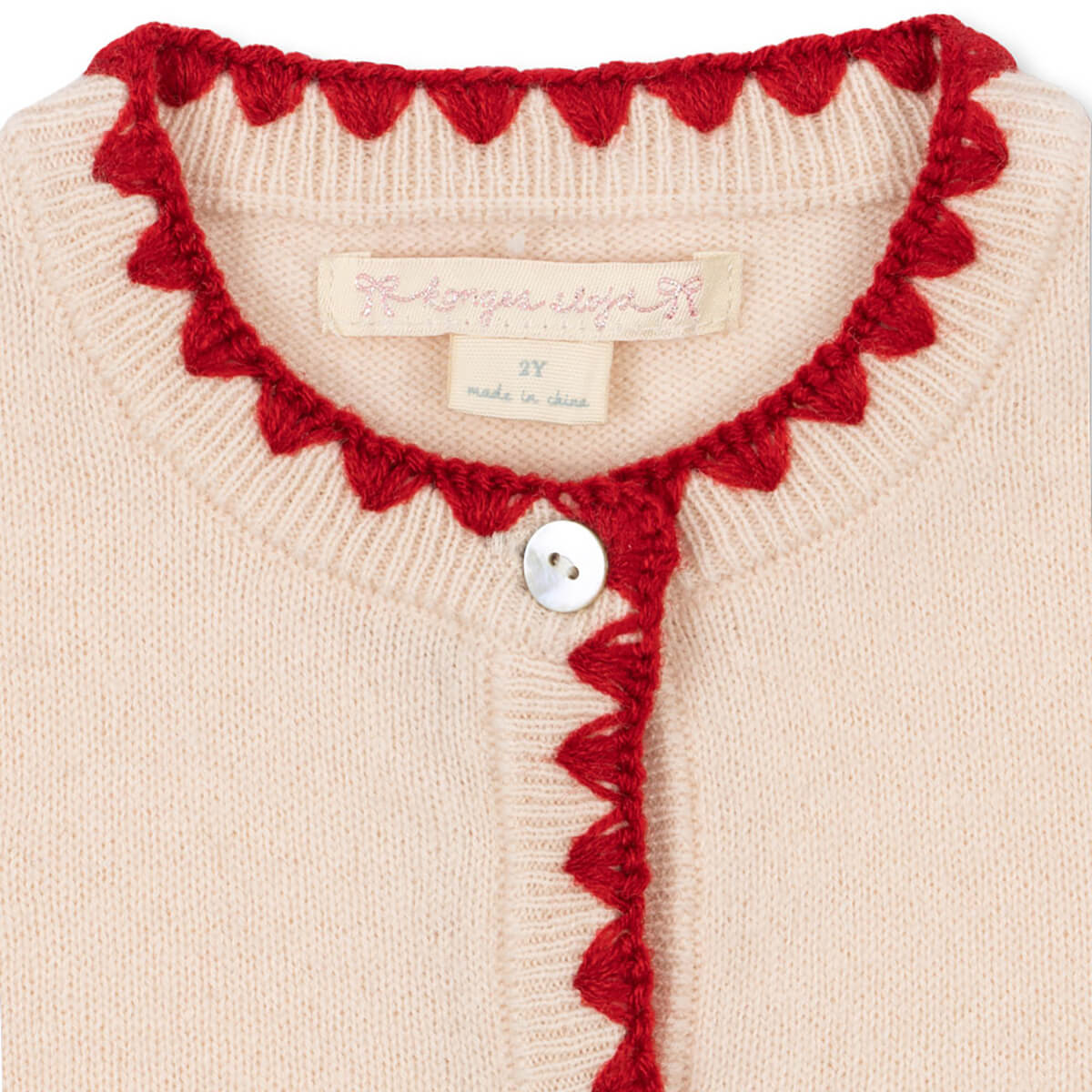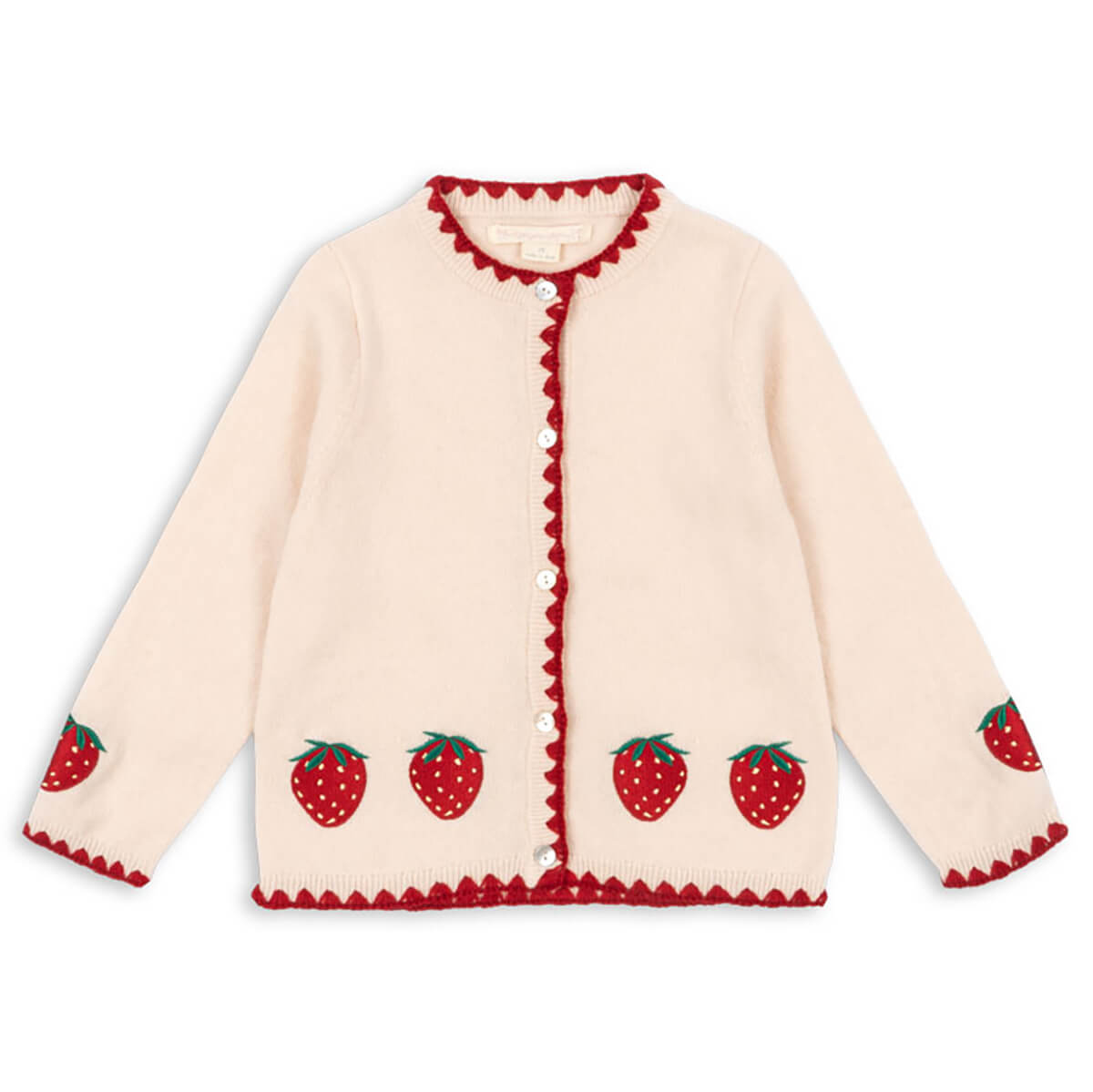 Collette Cardigan by Konges Sløjd. Collette is an exceptionally soft knitted cardigan finished with delicate strawberry embroidery and contrast fabric along the edges. Closes with mother of pearl buttons in front. Made from 100% wool.