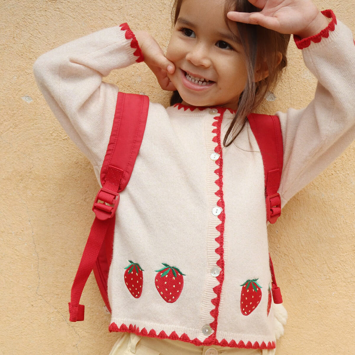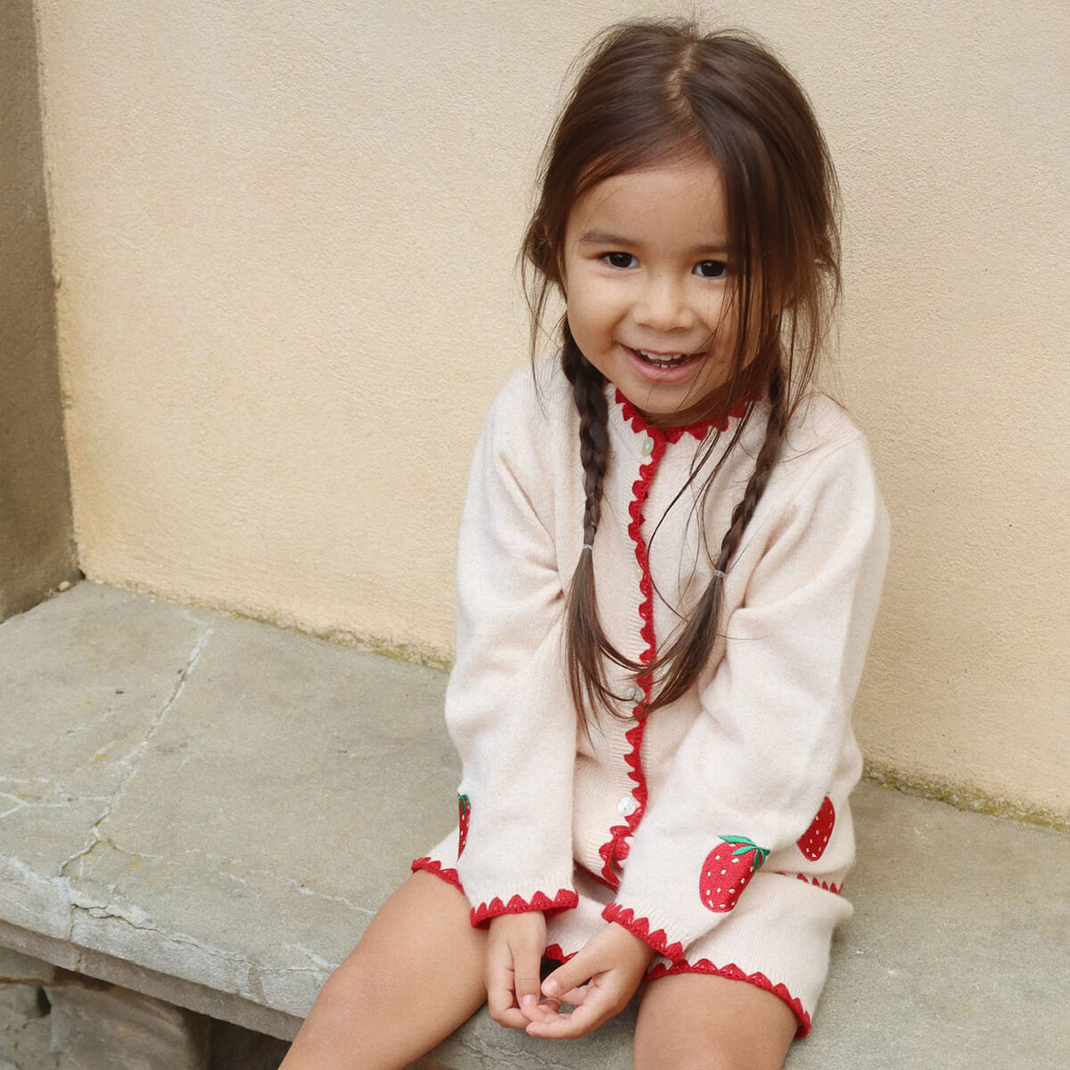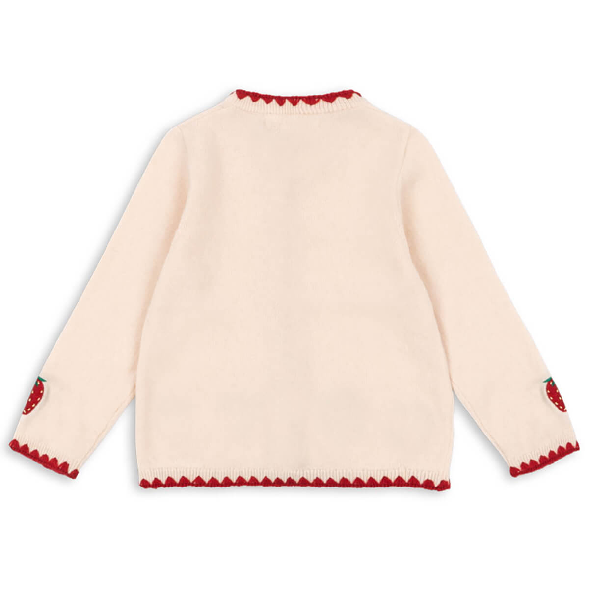 Collette Cardigan by Konges Sløjd. Collette is an exceptionally soft knitted cardigan finished with delicate strawberry embroidery and contrast fabric along the edges. Closes with mother of pearl buttons in front. Made from 100% wool.