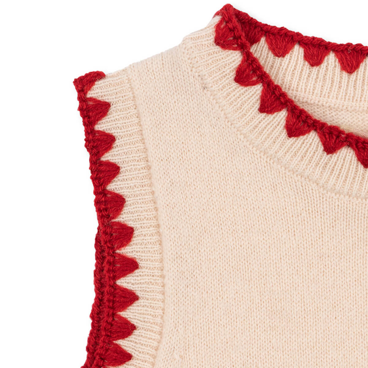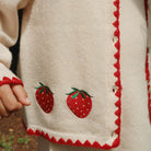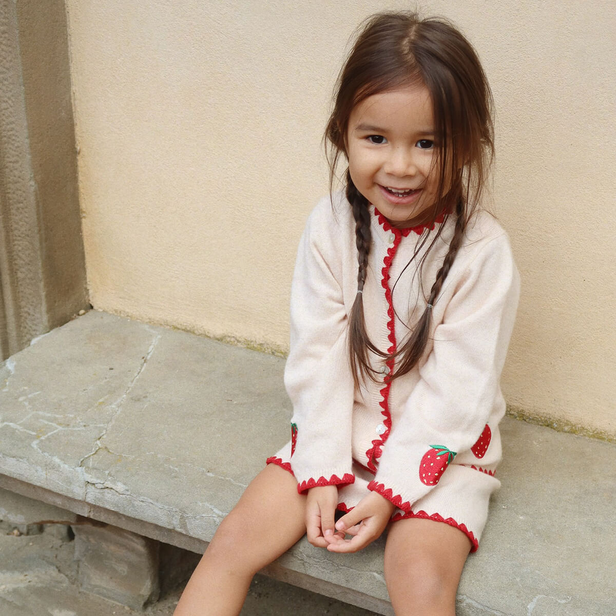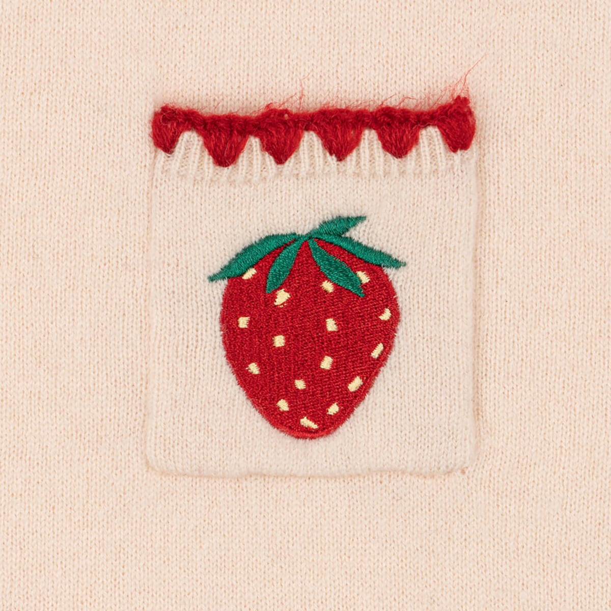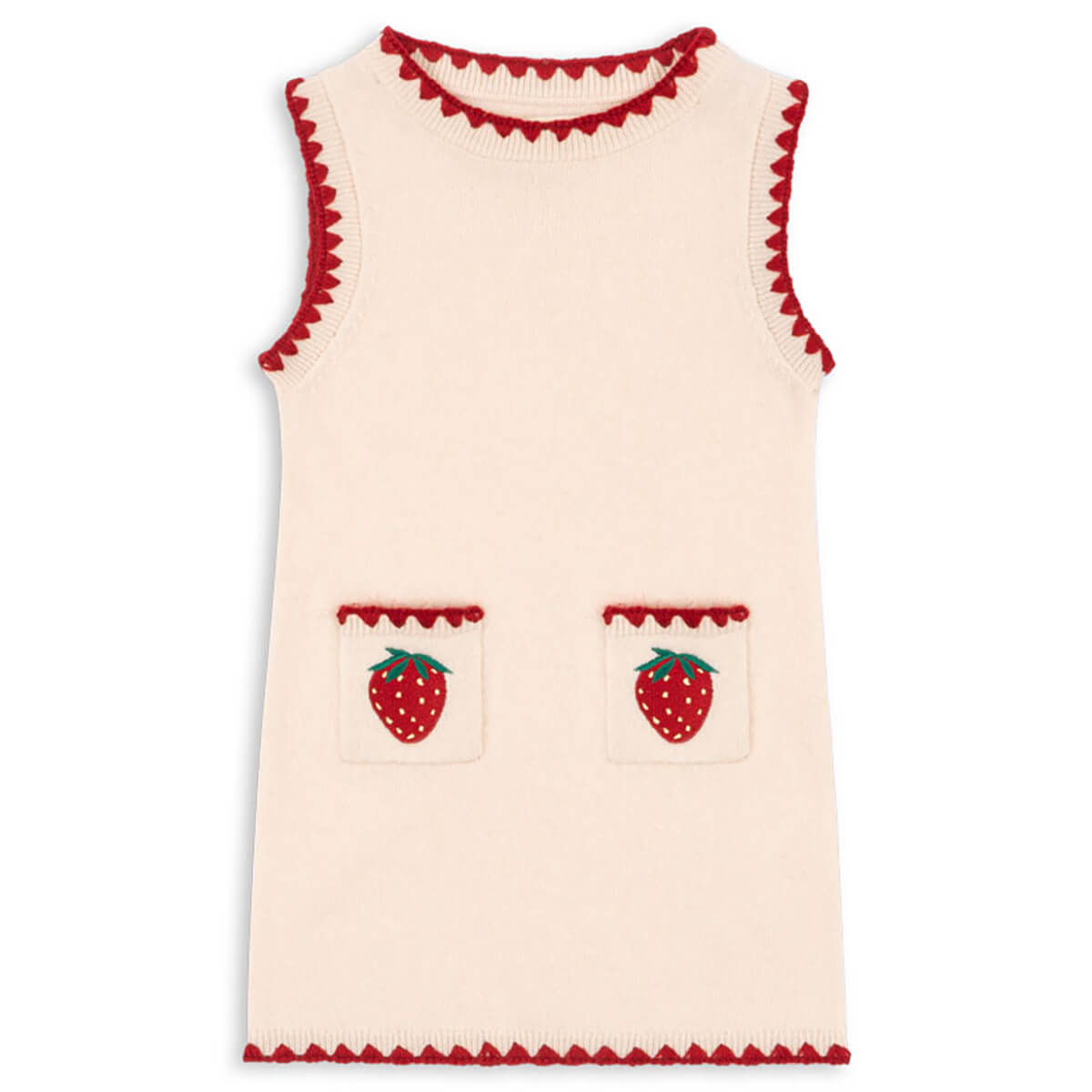 Collette Dress by Konges Sløjd. Knitted wool dress in an exceptionally soft and comfy quality with delicate strawberry embroidery. Designed with front patch pockets and a straight, fitted silhouette. Made from 100% wool.
