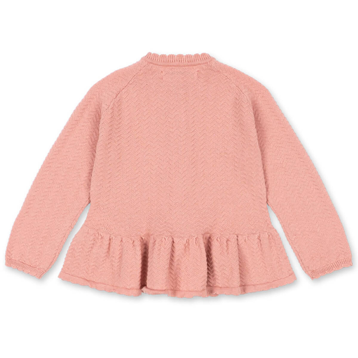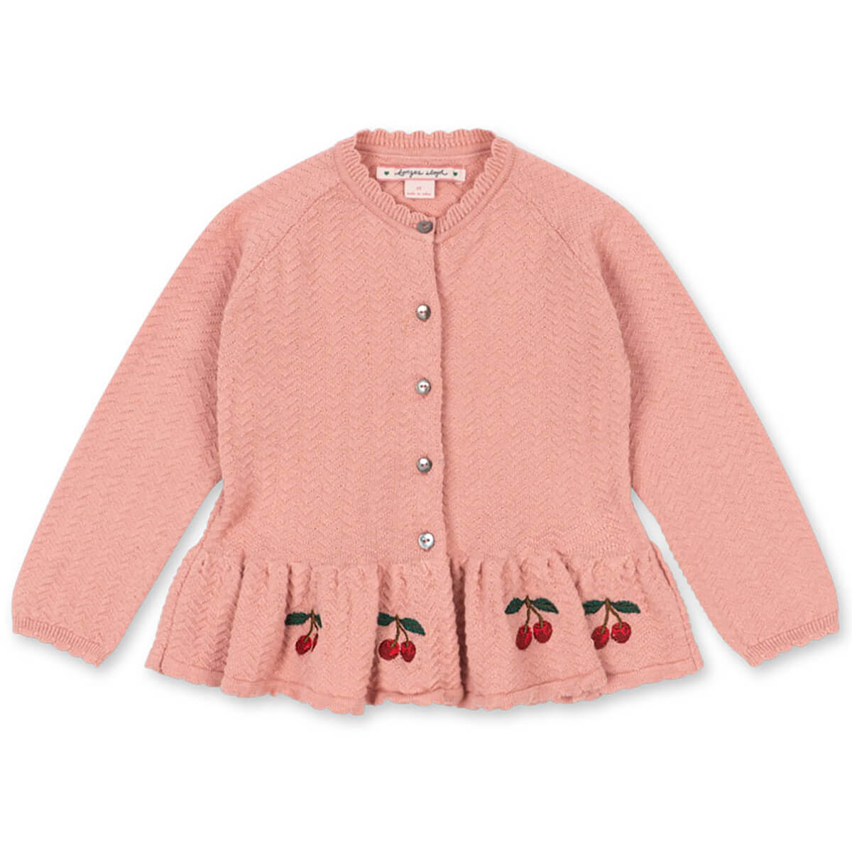 Cypres Cardigan by Konges Sløjd. Knitted cotton cardigan with mother of pearl buttons in the front. Designed with a loose peplum silhouette and a wavy scallop knitting pattern.