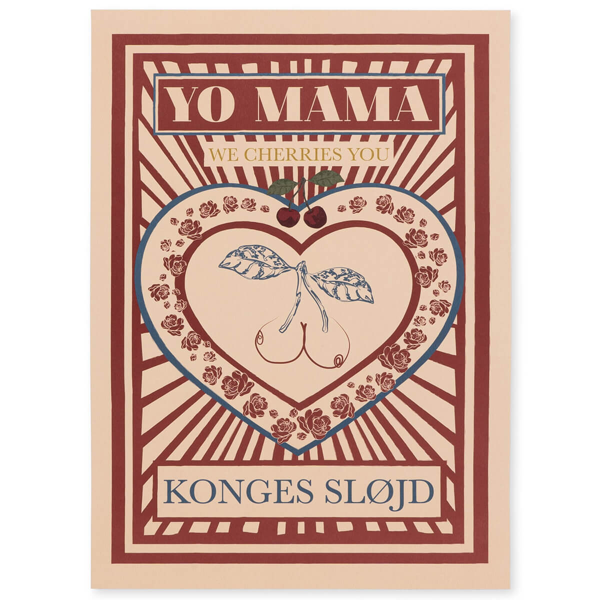 Poster by Konges Slojd. Statement poster featuring Konges Slojd signature colour palette and prints, and the phrase Yo Mama, we cherries you. A lovely tribute to motherhood and the perfect print for a new nursery.