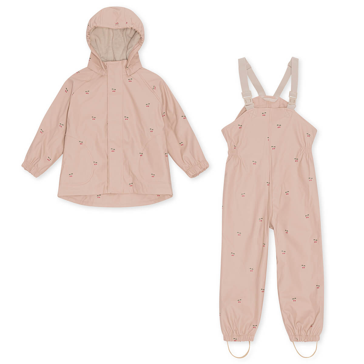 Rainy Palme Rainwear Set by Konges Slojd. Wind-resistant and waterproof PU rain set with warm fleece lining inside. Features essential detailing like a lined, detachable hood, high collar, elastic cuffs, and welded seams for complete protection against the elements. Please note: Up to size 4 years, all rain pants are designed with suspenders for an easy fit that stays put. For sizes 5-6 years and up, rain pants feature an elasticated waist – easy to pull on and off.