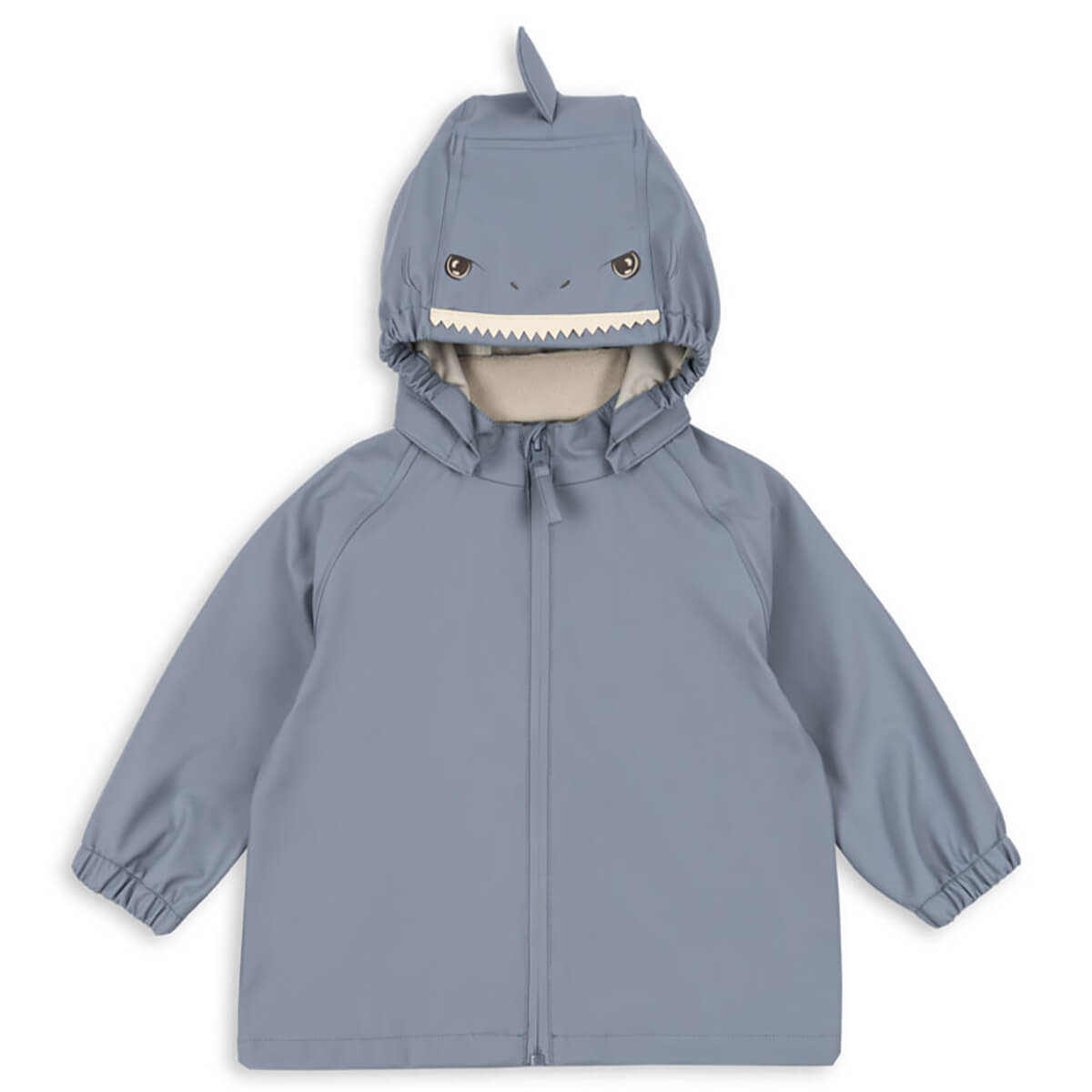 Sharka Rain Jacket by Konges Sløjd. Classic lightweight rain jacket made from durable and waterproof PU. Ideal for school and nursery wear, and designed in a no-fuss straight silhouette with a decorative shark print that makes rainy-day dressing even more fun. The rain jacket is both wind-resistant and waterproof with practical features like welded seams, elastic waist, and elastic cuffs at hands that will easily fit over gloves.