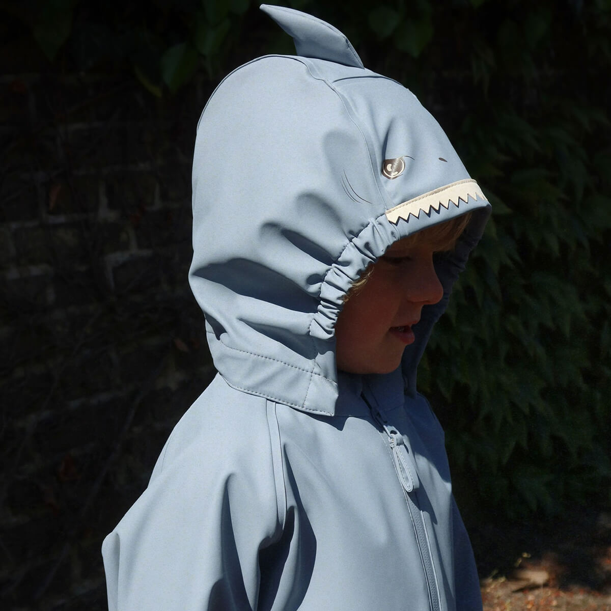 Sharka Rain Set by Konges Sløjd. The sharka rain set is an everyday favourite in a lightweight quality that is ideal for school and nursery. Easy and practical to keep in the wardrobe as a backup for whatever weather the day might bring. Wind-resistant and waterproof with a detachable hood. Designed with elastic cuffs at hands and ankles to make sure the rain set stays firmly in place and fits over boots and gloves.
