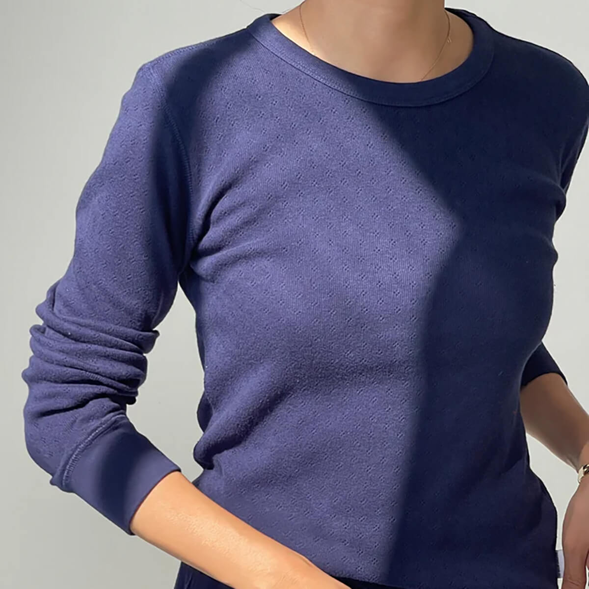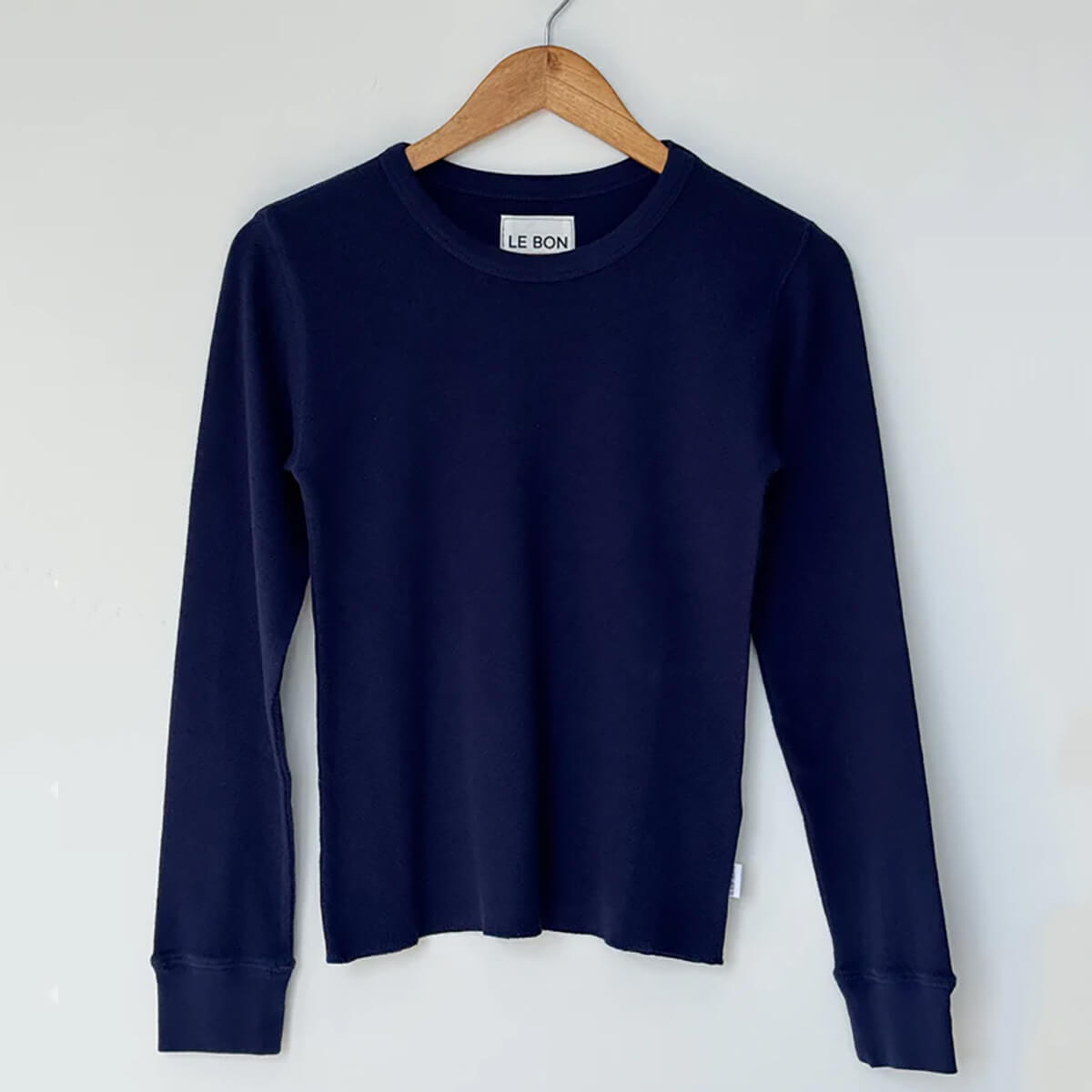Pointelle Fundamental Tee by Le Bon Shoppe. A classic long sleeved t shirt with a timeless feel. The Fundamental Pointelle Tee fits close to the body while giving you room to breathe. Designed with a classic crew neckline, slim silhouette, and elevated baby rib cuffs.