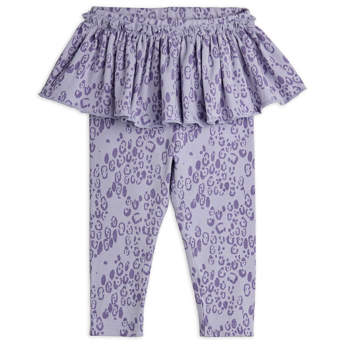 Mini Leopard AOP Baby Skirt Leggings by Mini Rodini. Baby leggings in a purple leopard design featuring a skirt detail.
