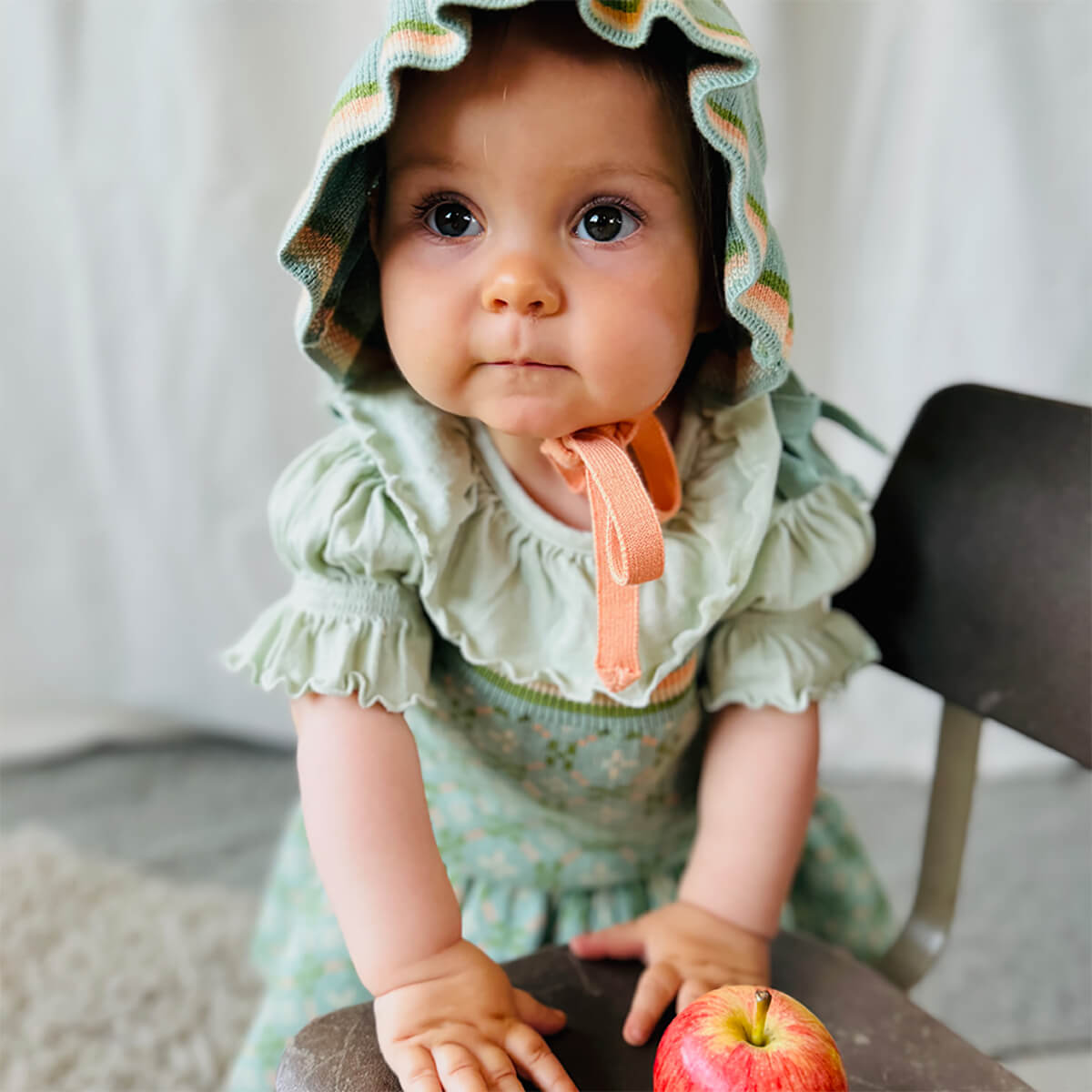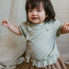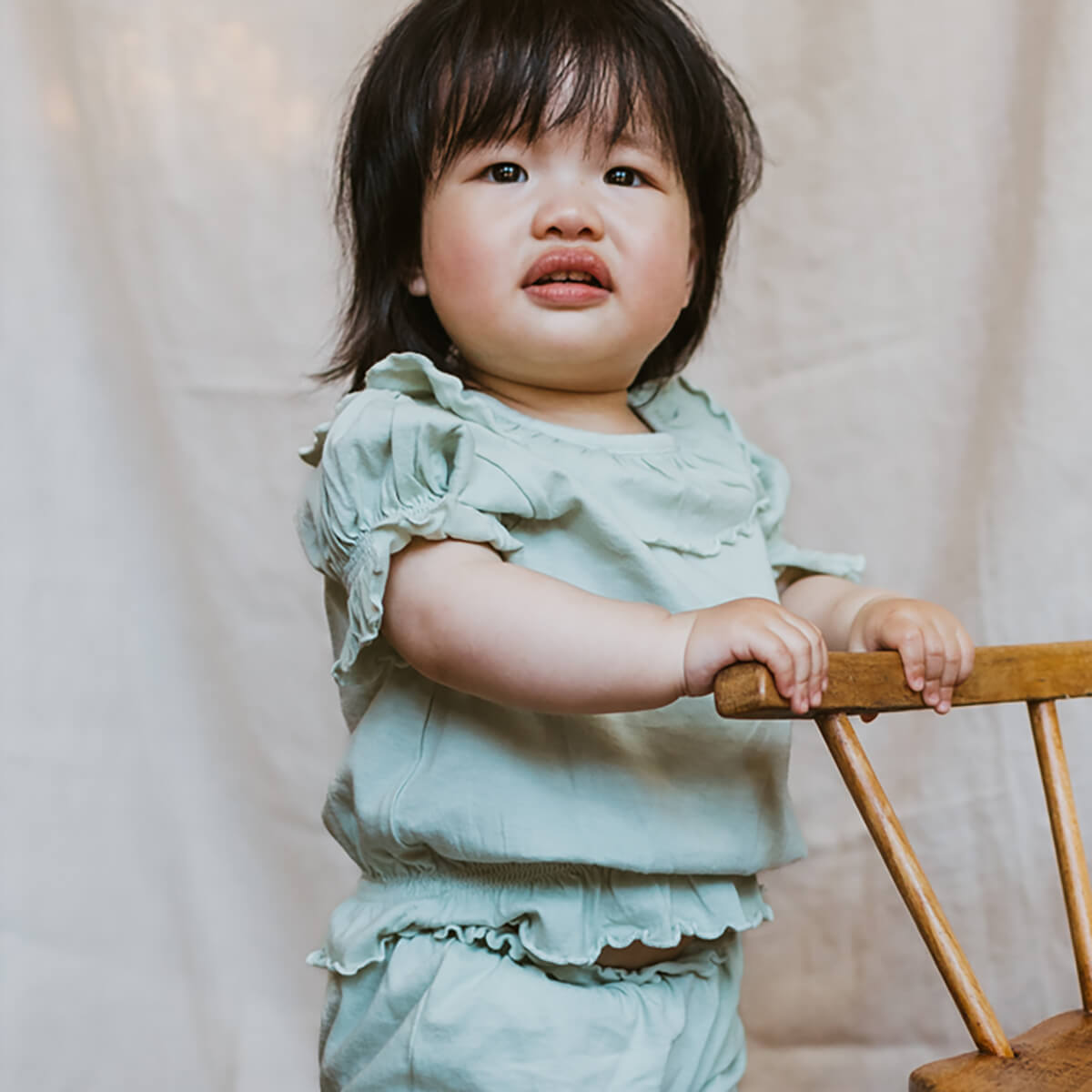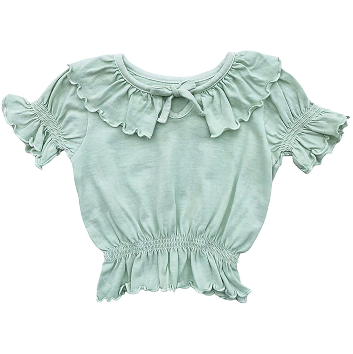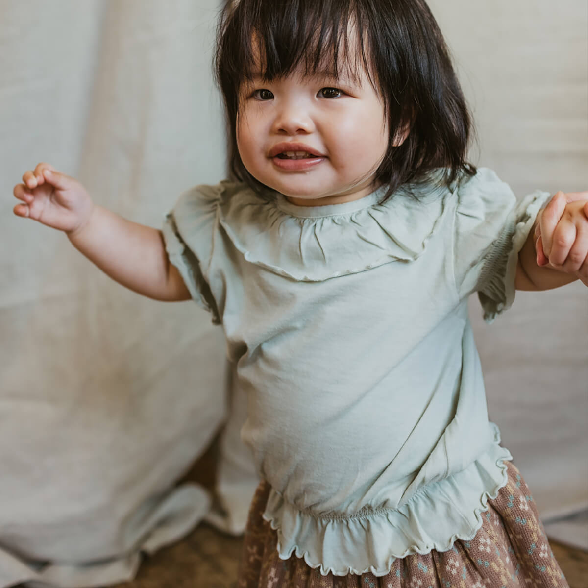 Mali Tee by Mabli. A pretty top with shirring elastic at the sleeves and hem, creating a frill puffball shape. Two ways to wear - with ties at the front or back of the neck.