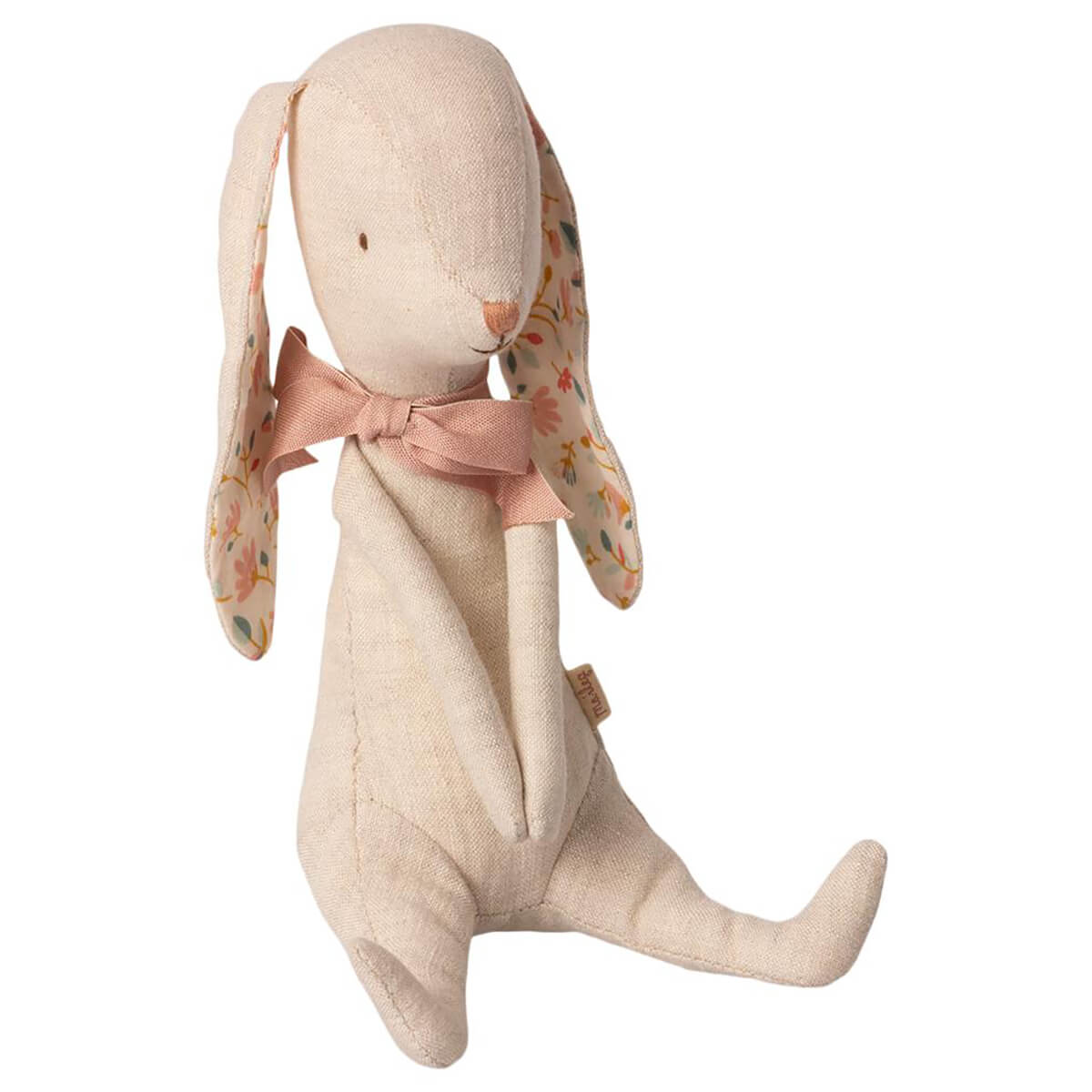 Bunny Albina by Maileg. Bunny Albina is made in a soft quality linen in a natural colour, a pink bow and a sweet floral pattern in her ears. She has magnets in her hands so she can hang on any metal part or hold one of the metal Maileg easter eggs.
