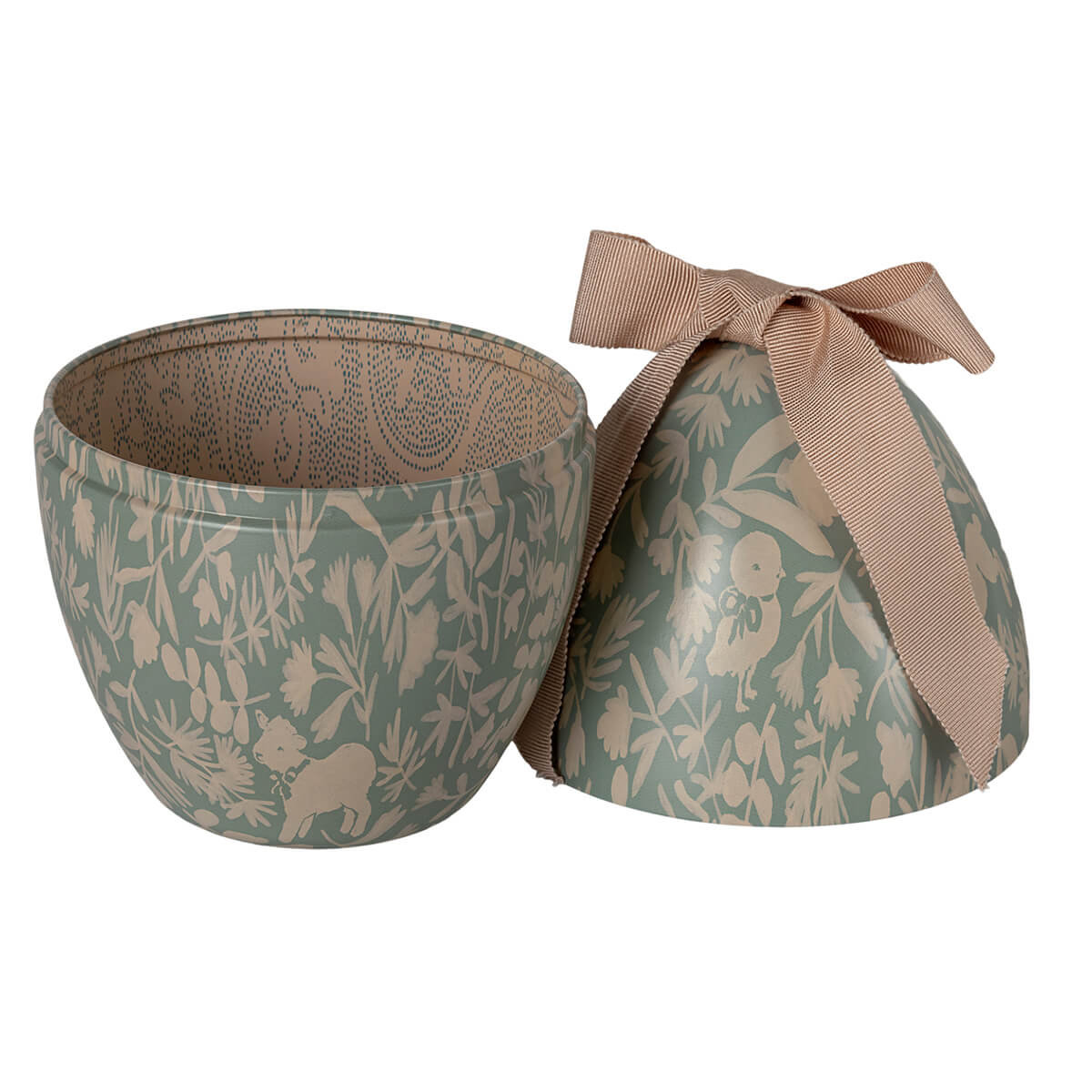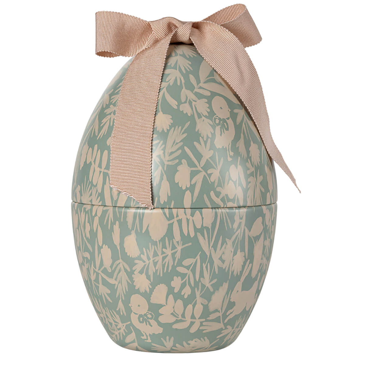 Metal Easter egg by Maileg. The Maileg easter egg has a beautiful new all over print. Take a good look at the print and see if you can find the different animals. The egg comes with a big soft bow on the top that gives the egg an exclusive look.