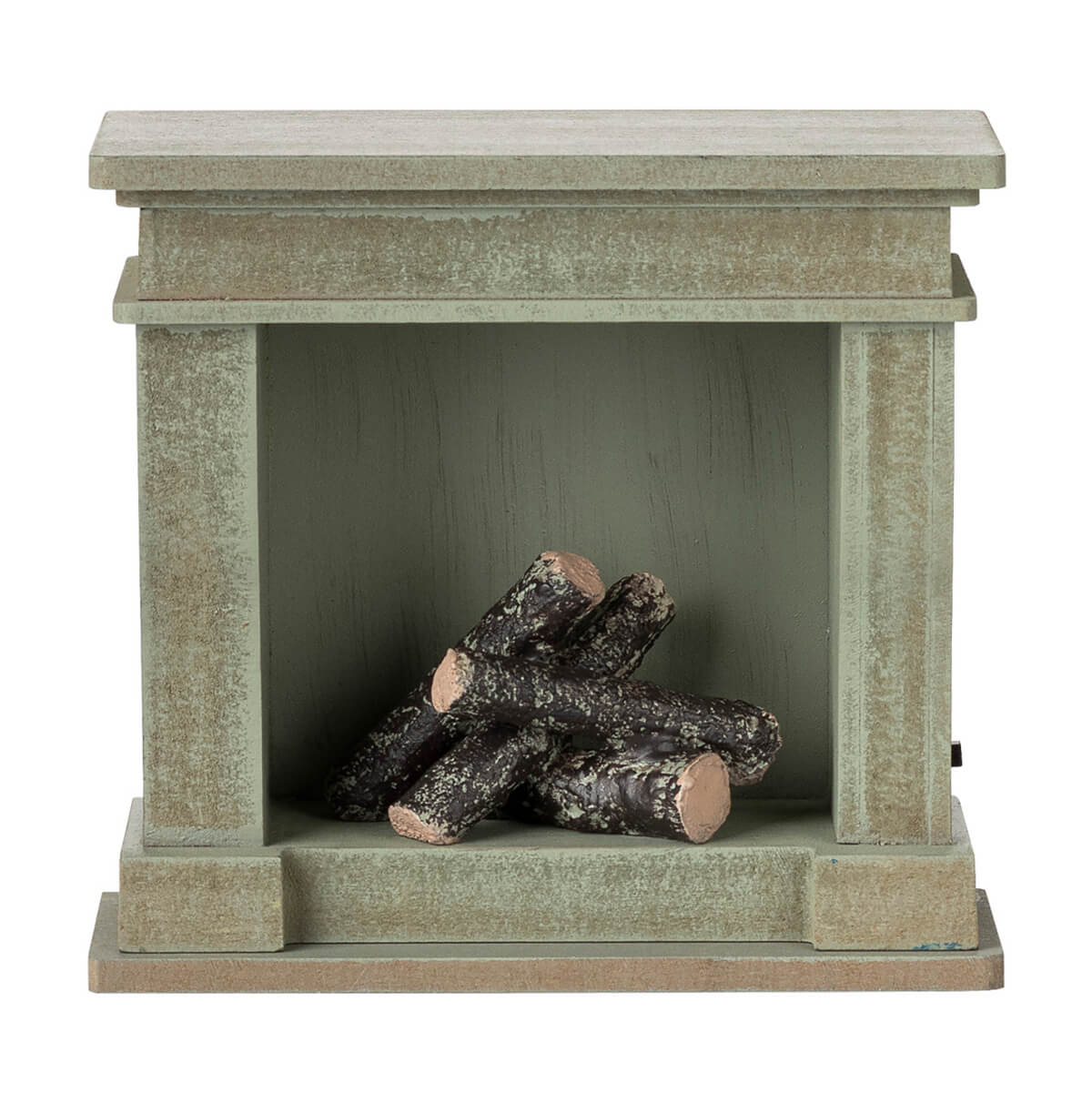 Miniature fireplace by Maileg. Use this wooden fireplace to warm your miniature home. It has an authentic look and a vintage finish. Remember to turn off when your friends go to bed. An adult can change the battery, which is non-rechargeable.