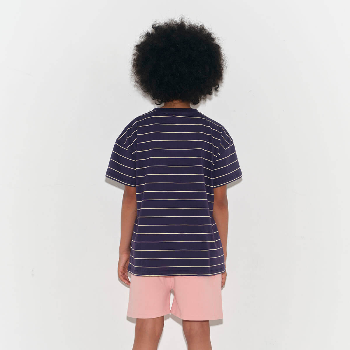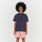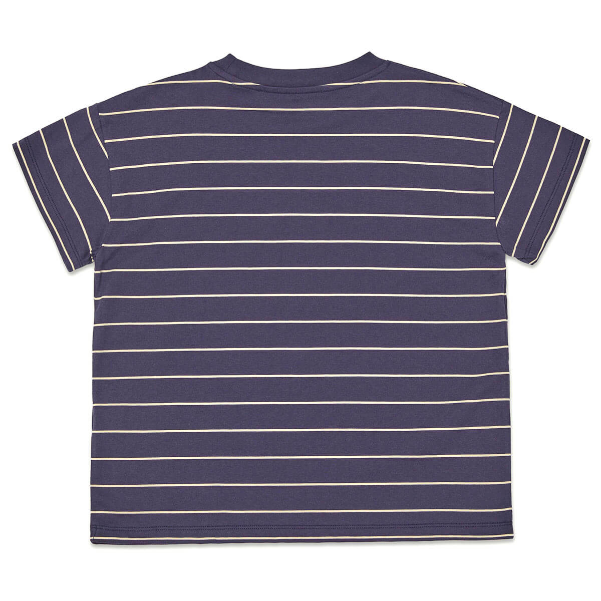 Loose Tee by Main Story. A short sleeve, relaxed fit t-shirt in deep blue with a stripe design and a small logo on the bottom corner.