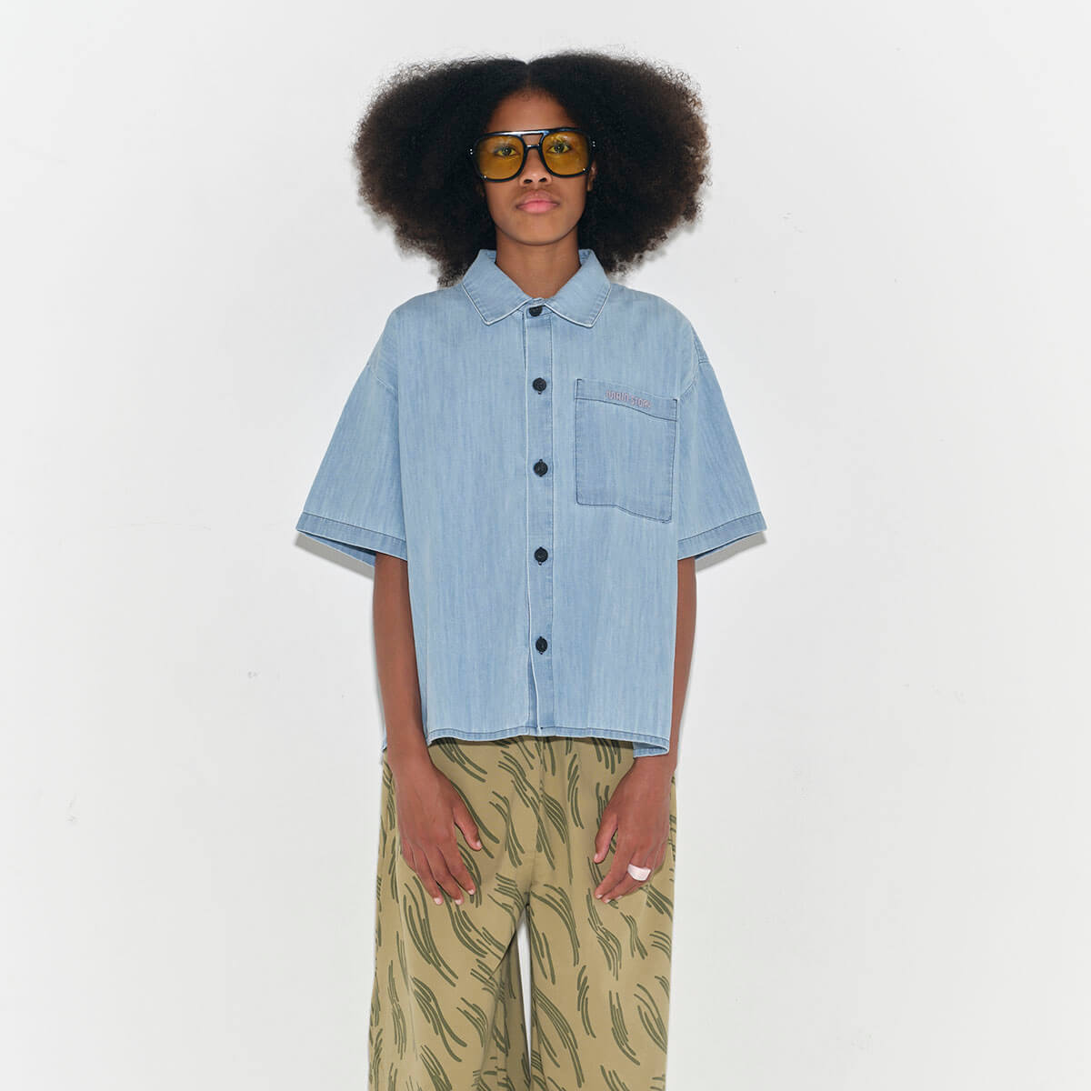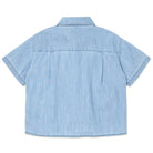 Short Sleeve Shirt by Main Story. A lightweight denim shirt featuring short sleeves and a single chest pocket with Main Story embroidered across the top.
