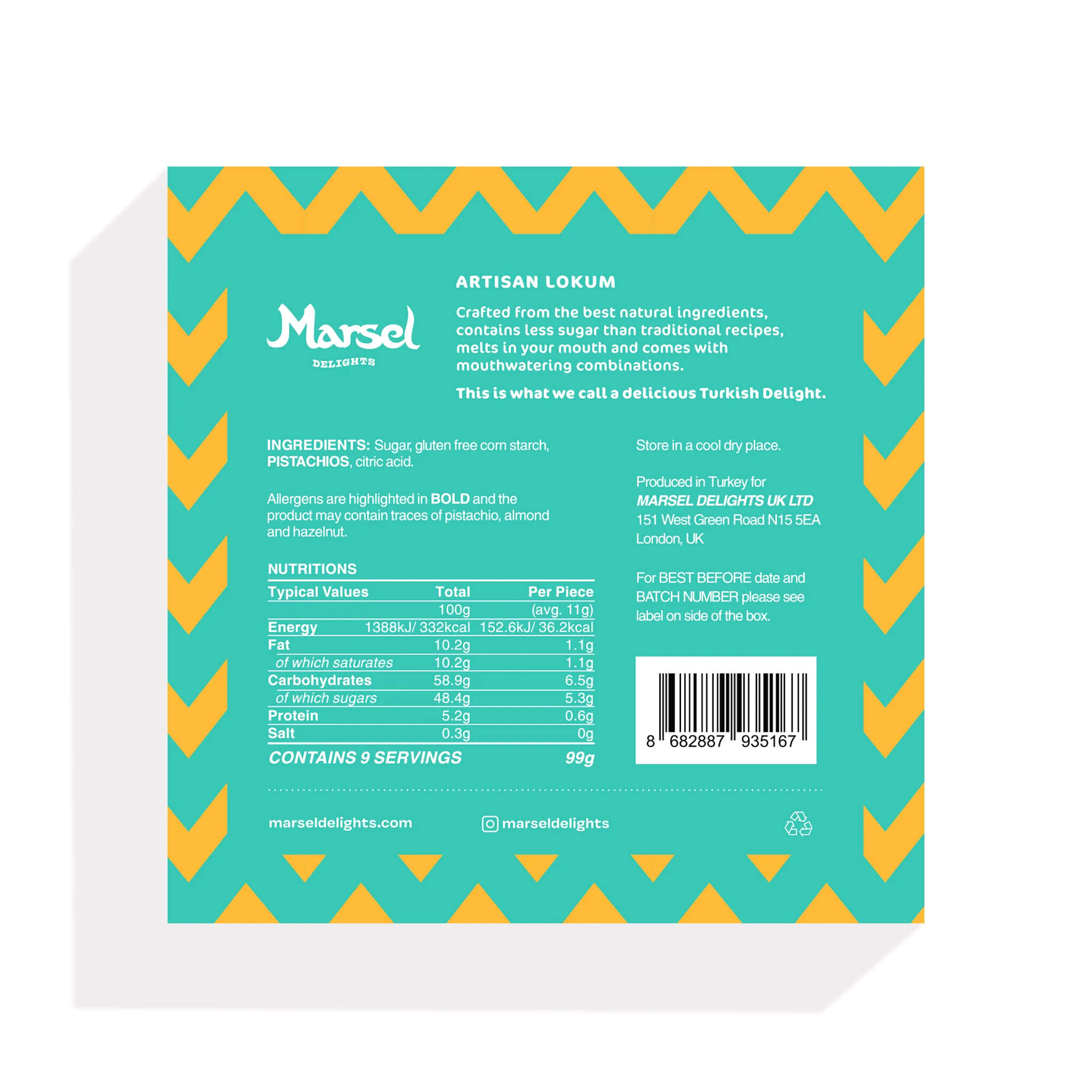 Marsel's Sugar Policy: At Marsel, we pay great attention to how much sugar we use. Our recipes contain less sugar than traditional Turkish delight, focusing instead on achieving a balanced sweetness that complements — rather than overwhelms — the natural flavors of each lokum.
