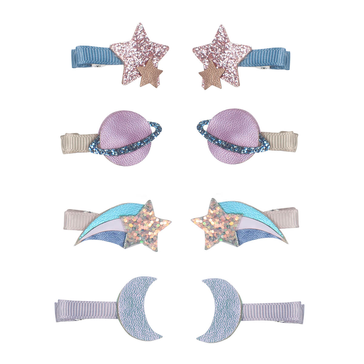 Galaxy Mini Hair Clips by Mimi & Lula. Perfect for budding astrologers, these super sparkly mini clips are sure to add a touch of cosmic shine to any hair style. Featuring stars and planets crafted from soft suedette, metallic and chunky glitter fabrics.