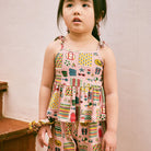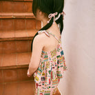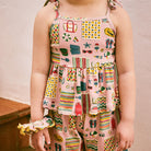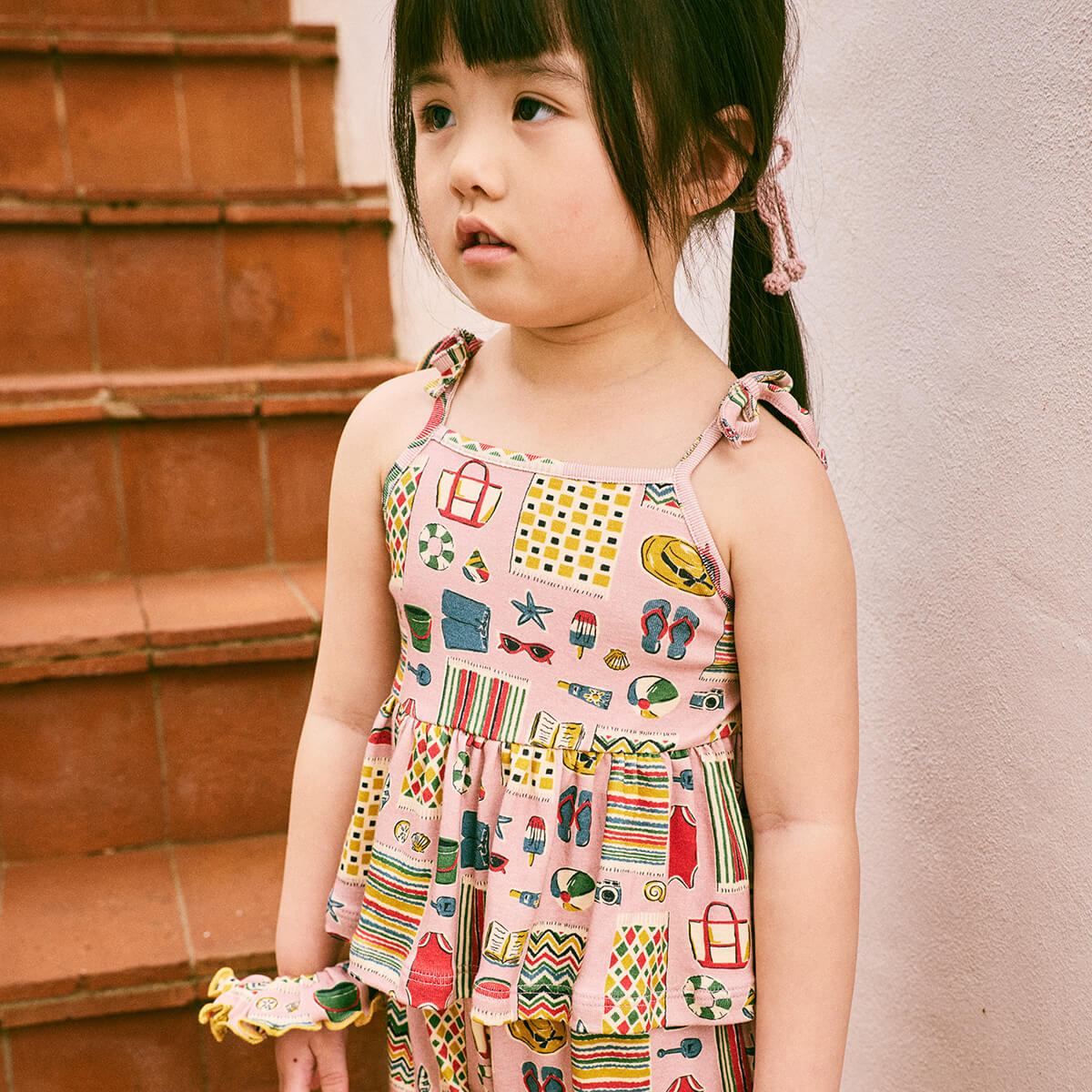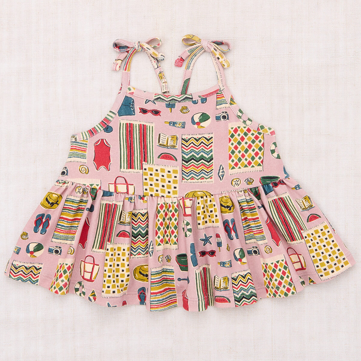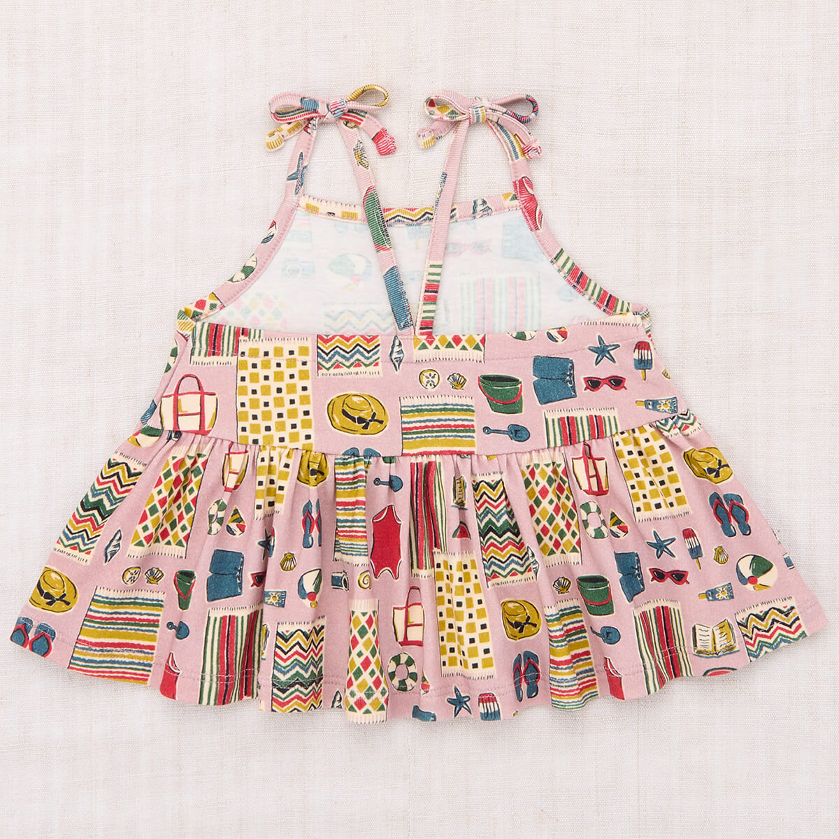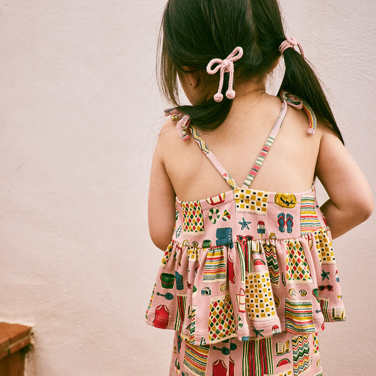 Camilla Tank by Misha & Puff. A peplum-style tank top in organic Pima cotton, with adjustable shoulder strap ties that meet in a "V" shape at the center back. The Parfait Beach Day print is crafted from a hand-painted custom design.