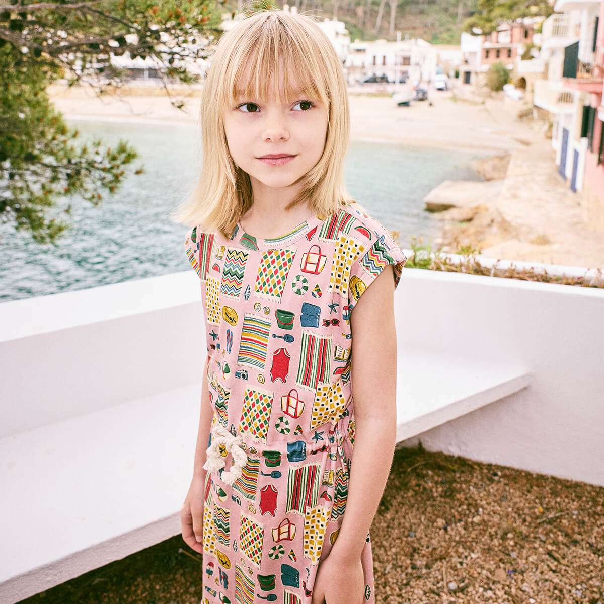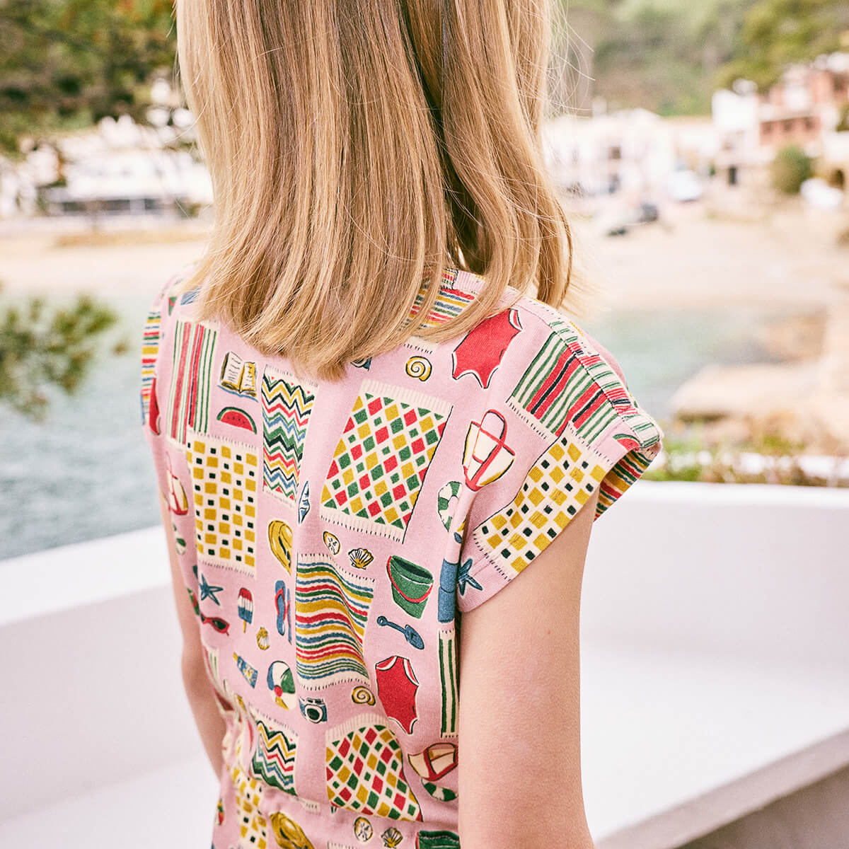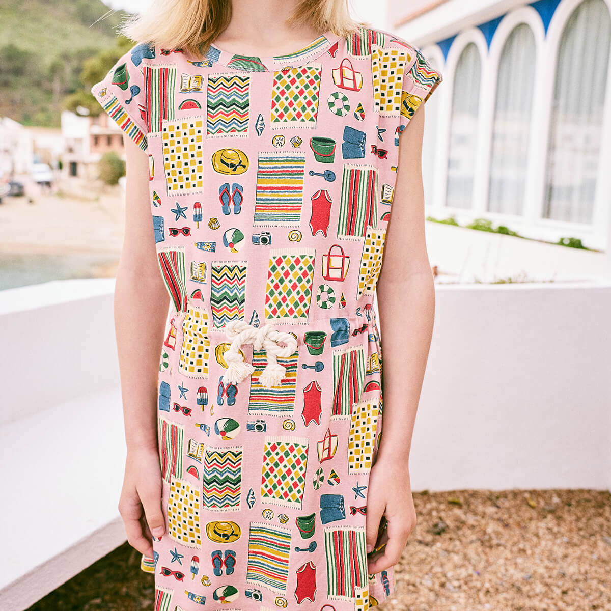 Cover Up dress by Misha & Puff. A boatneck-style cover-up dress in organic Pima cotton, featuring a curved hem and cinched rope waist tie. The Parfait Beach Day print is crafted from a hand-painted custom design.