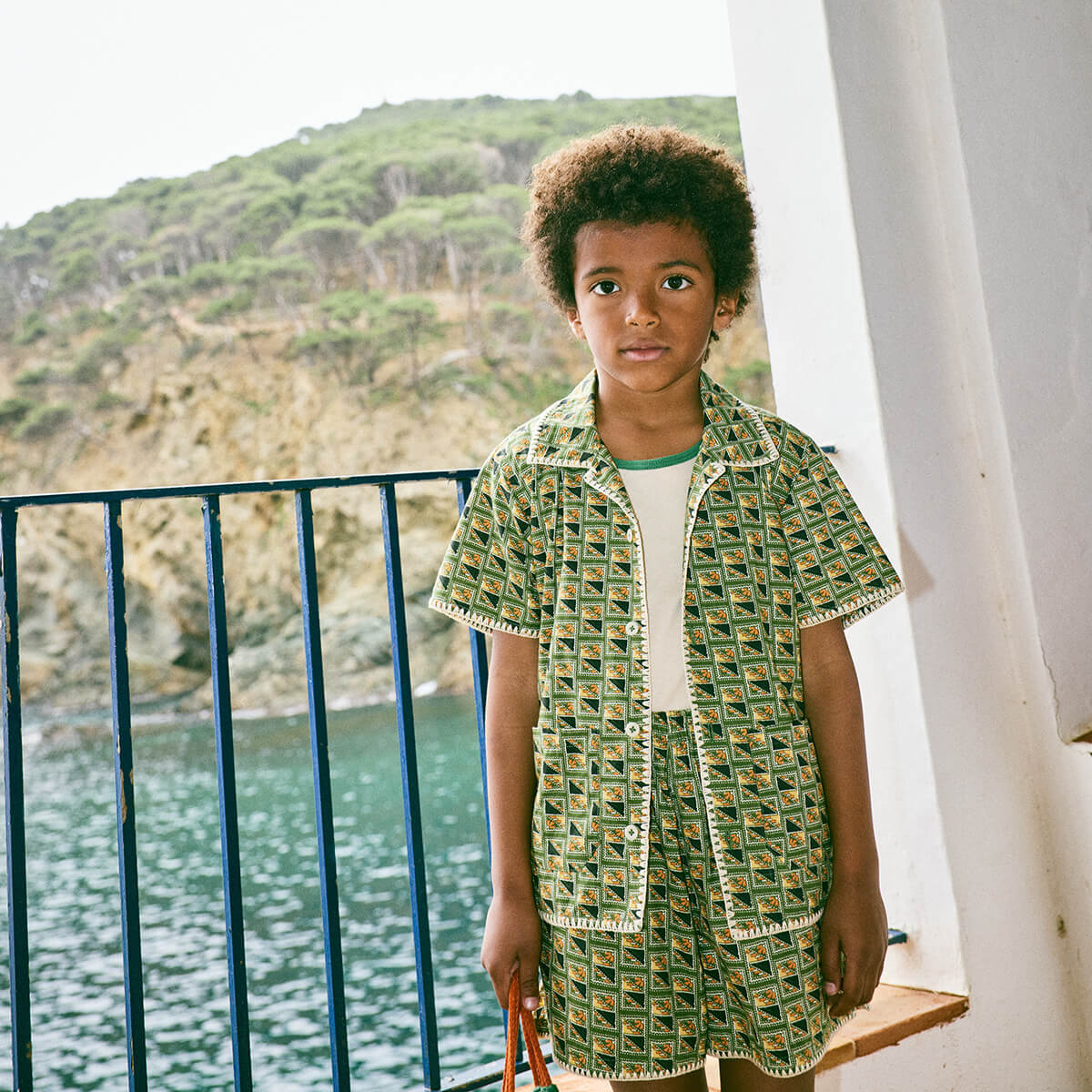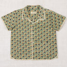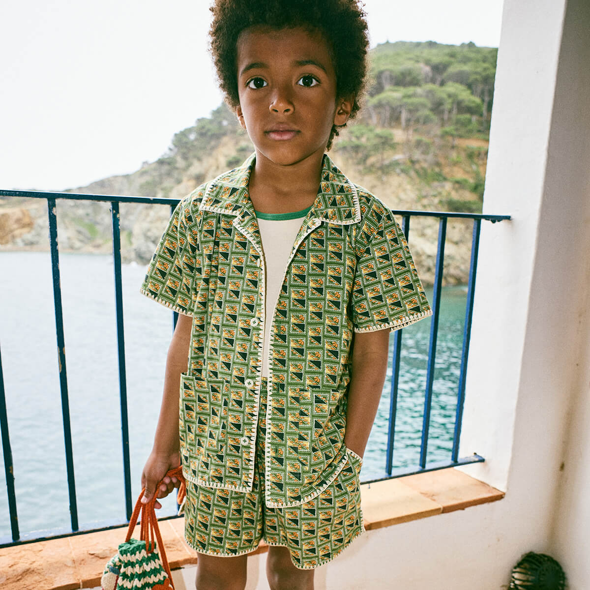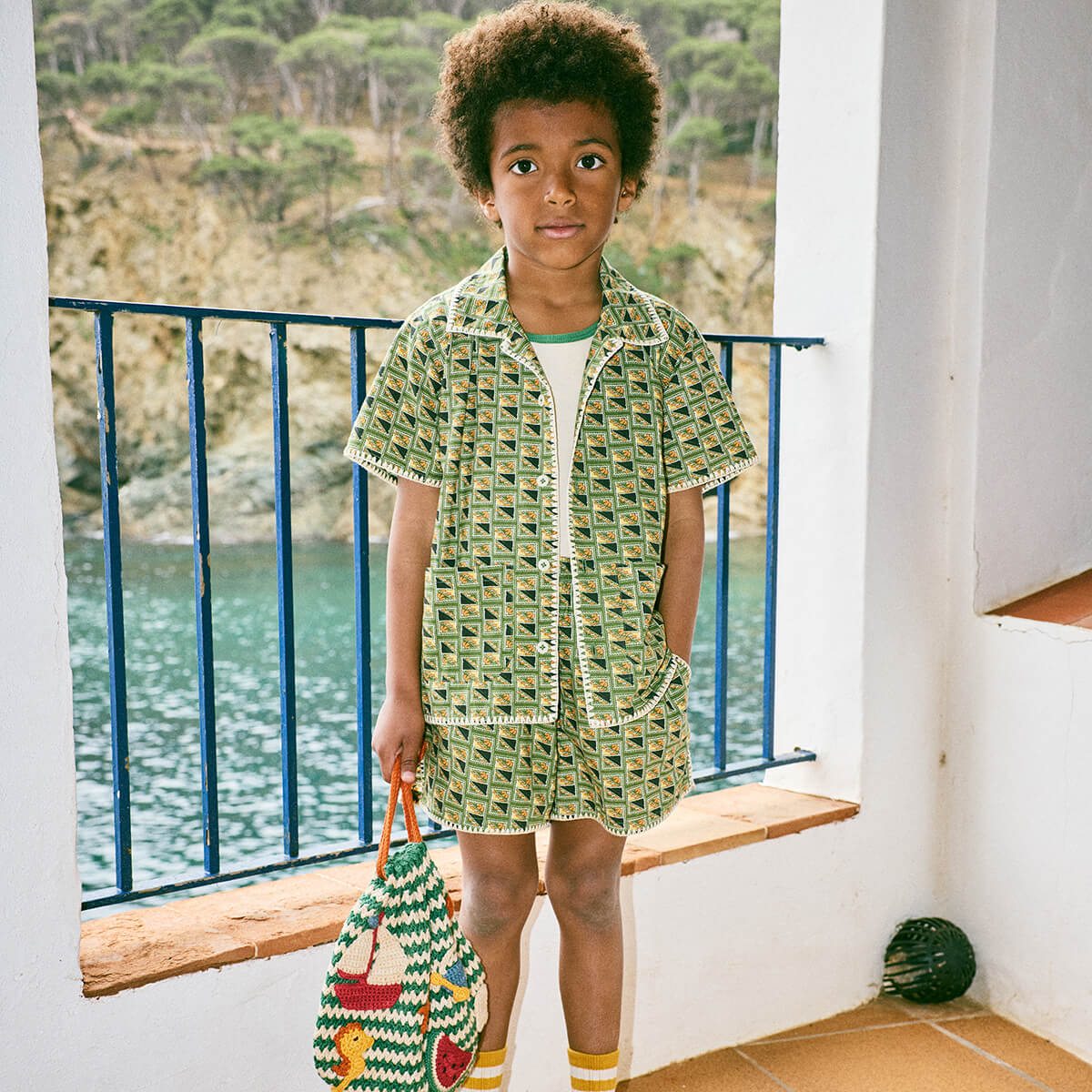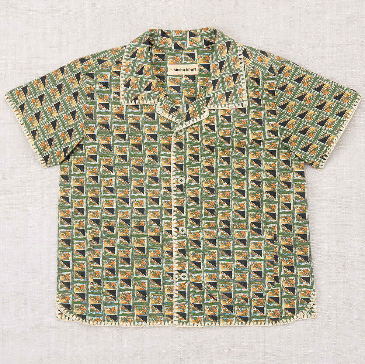 Leon Top by Misha & Puff. A short-sleeved shirt in cotton poplin, featuring a point collar, rounded hem with side vents, all-over contrast embroidered trim detail, and corozo button closure. Finished with French seams.