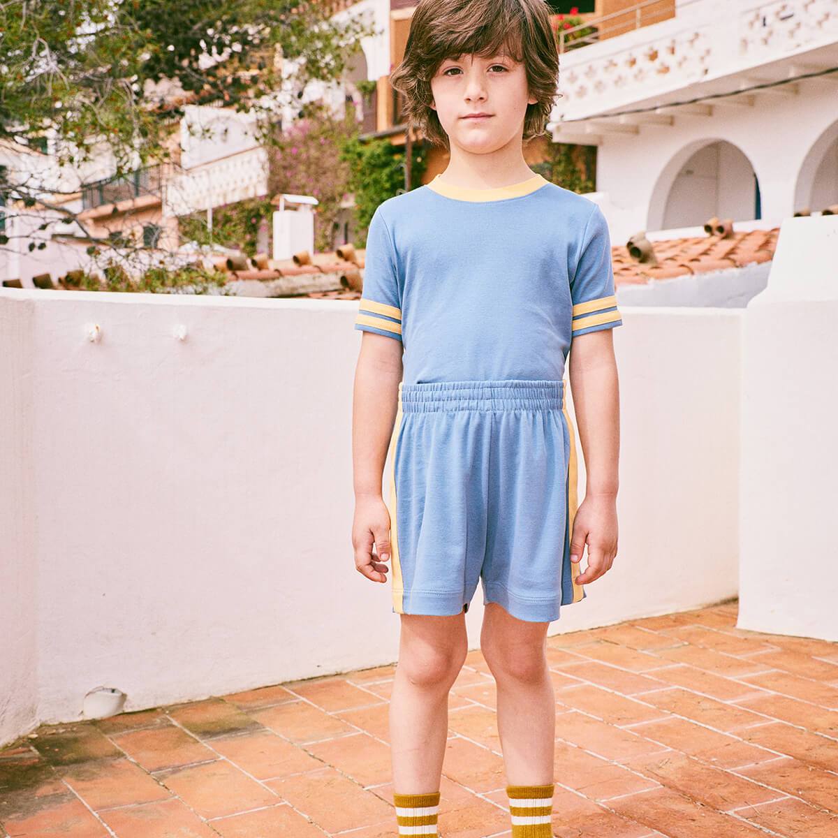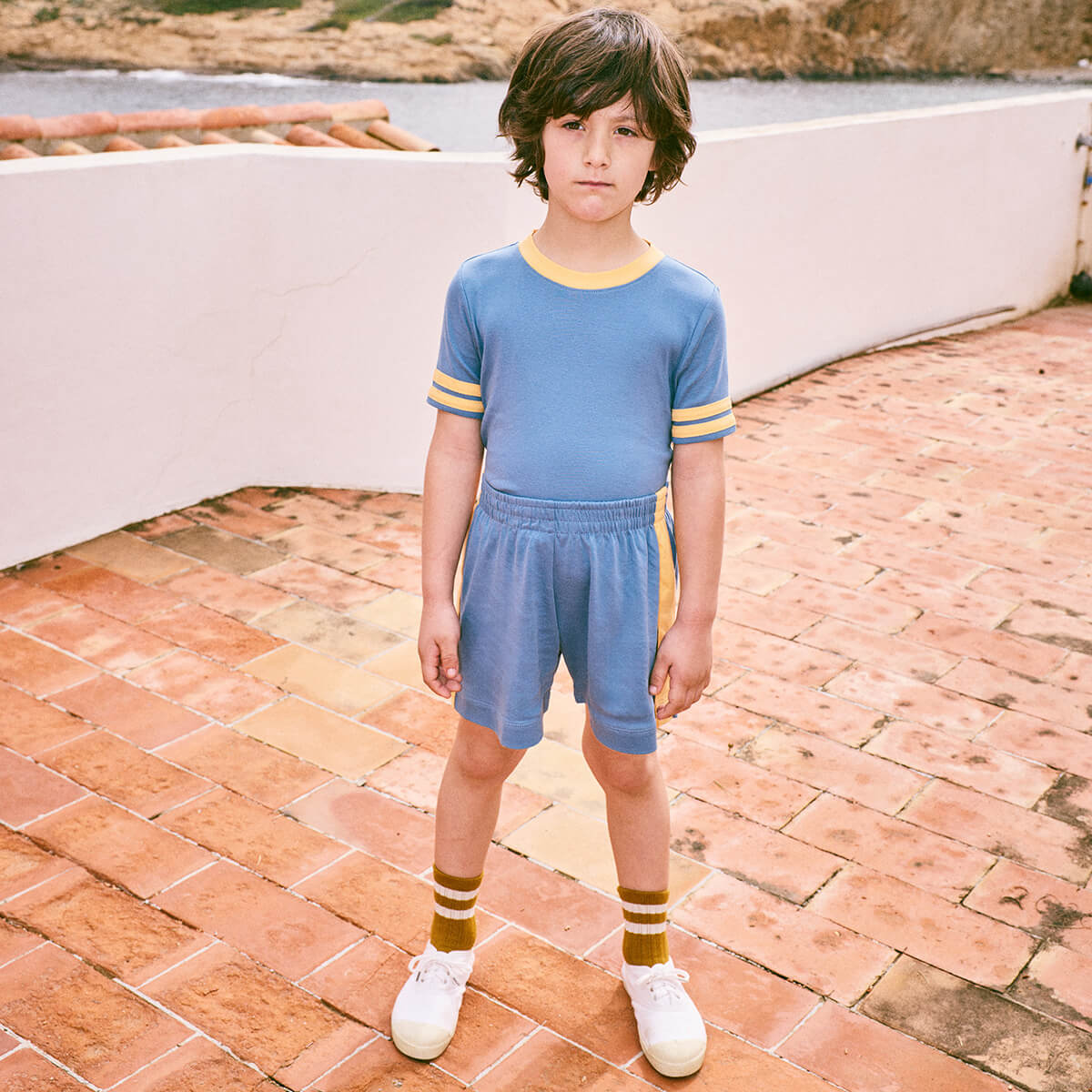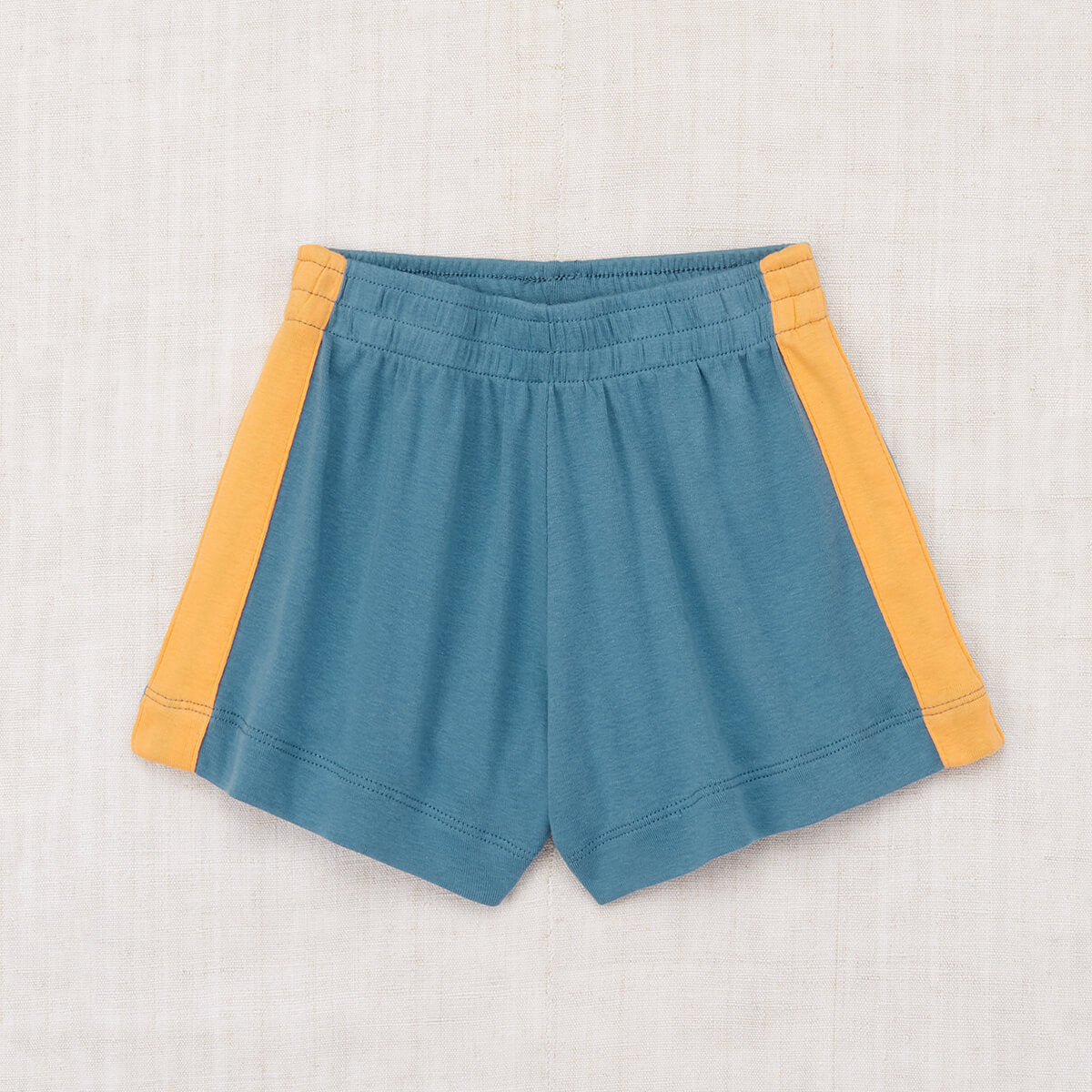 Resort Short by Misha & Puff. Vintage-style pull-on shorts in organic Pima cotton, with an elastic waistband and contrast appliqué striped sides.