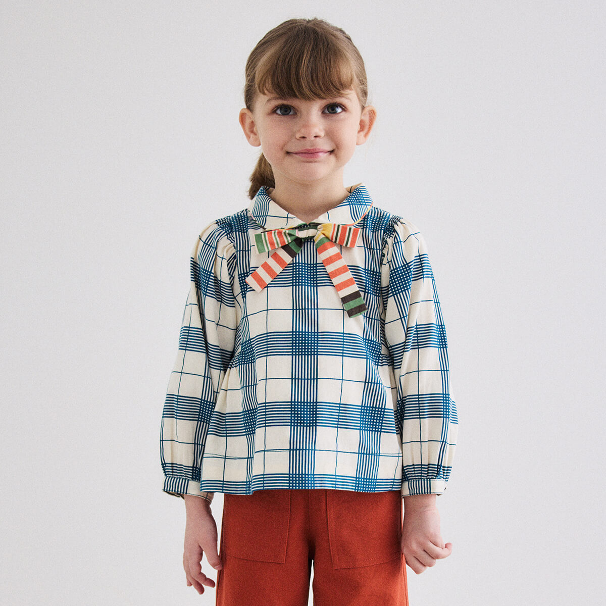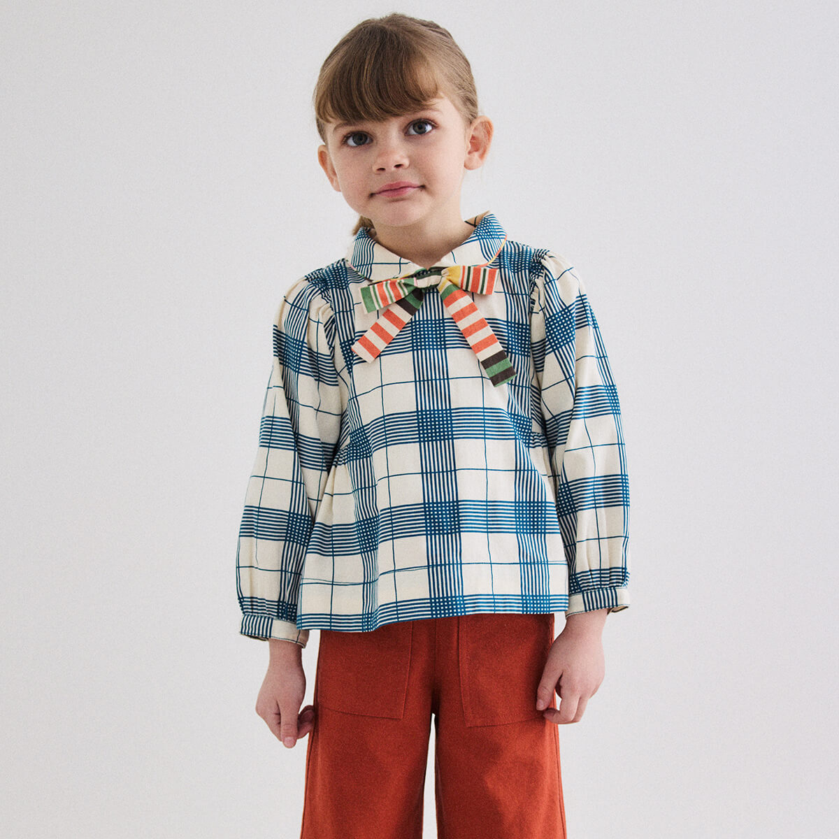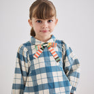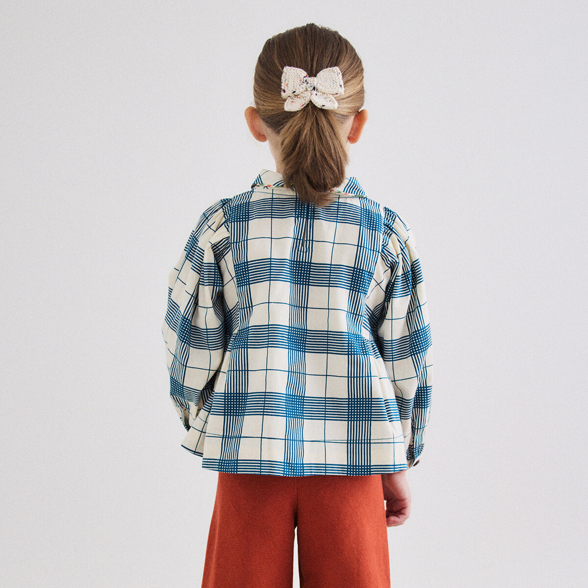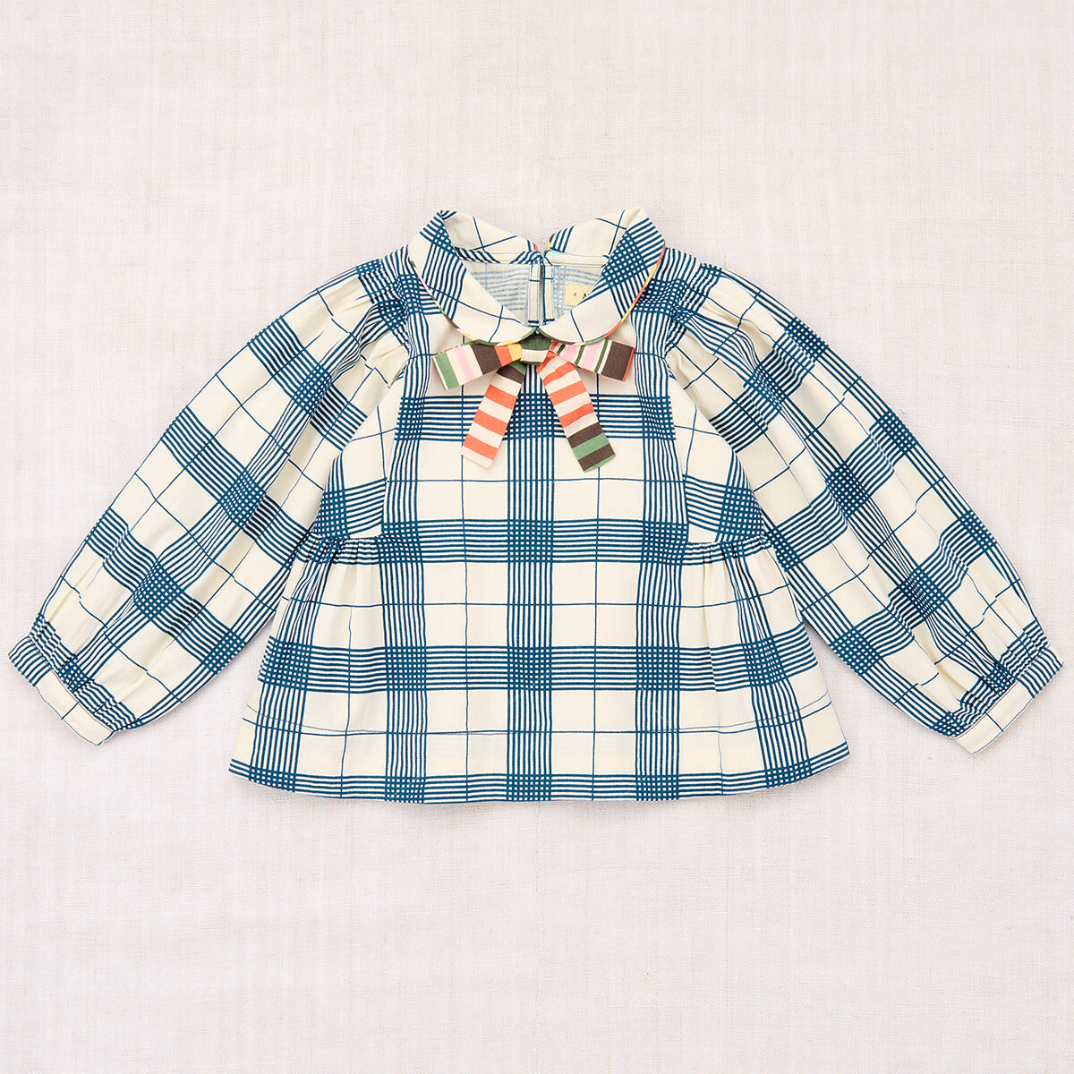 Zora Blouse by Misha & Puff. A peplum-style long-sleeved top in cotton twill, featuring blouson sleeves, a rounded collar with contrast trim, and a contrast-print bow at the center front. Finished with French seams.