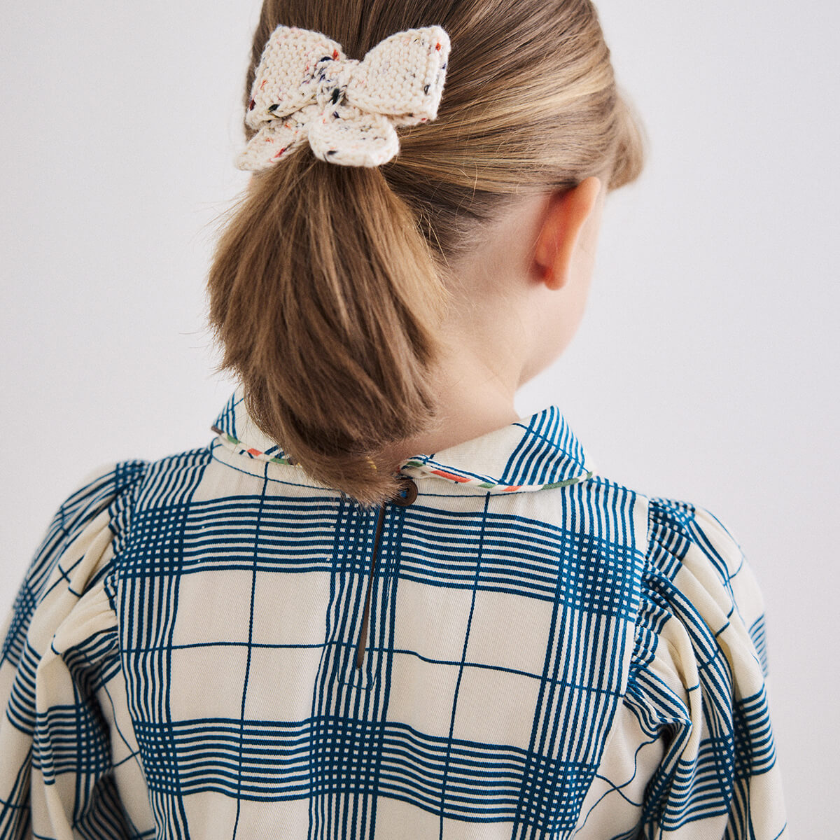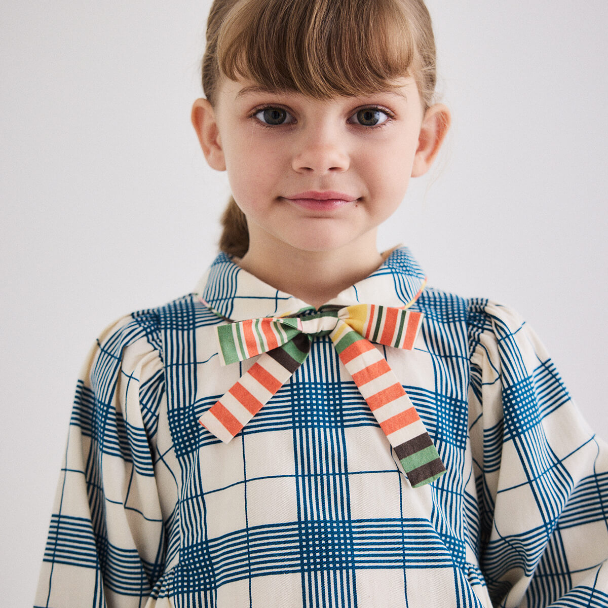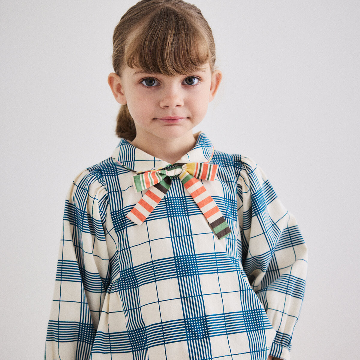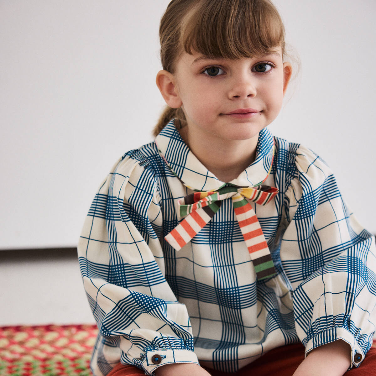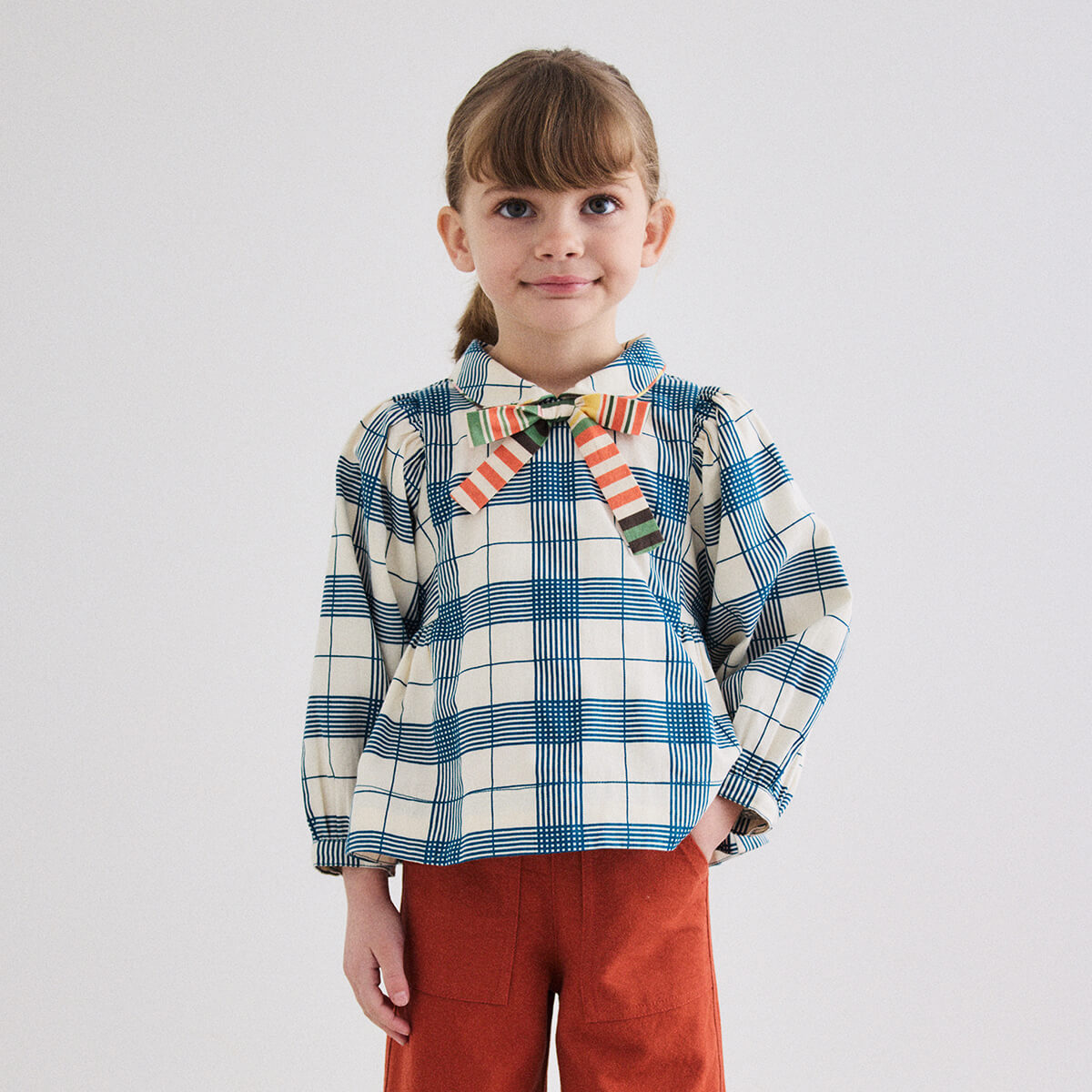 Zora Blouse by Misha & Puff. A peplum-style long-sleeved top in cotton twill, featuring blouson sleeves, a rounded collar with contrast trim, and a contrast-print bow at the center front. Finished with French seams.