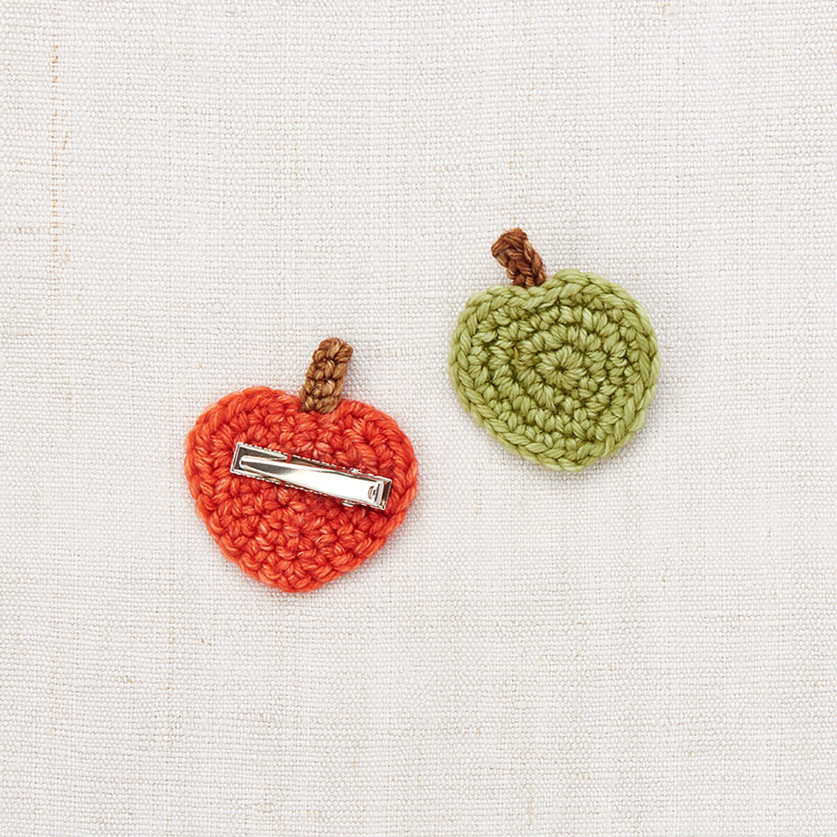 Apple Clip Set by Misha & Puff. A set of hand-knit apple shaped hair clips in merino wool.