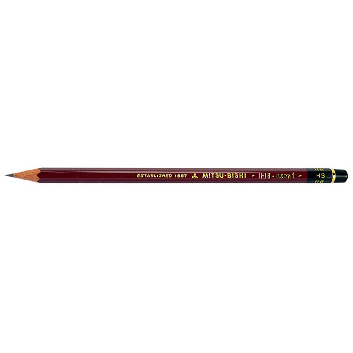 Hi-Uni HB Pencil by Mitsubishi. Mitsubishi Hi-Uni is one of the world's finest pencil ranges. The Hi-Uni was introduced in 1966 and achieves greatness through exacting standard of lead production. The pencil is painted in a traditional Japanese maroon, likened to a wine red, with black and gold accents. The hexagonal barrel changes to cylindrical above the gold ring, in a neat design touch. The graphite and clay components of the lead are both uniformly fine, so that the line quality is high, and uniformly mixed, so that breakages are minimised.