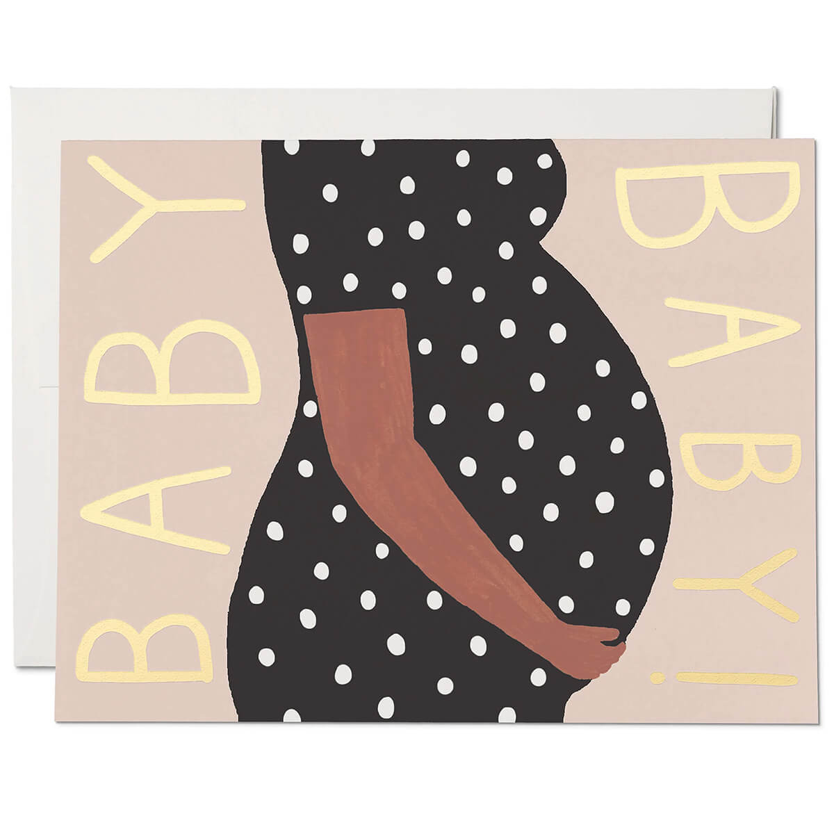 Baby bump greetings card by Red Cap Cards. Features an illustration by Kate Puglsey. Printed in the USA on heavyweight card stock. Blank inside with white envelope.