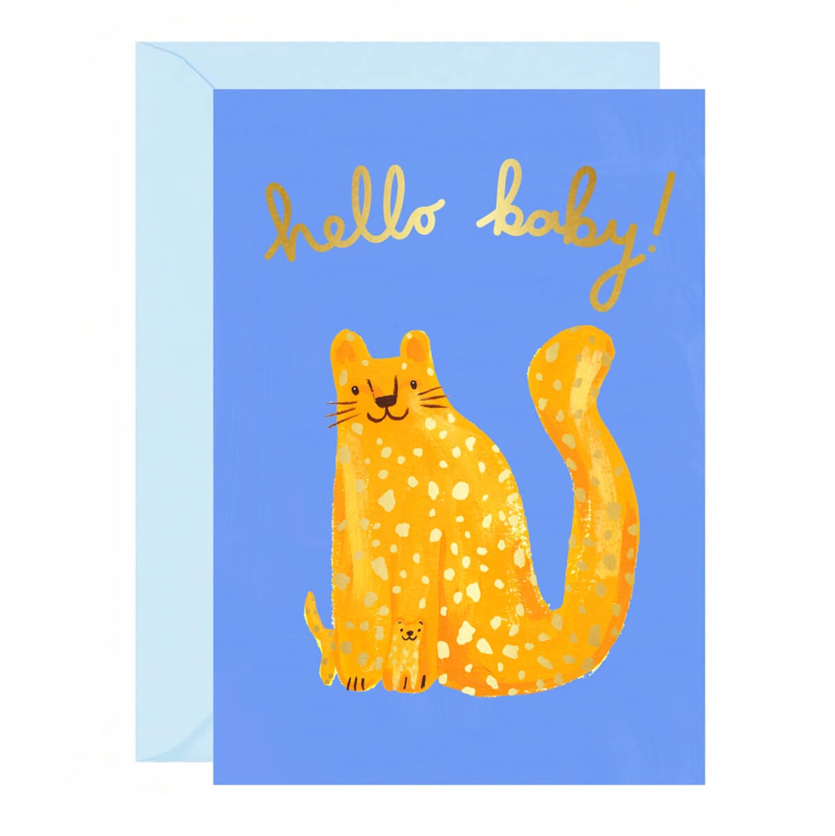 Hello Baby Leopard new baby greetings card by Ickaprint. Celebrate a new arrival with this exclusive Ickaprint design. Blank inside.