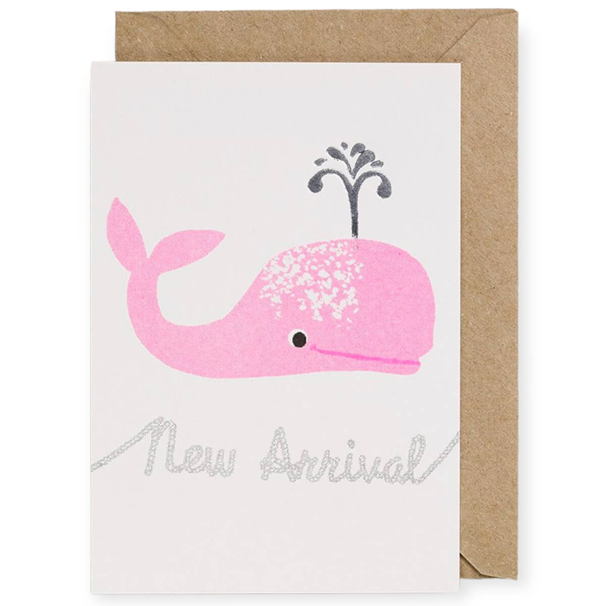 Pink whale new baby greetings card by Petra Boase. Risograph print using soy based inks on FSC certified card. Blank inside for your own message.