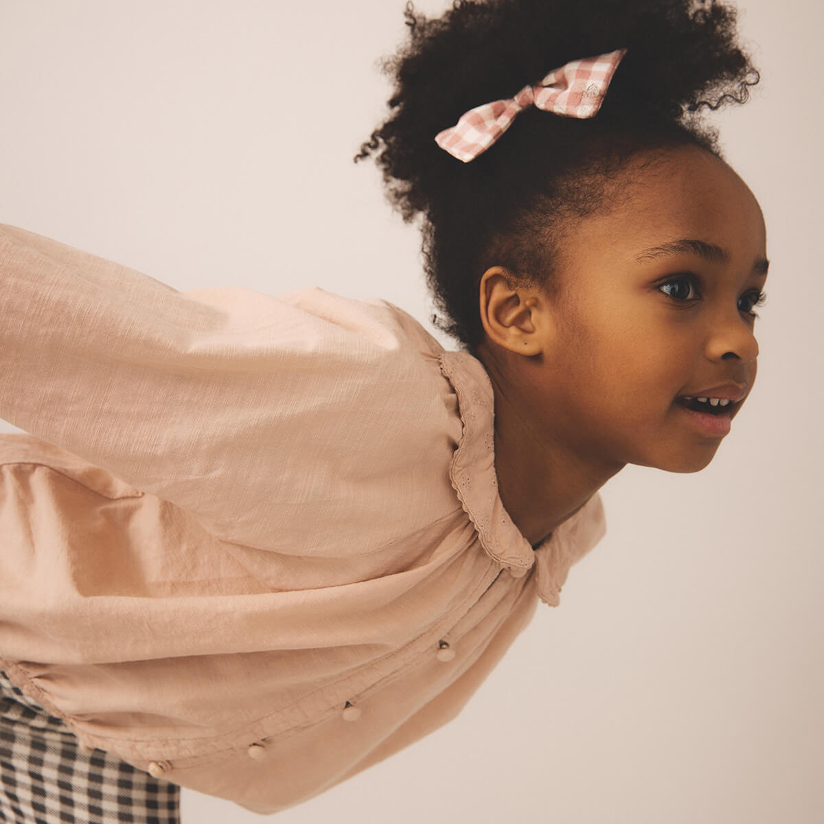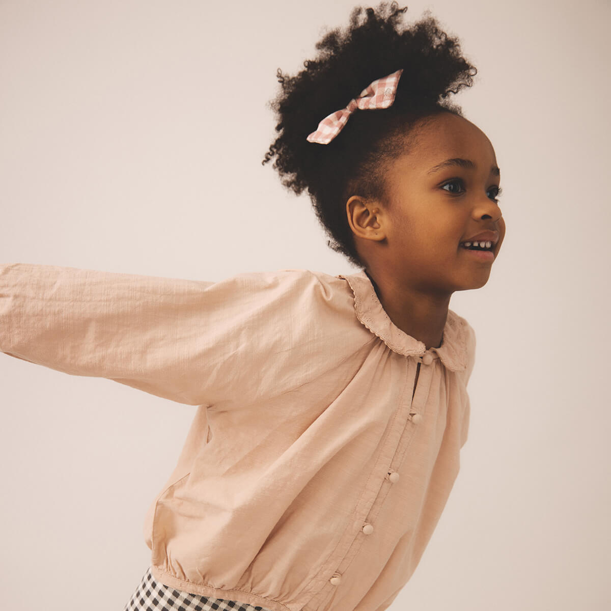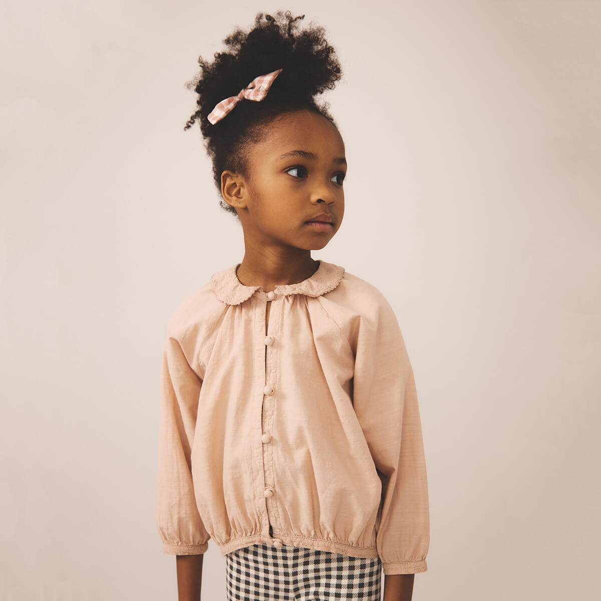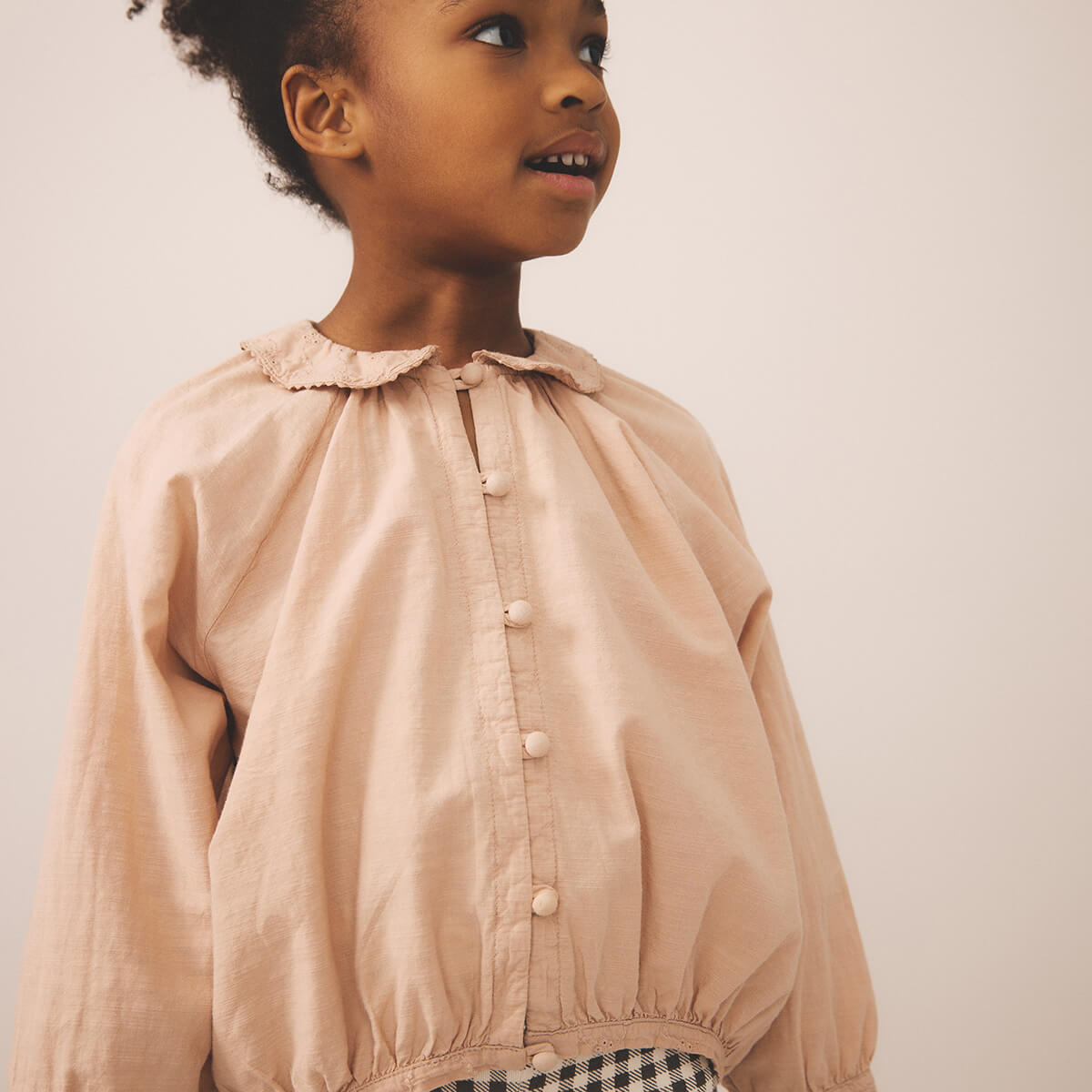 Lora Blouse by Soor Ploom. Button front top with a balloon silhouette and eyelet collar. Covered buttons line placket with an eyelet detail at sleeve and hem bindings.