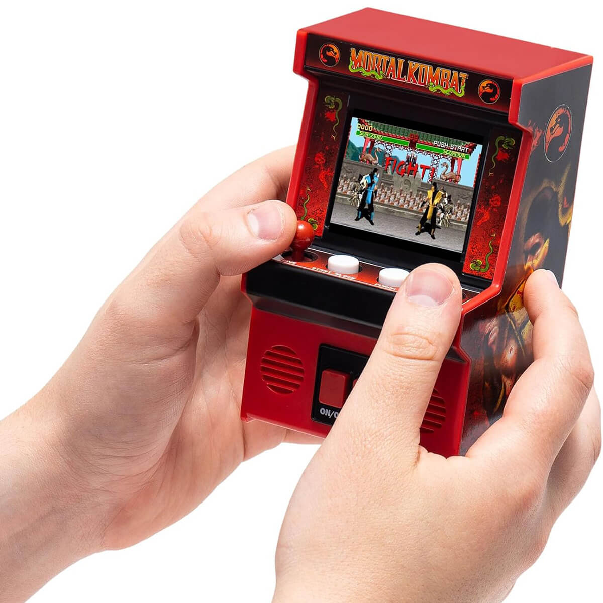 Mortal Kombat Mini Arcade Game by Hasbro. Relive the intensity of the arcade with the Arcade Classics Mortal Kombat mini arcade game! This retro-inspired handheld brings the iconic 90s fighter back to life with original characters, authentic moves, and classic fatalities. Take control with the vintage joystick and engage in one-on-one battles featuring pixel-perfect graphics and bone-crunching sound effects straight from the arcade. The full-color screen delivers vivid visuals, letting every punch, kick, and uppercut hit with cinematic flair.
