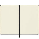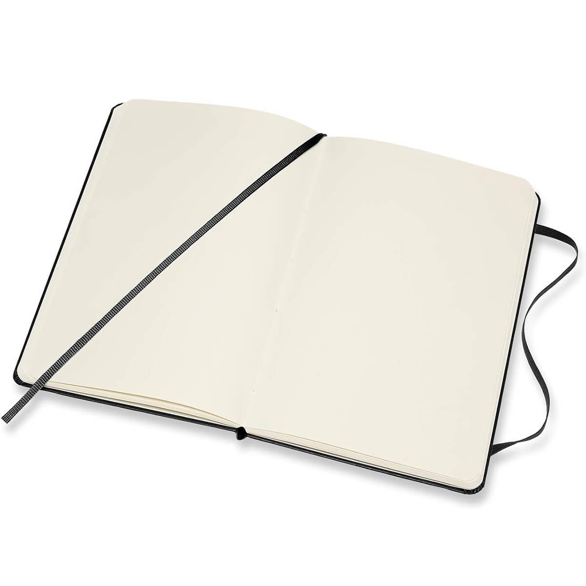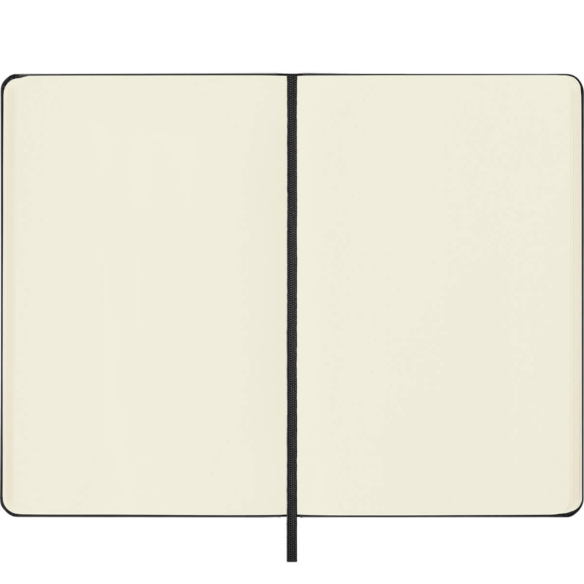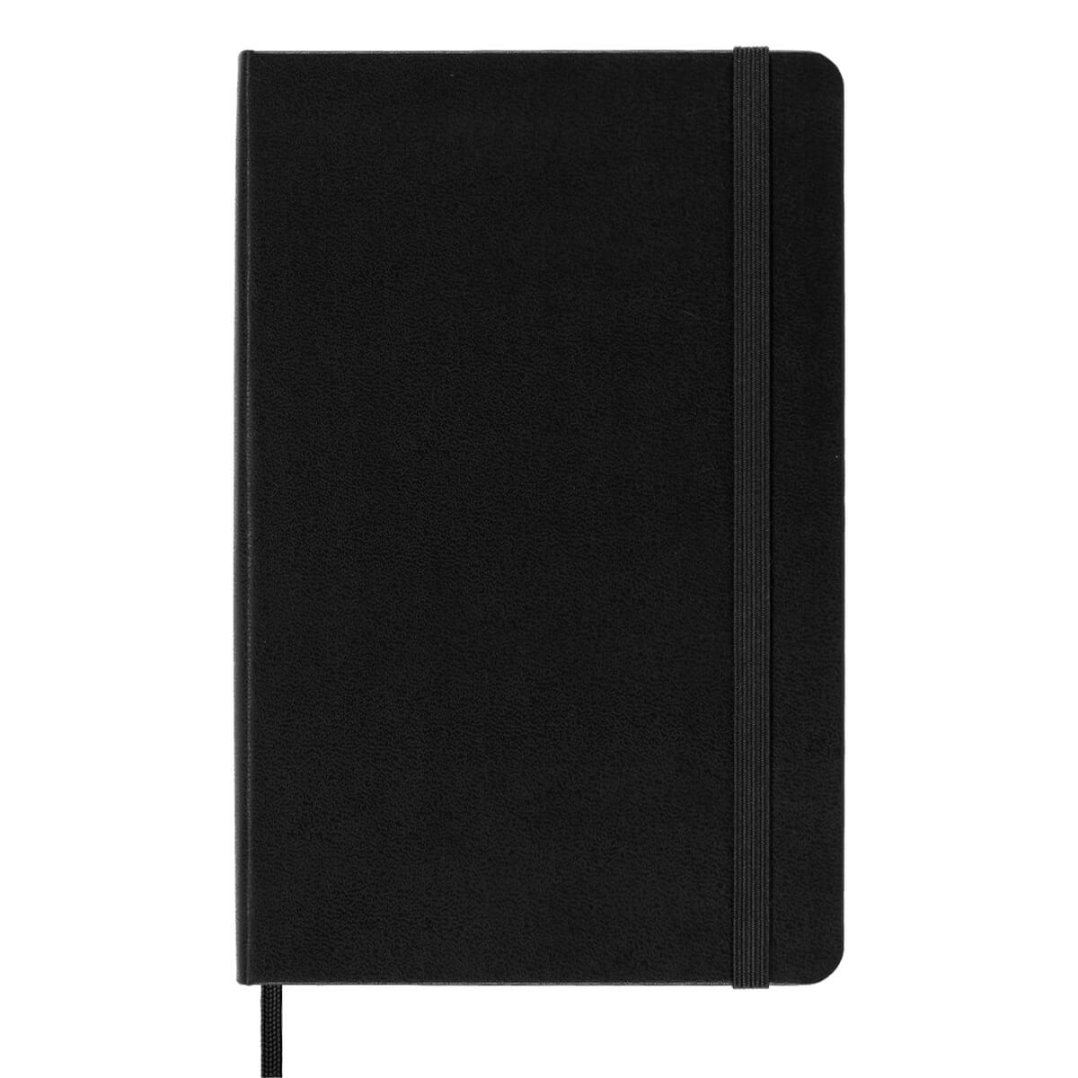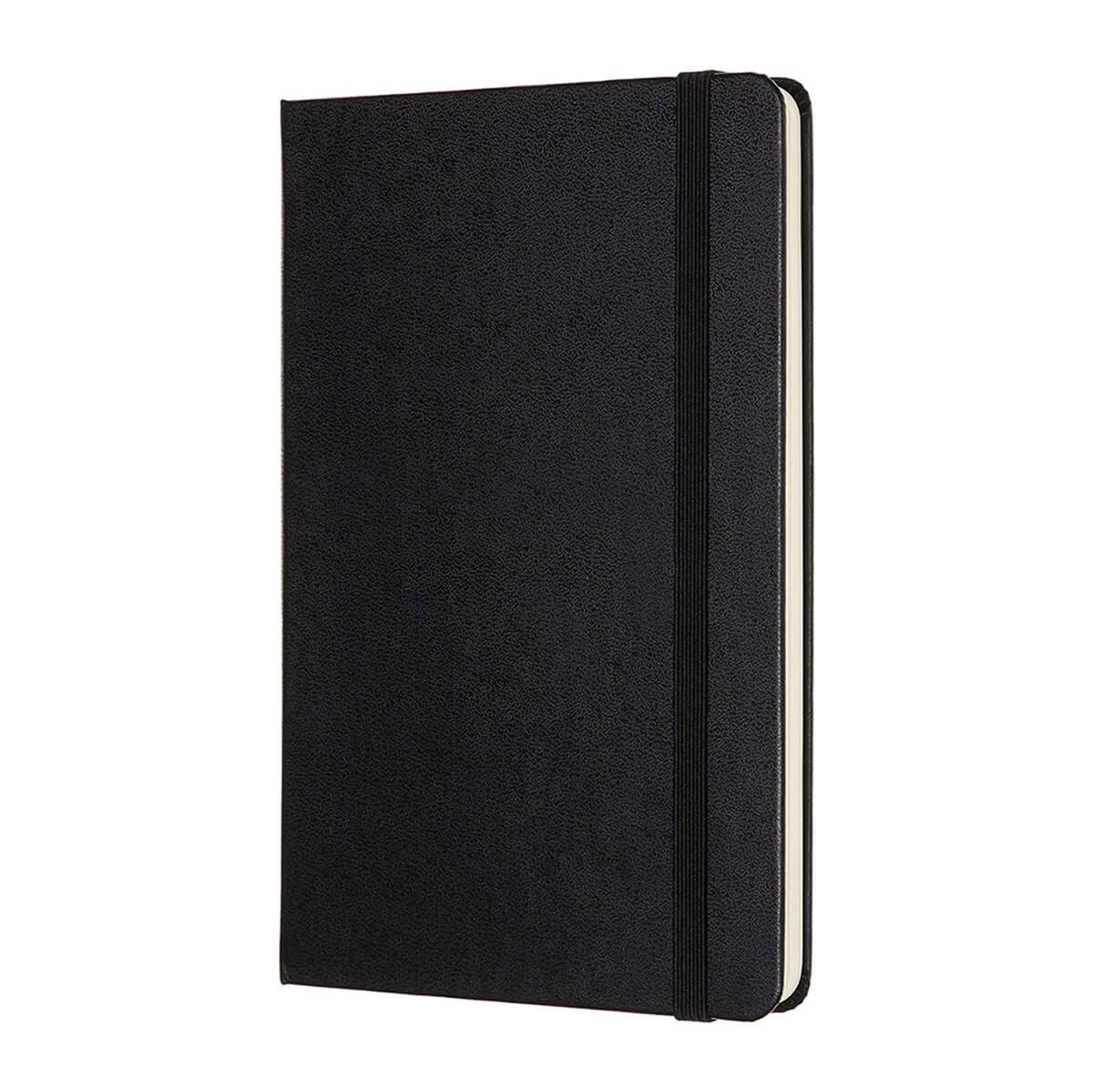 Medium Ruled Hardcover Notebook in black by Moleskine. This classic Moleskine notebook has rounded corners and an elastic closure. Featuring 208 ivory-coloured acid-free 70gsm pages, thread bound, and an expandable inner pocket made of cardboard and cloth. Includes a ribbon bookmark, an 'in case of loss' notice, and a removable leaflet with the history of Moleskine.