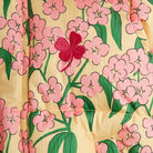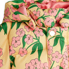 Alpine Flowers AOP Hooded Puffer Jacket by Mini Rodini. Yellow water repellent and windproof puffer jacket with a removable hood, a flower design and embroidered clover.