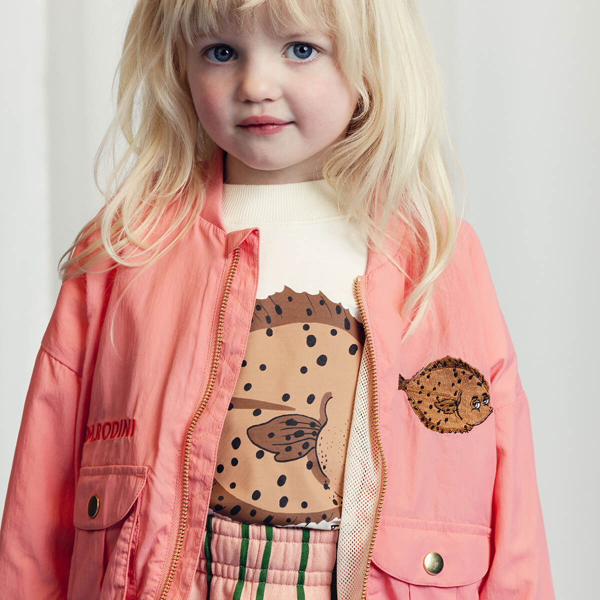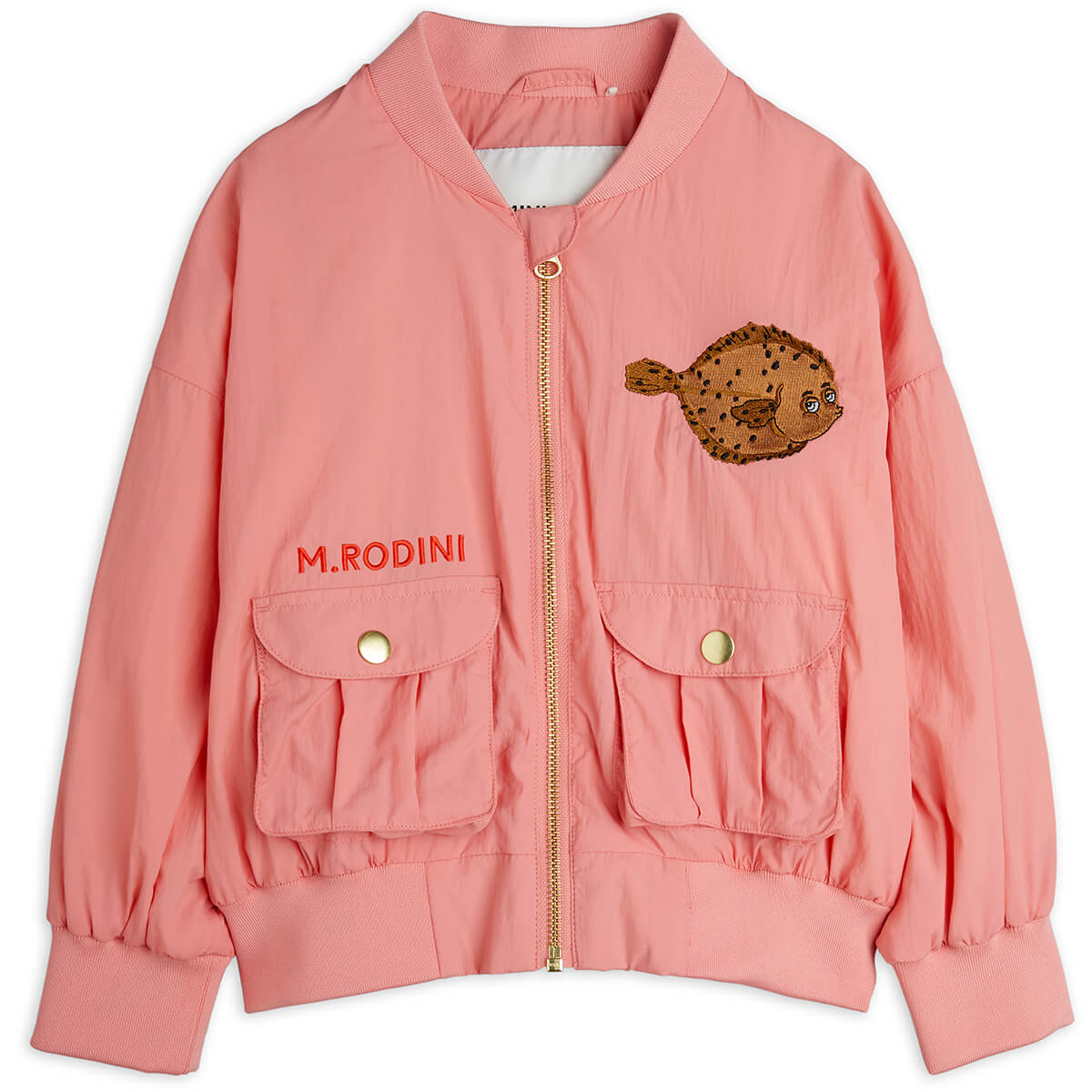 Flundra Baseball Jacket by Mini Rodini. Baseball jacket with a flounder fish embroidery and functional pockets. Metal zipper and fold over at the top to protect the chin from pinching.