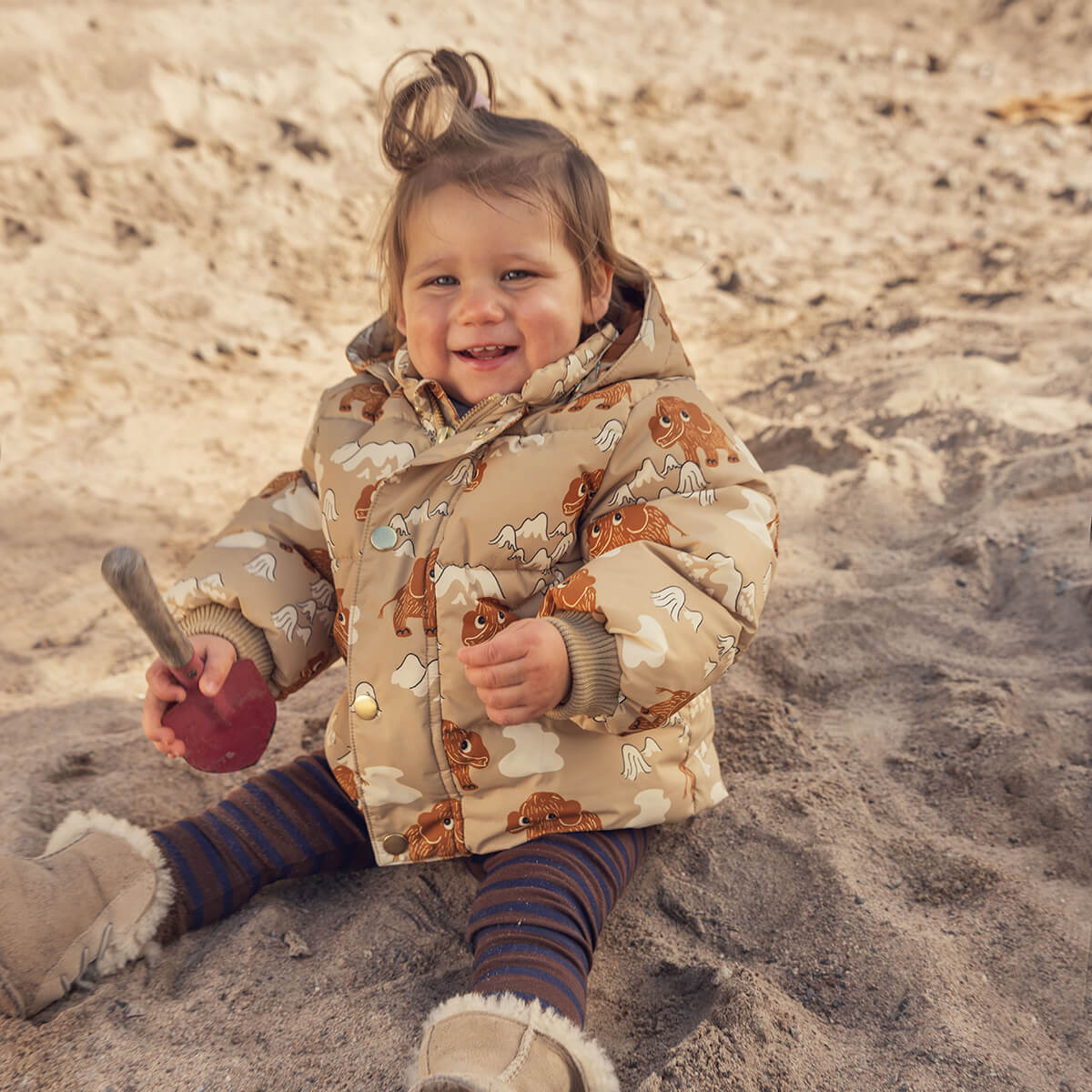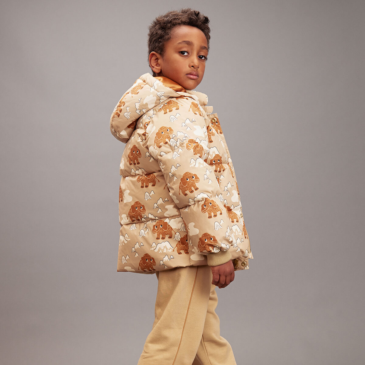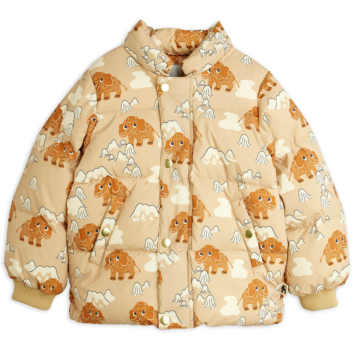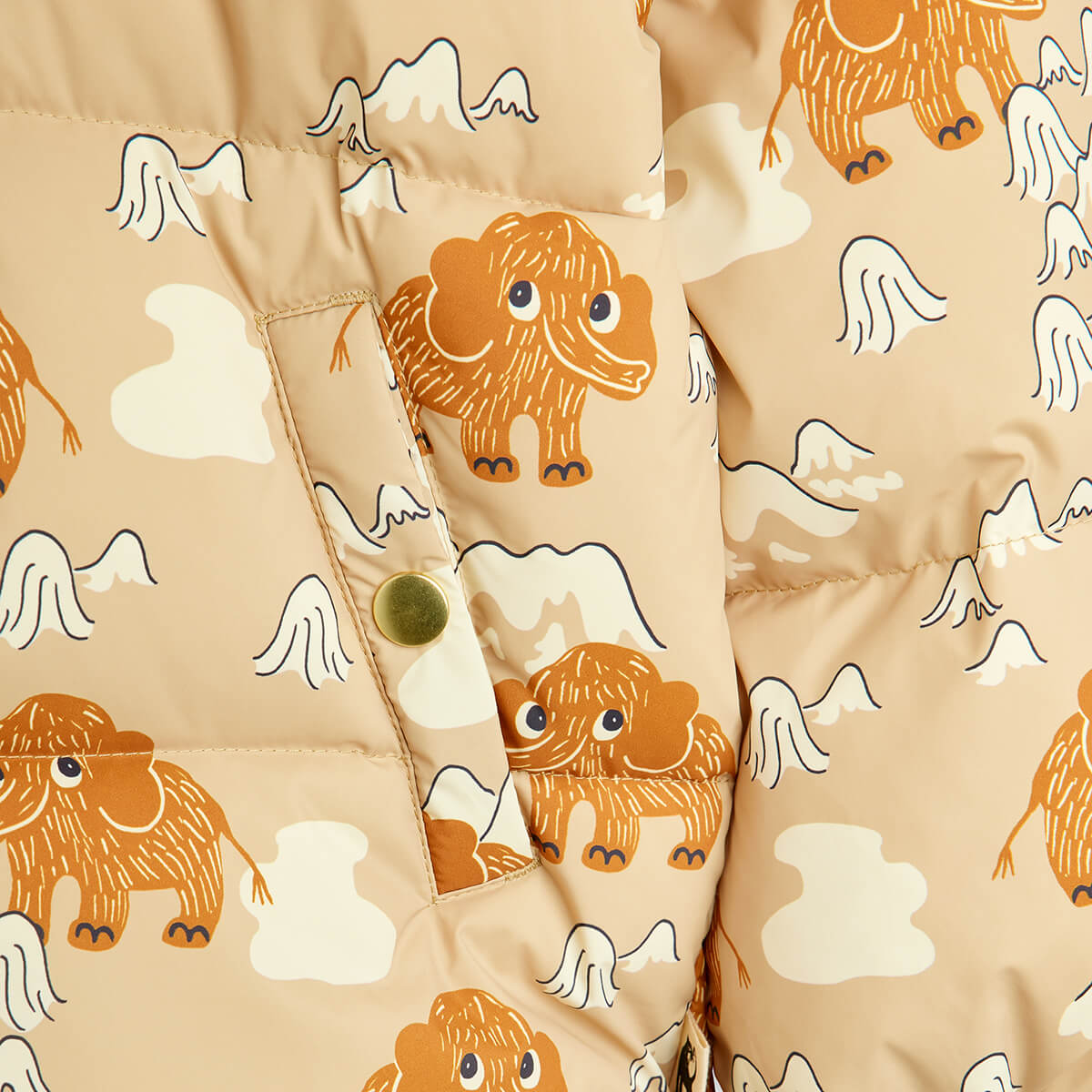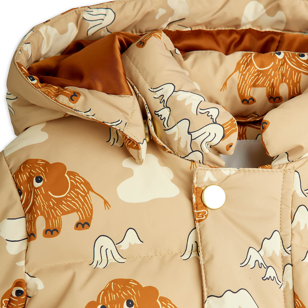 Mammoths AOP Hooded Puffer Jacket by Mini Rodini. Beige water repellent and windproof puffer jacket with a removable hood and a Mammoth design.