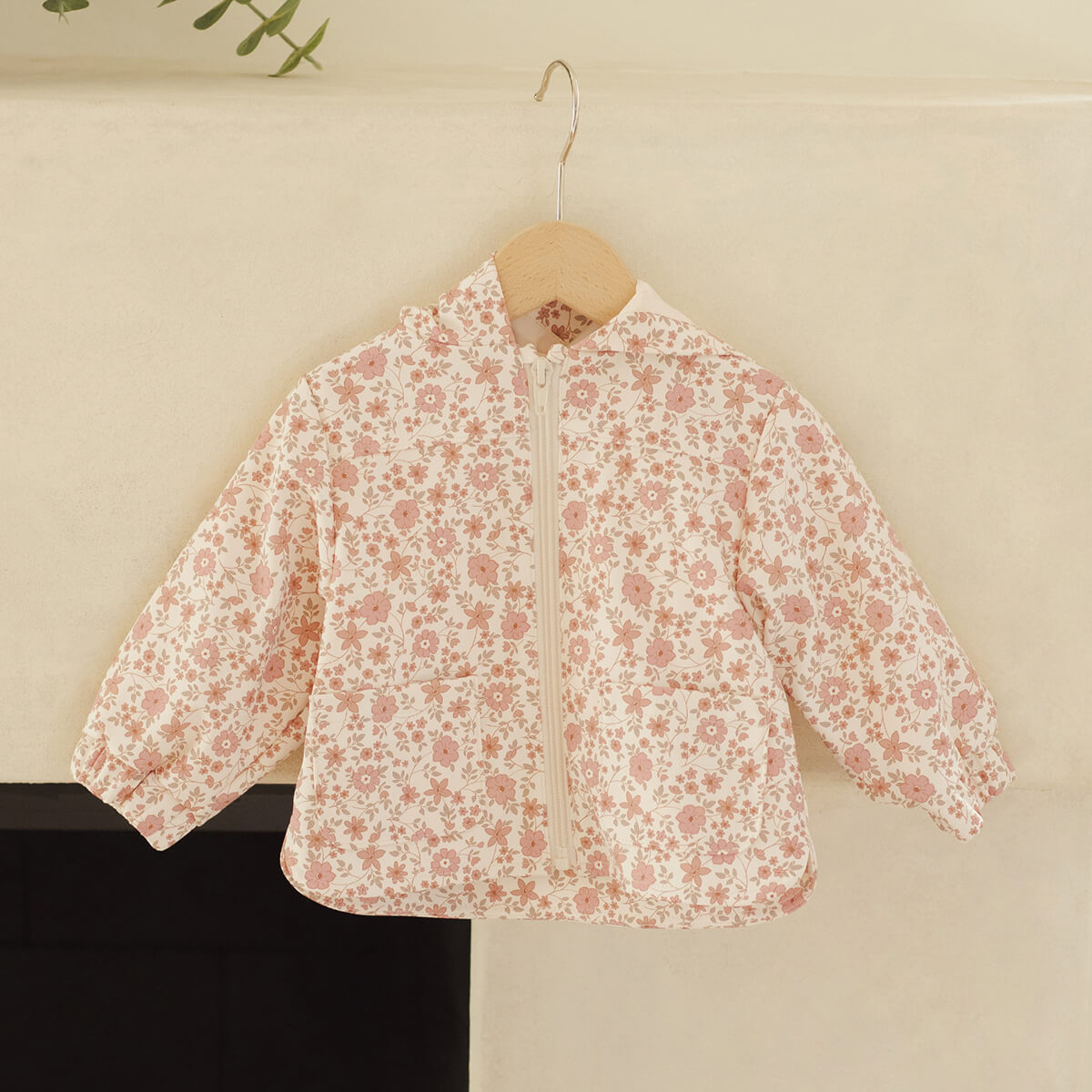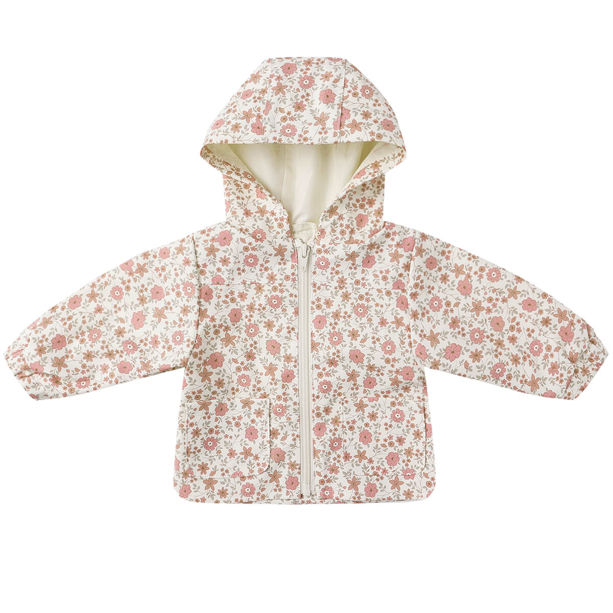Rain Coat by Quincy Mae. The perfect rainy day addition to your little ones autumn winter wardrobe. The rain coat in bloom keeps your little one dry and comfortable with thoughtful details like front slit pockets, an airflow flap across the chest, and gathered elastic cuffs at the wrists.