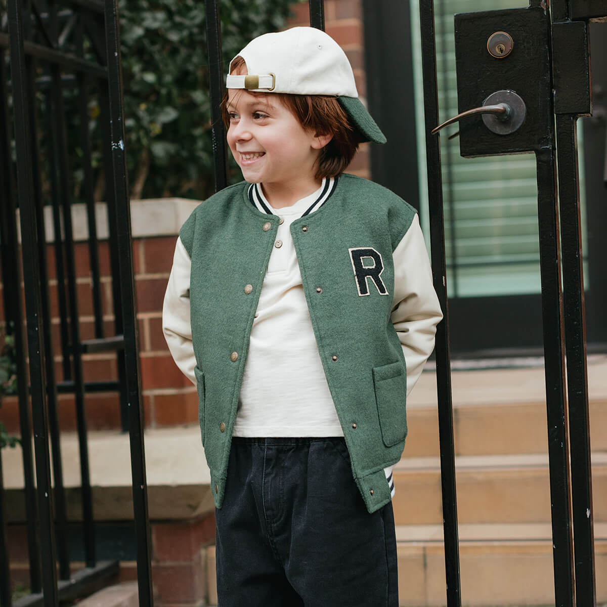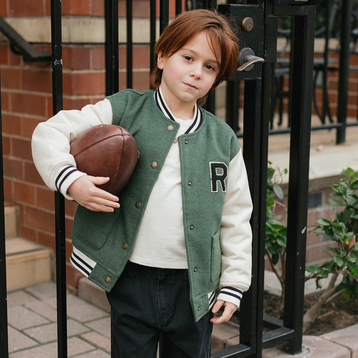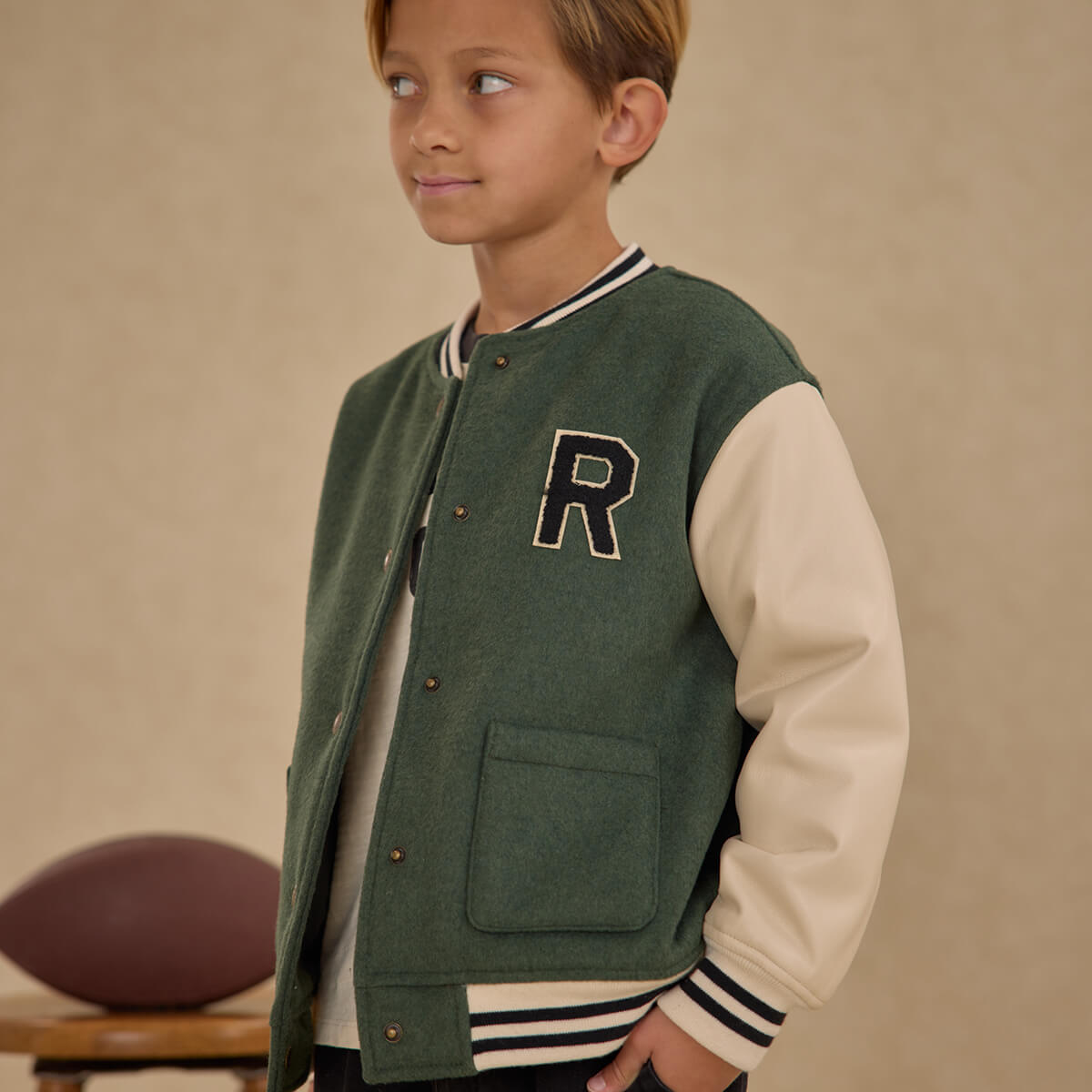 Varsity Jacket by Rylee & Cru. This green varsity jacket brings all the vintage prep vibes, with striped ribbing at the cuffs and hem, coated metal snaps, side pockets, and a soft cotton lining - this style is sure to hit a home run.