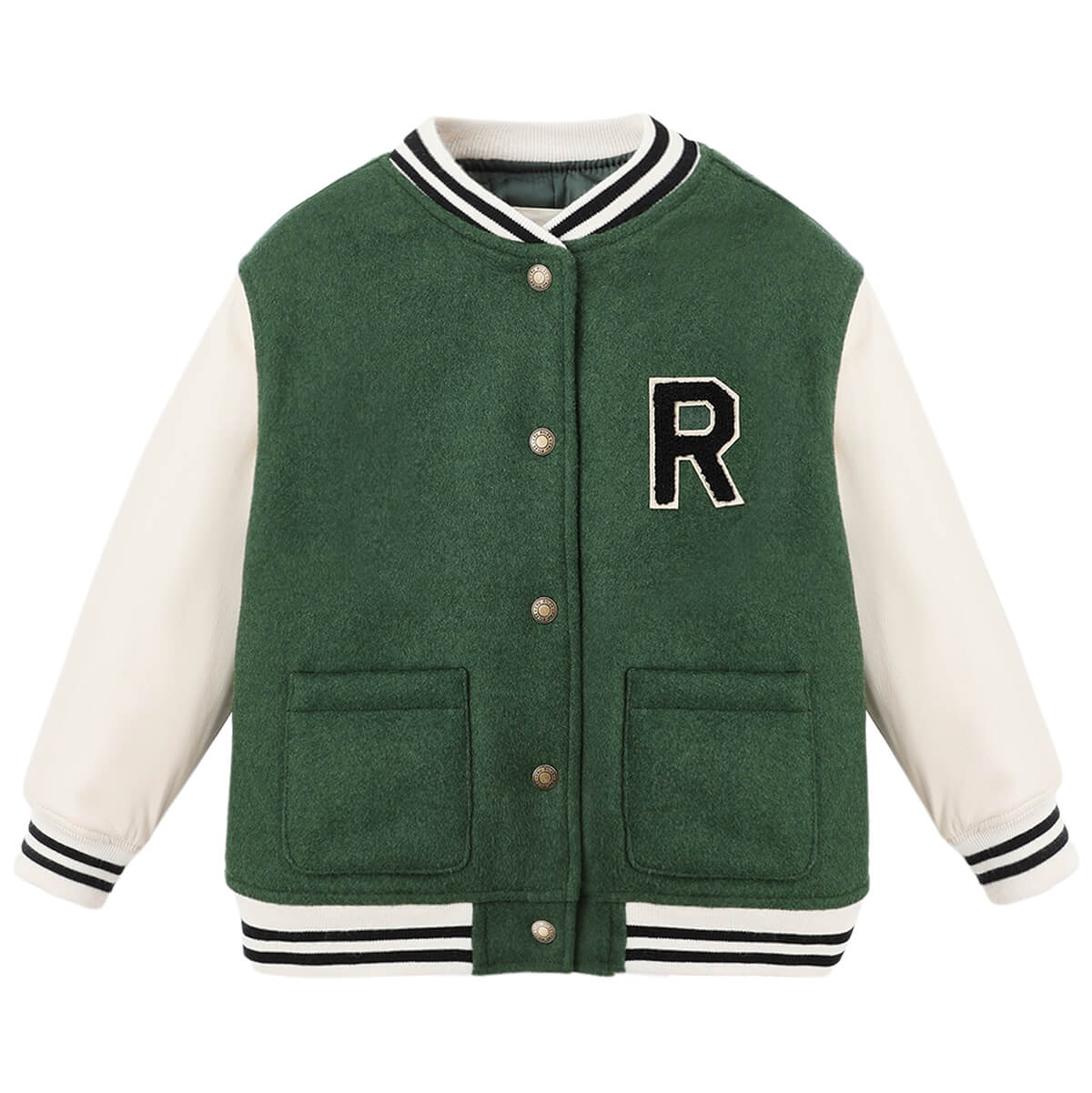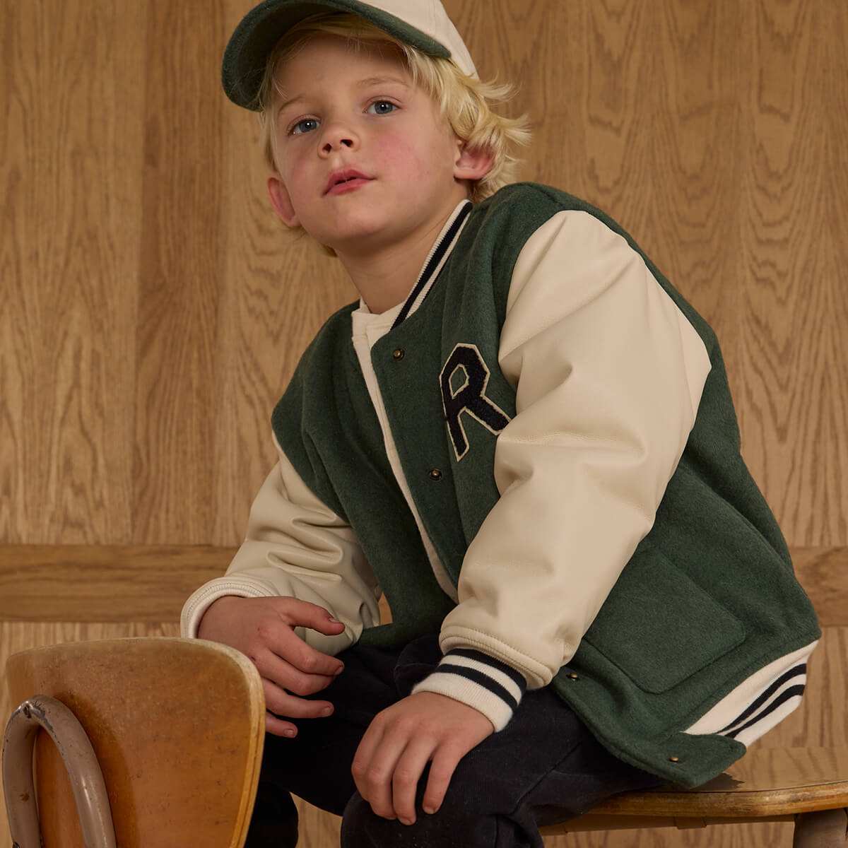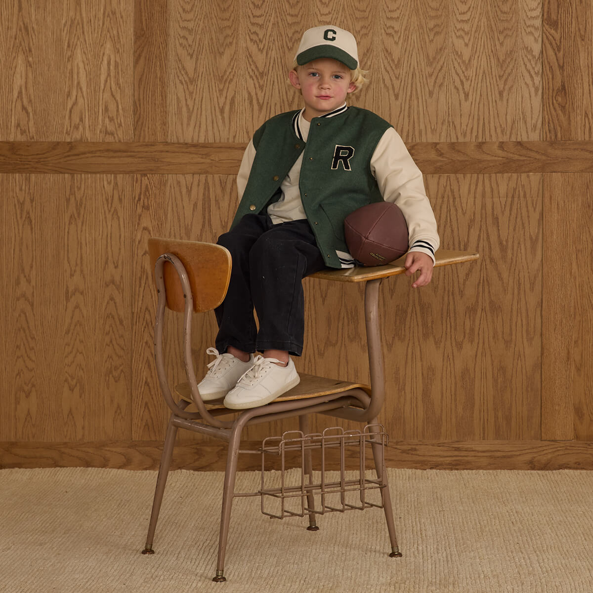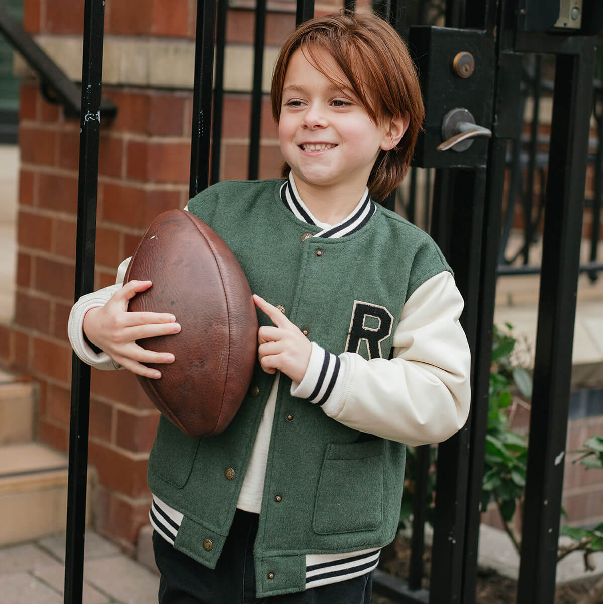 Varsity Jacket by Rylee & Cru. This green varsity jacket brings all the vintage prep vibes, with striped ribbing at the cuffs and hem, coated metal snaps, side pockets, and a soft cotton lining - this style is sure to hit a home run.