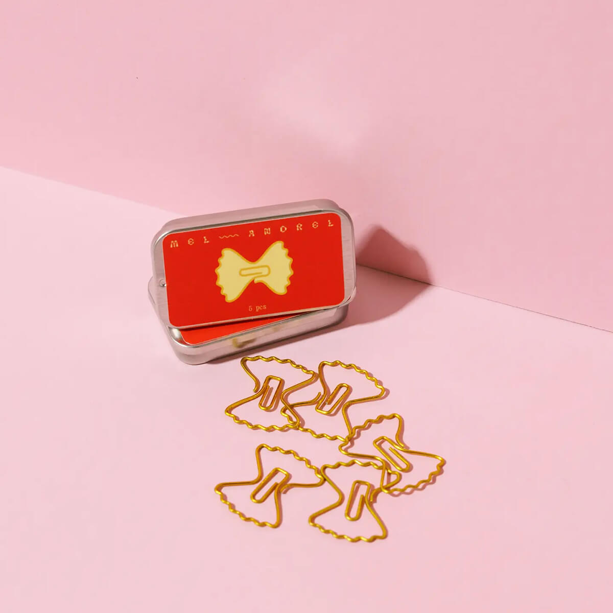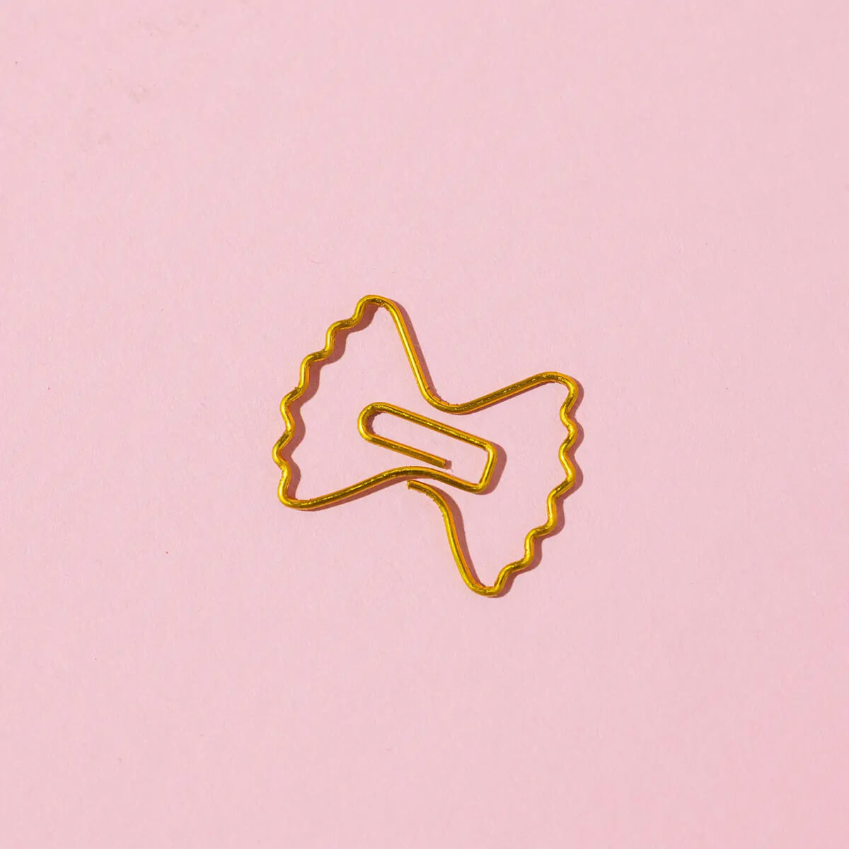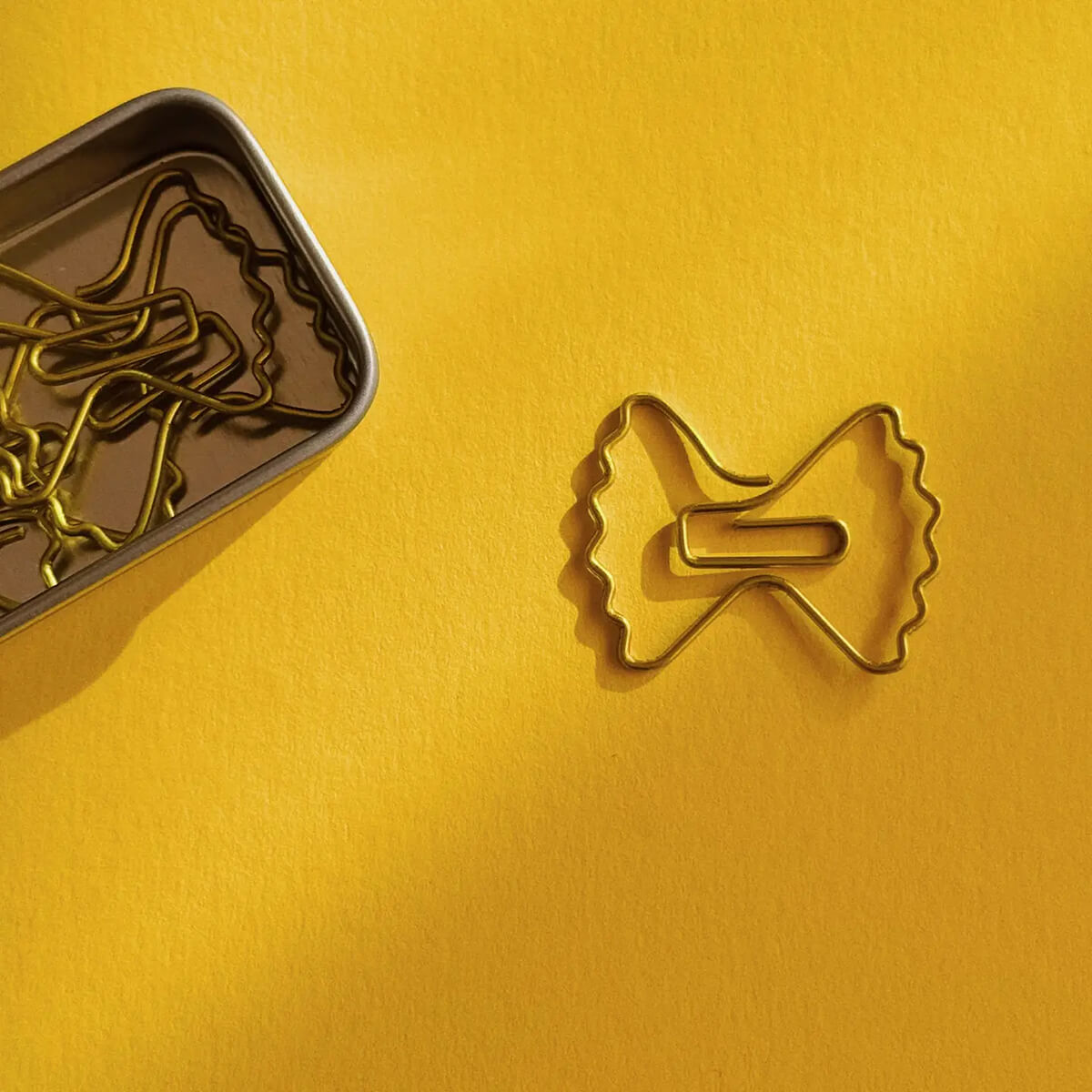 Farfalle Pasta Paper Clips by Mel Andrel. Set of 5 unique and versatile farfalle pasta-shaped gold clips that can be used as paperclips, page holders, or bookmarks.